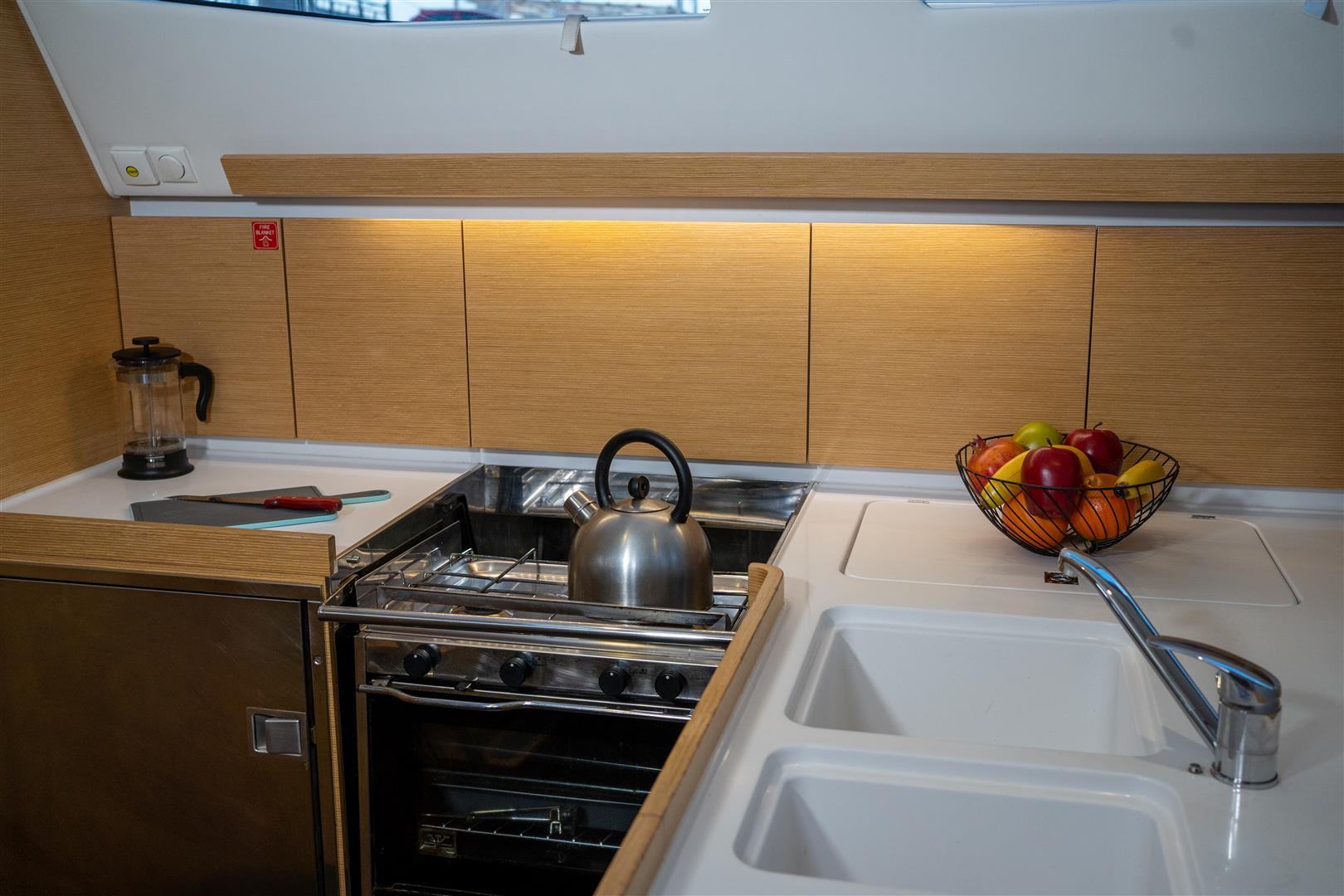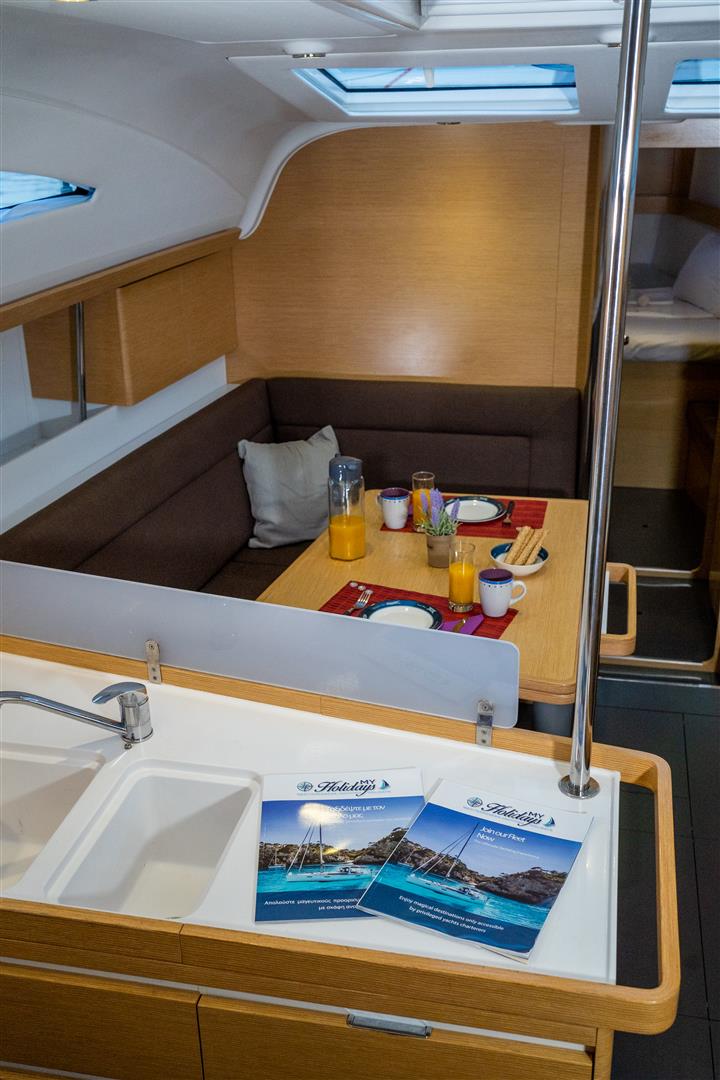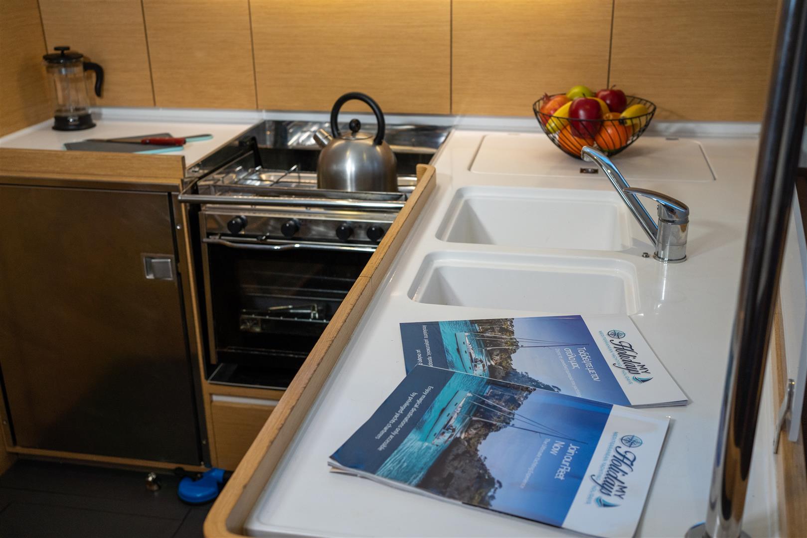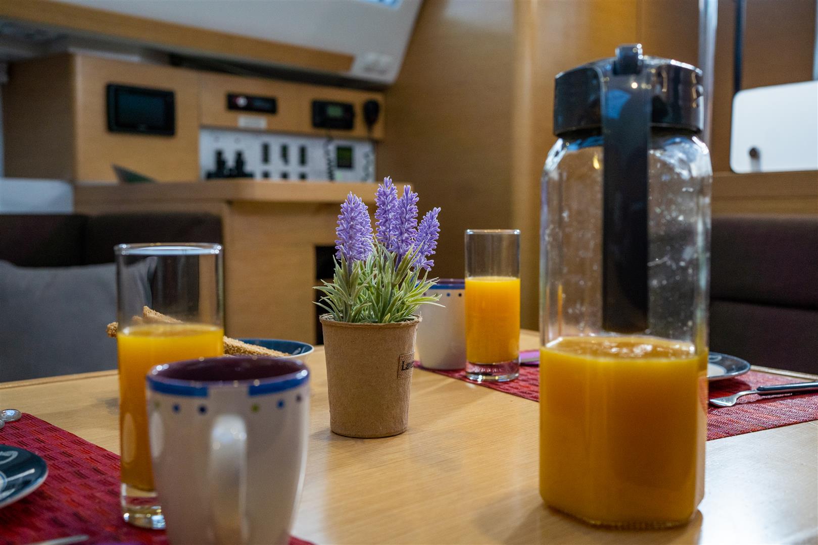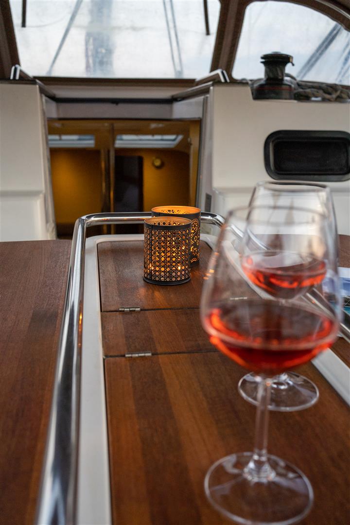 | Safety | Autopilot, Bootsmannstuhl, Bordapotheke, Bugstrahlruder, elektr. Bilgepumpe, Epirb, Feststoffschwimmwesten, Feueraxt, Feuerlöscher, Notpinne, Notsignale, Radarreflektor, Reparaturset für Beiboot, Rettungsinsel, Rettungskragen, Sicherheitsgurt, Suchscheinwerfer, UKW-Funk |