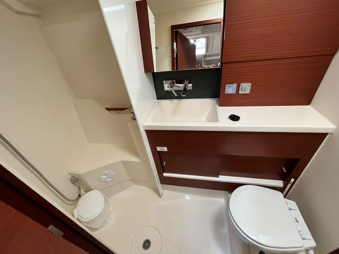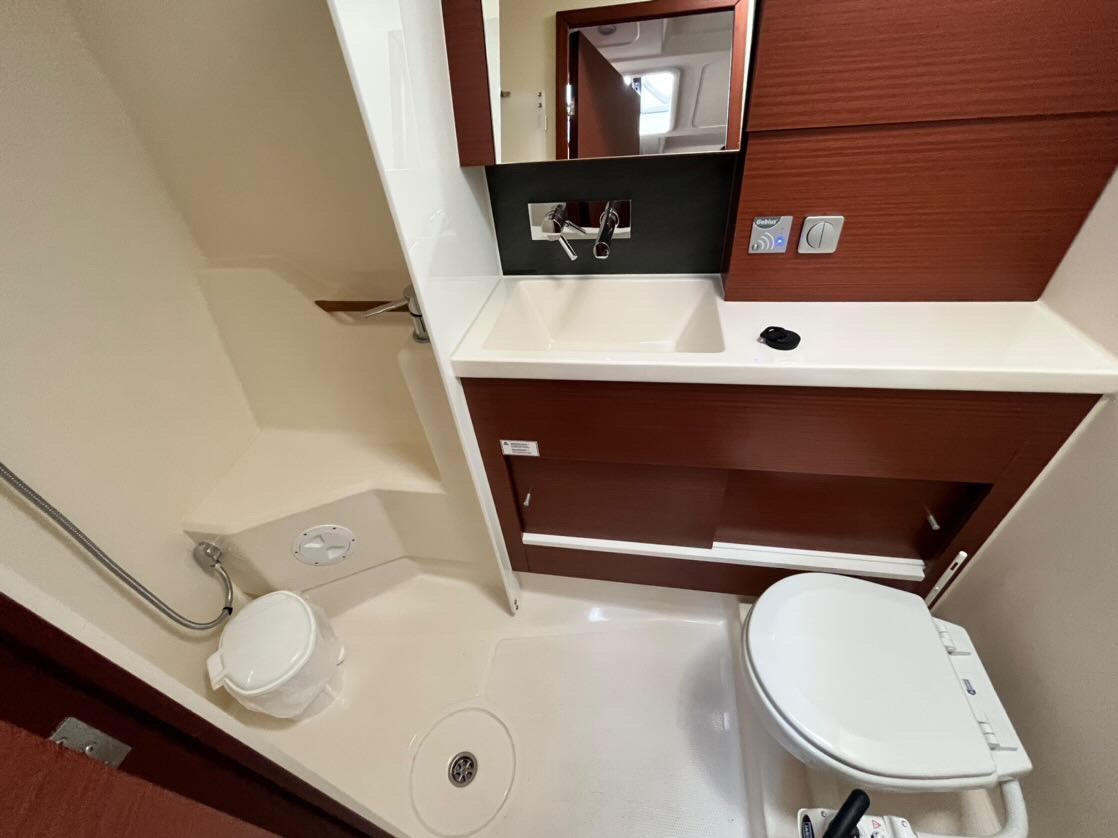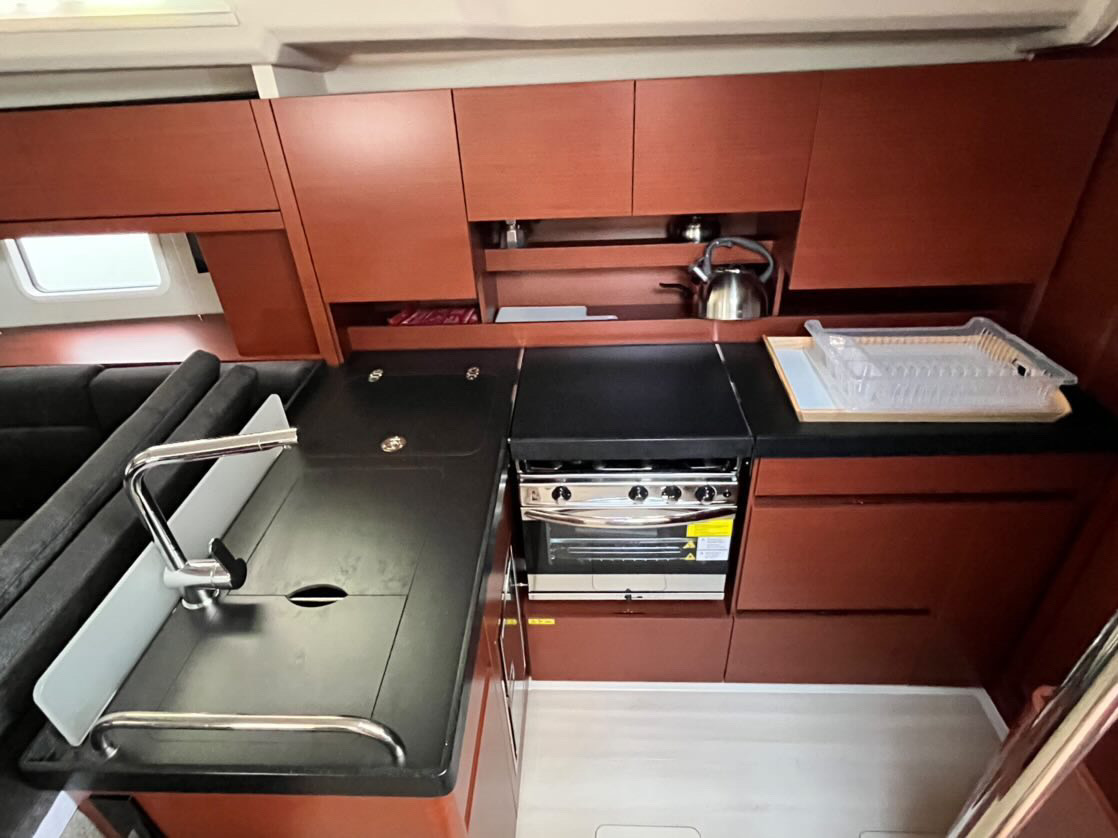 | Outside | 12 V-Anschluss, 220 V-Landanschluss, Anker mit Kette, Badeleiter, Badeplattform, Biminitop, Cockpitdusche, Cockpitkühlschrank, Cockpitlautsprecher, Cockpitpolster, Cockpittisch, elektr. Ankerwinsch, Fender, Festmacherleinen, Grill, Schnorchelausrüstung, Solaranlage, Sprayhood, Teak im Cockpit, Windex, Winschen |