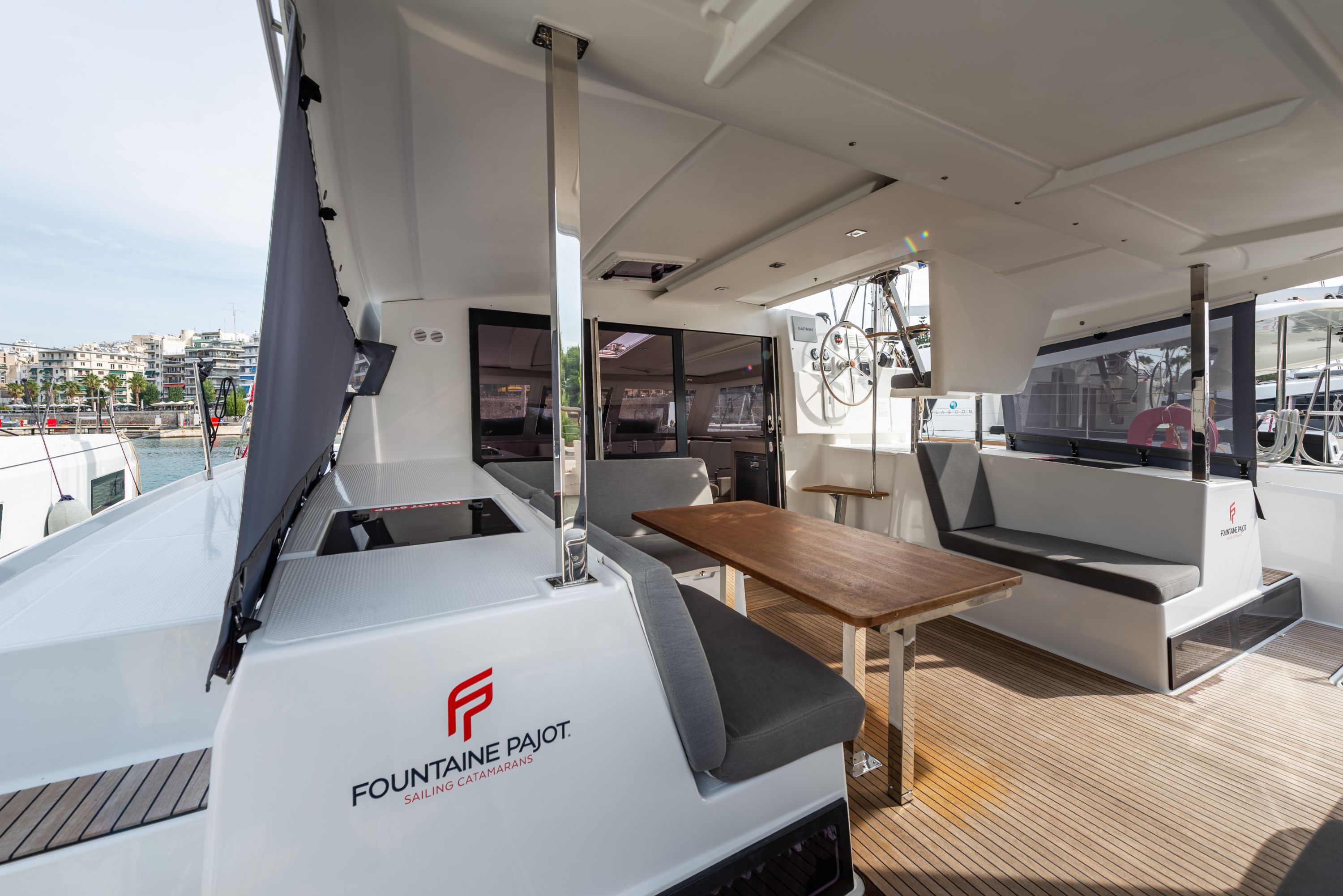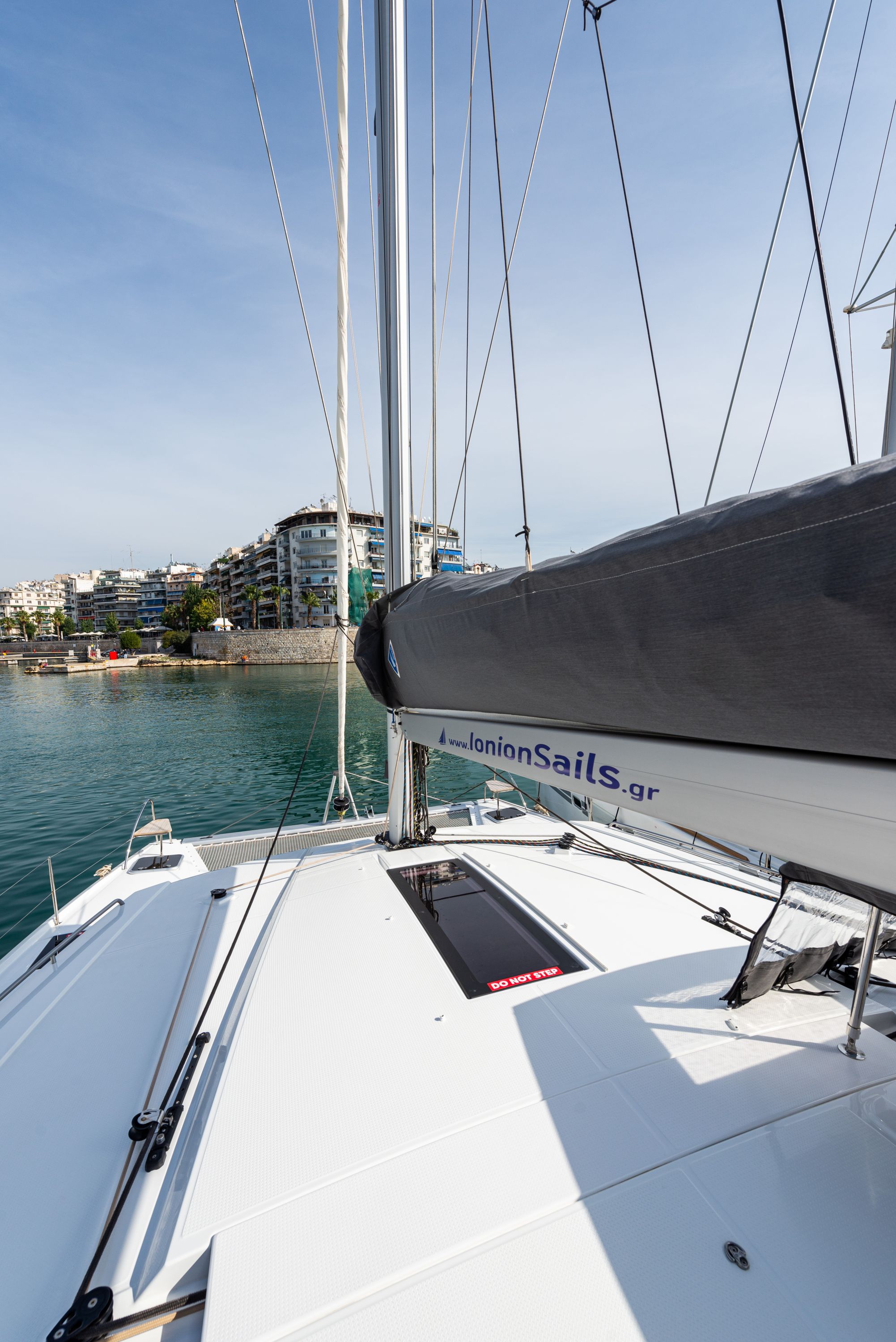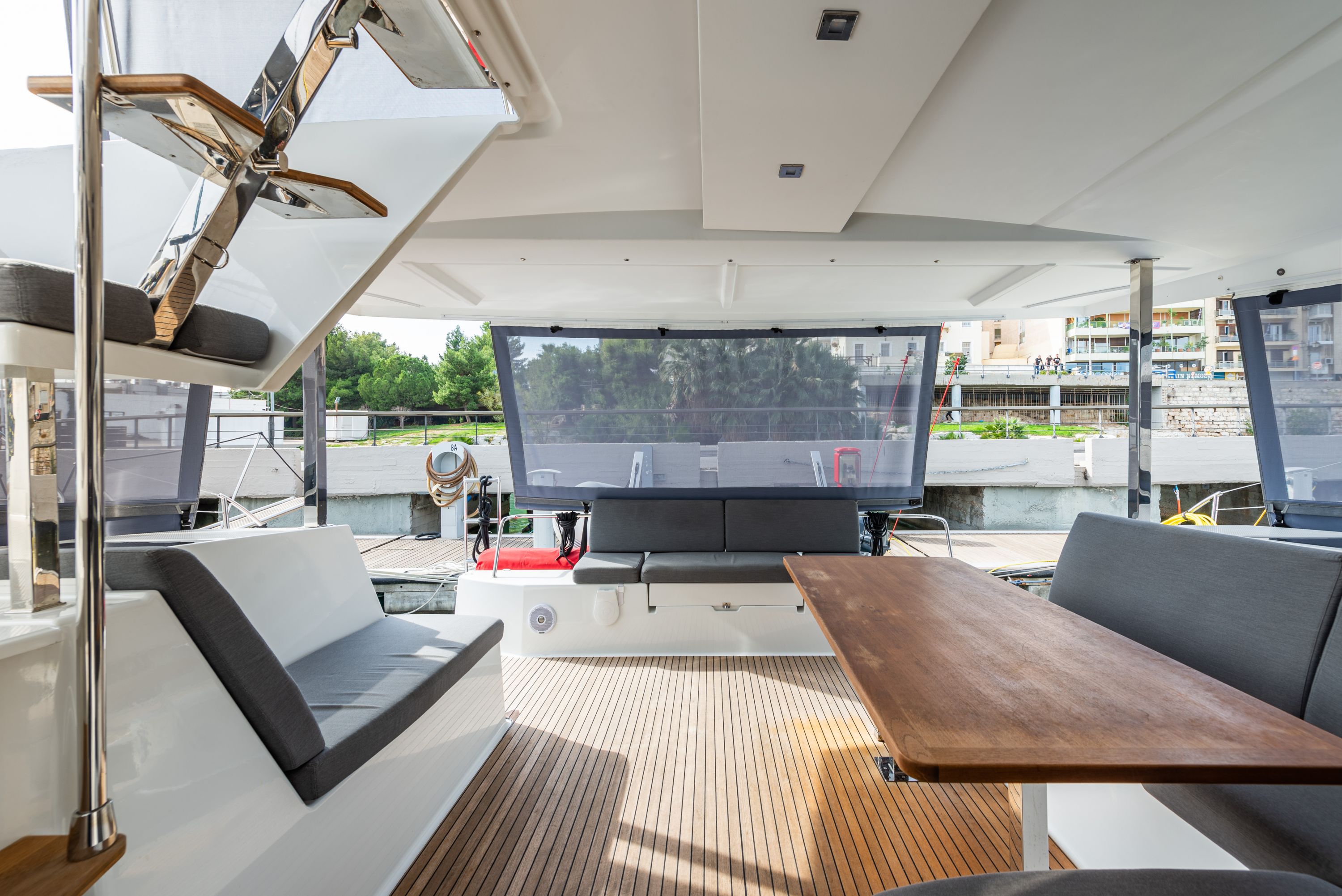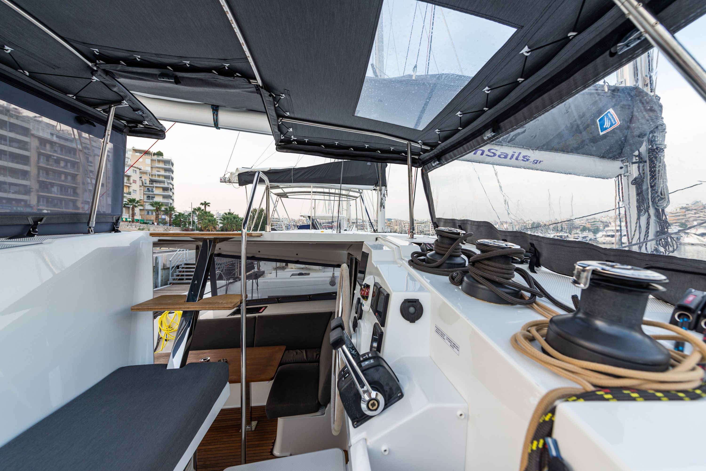 | Outside | Badeleiter, Biminitop, Cockpitdusche, Cockpitpolster, Cockpittisch, Deckpolster, elektr. Ankerwinsch, elektr. Winsch, Schnorchelausrüstung, Segel-Flickwerkzeug, Solaranlage, Sonnendeck, Sprayhood, Teak im Cockpit, Treibanker, Windex |