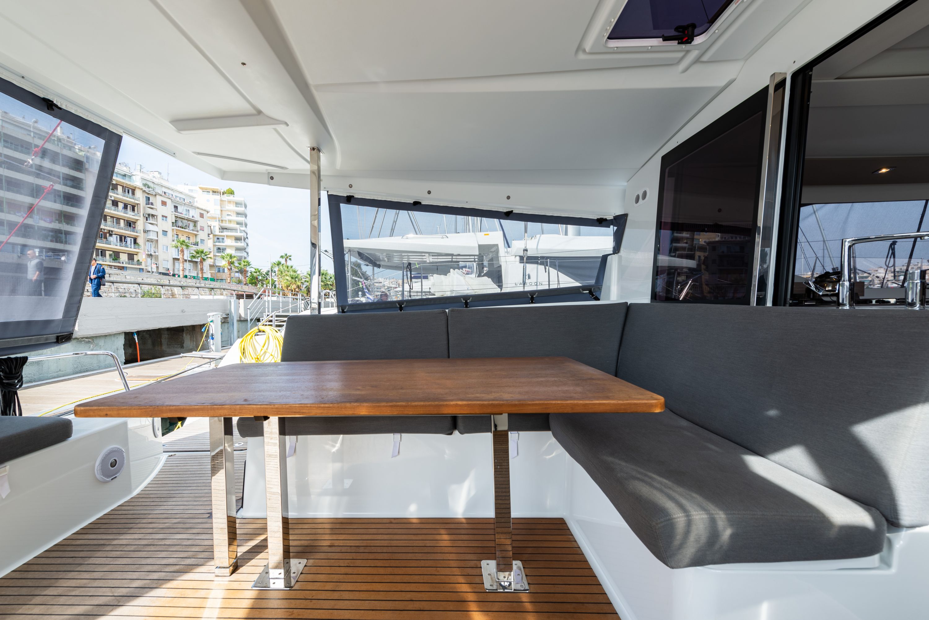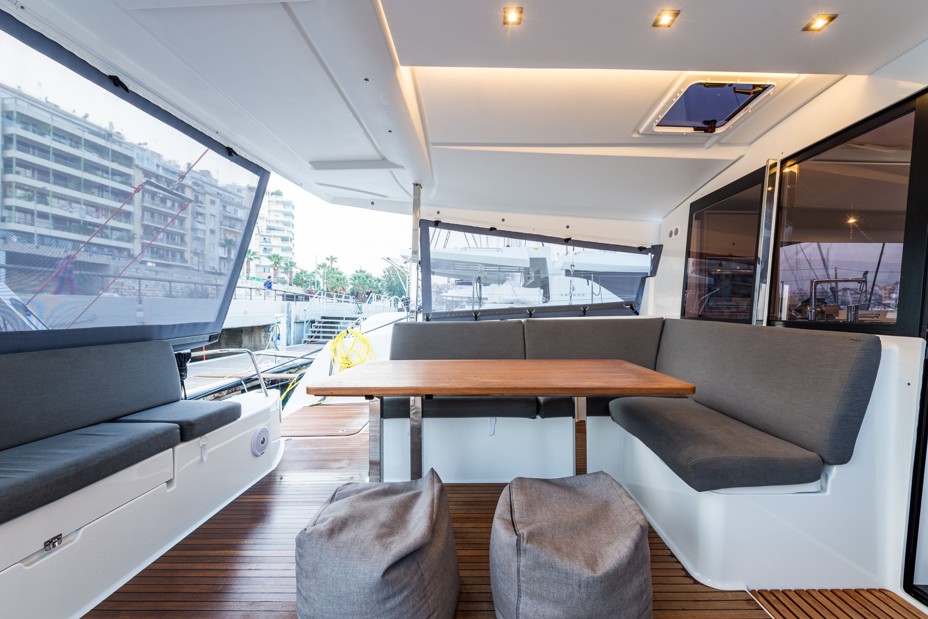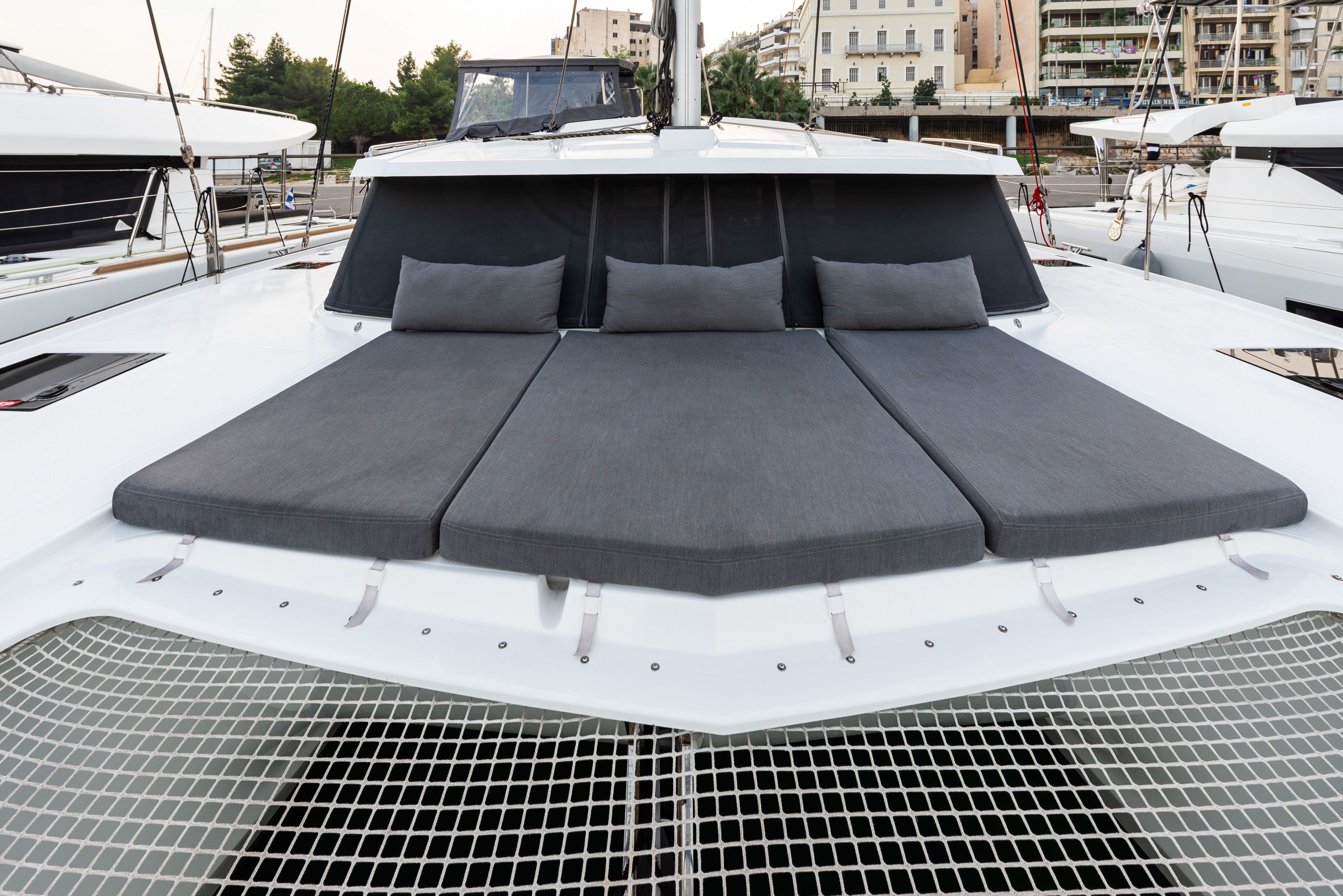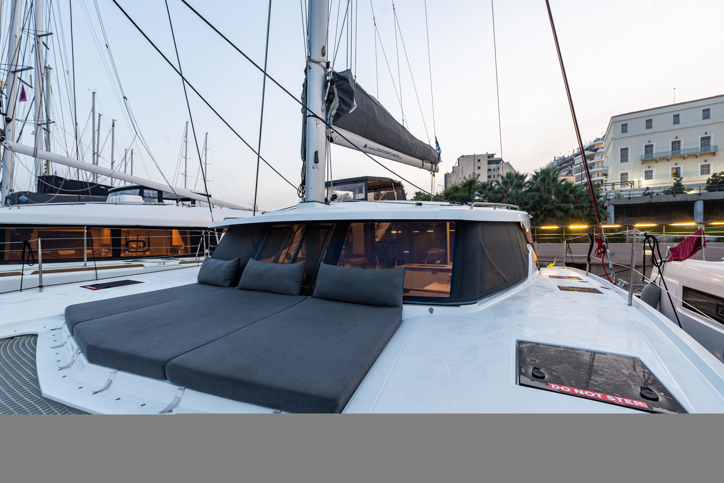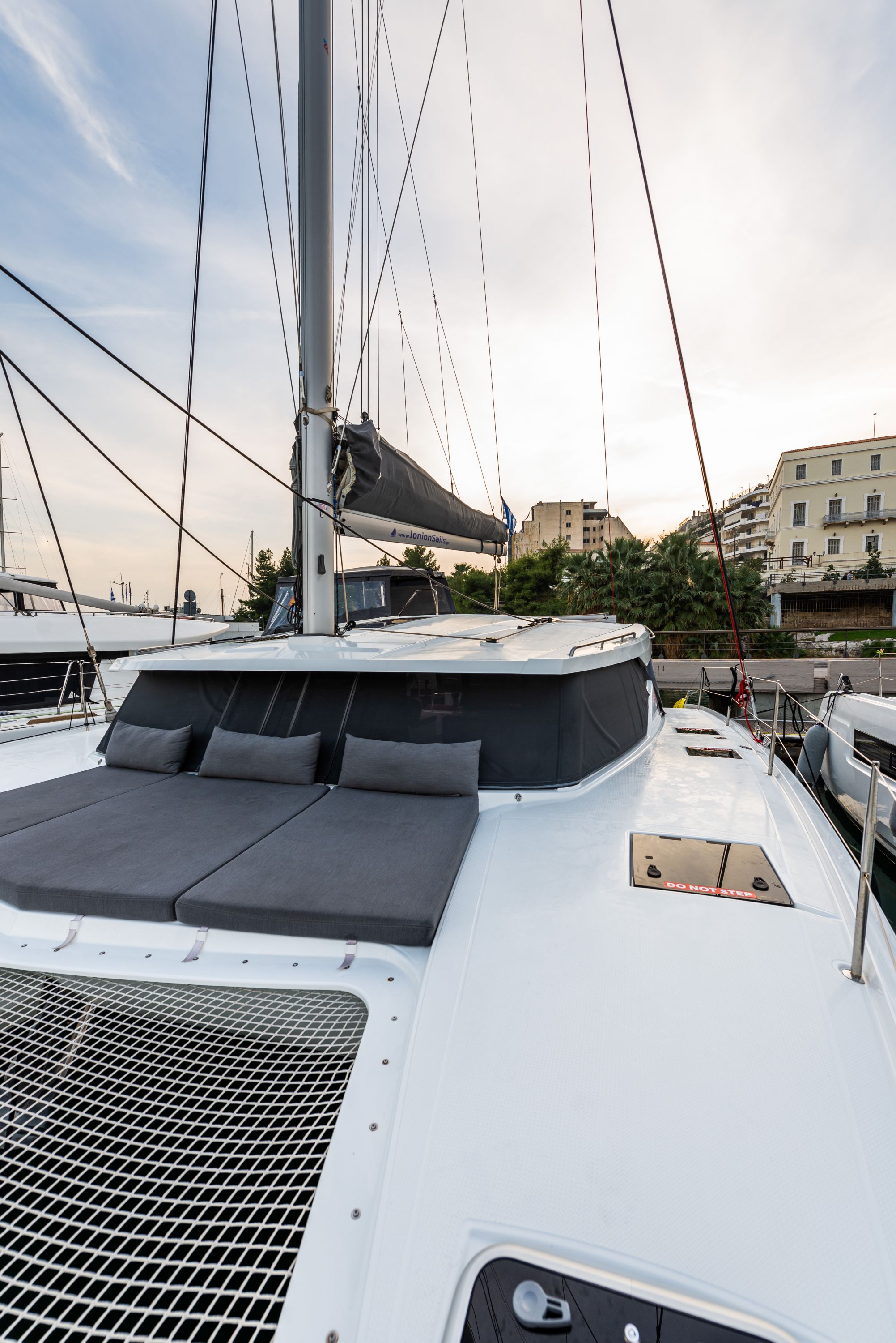 | Outside | Badeleiter, Biminitop, Cockpitdusche, Cockpitpolster, Cockpittisch, Deckpolster, elektr. Ankerwinsch, elektr. Winsch, Schnorchelausrüstung, Segel-Flickwerkzeug, Solaranlage, Sonnendeck, Sprayhood, Teak im Cockpit, Treibanker, Windex |