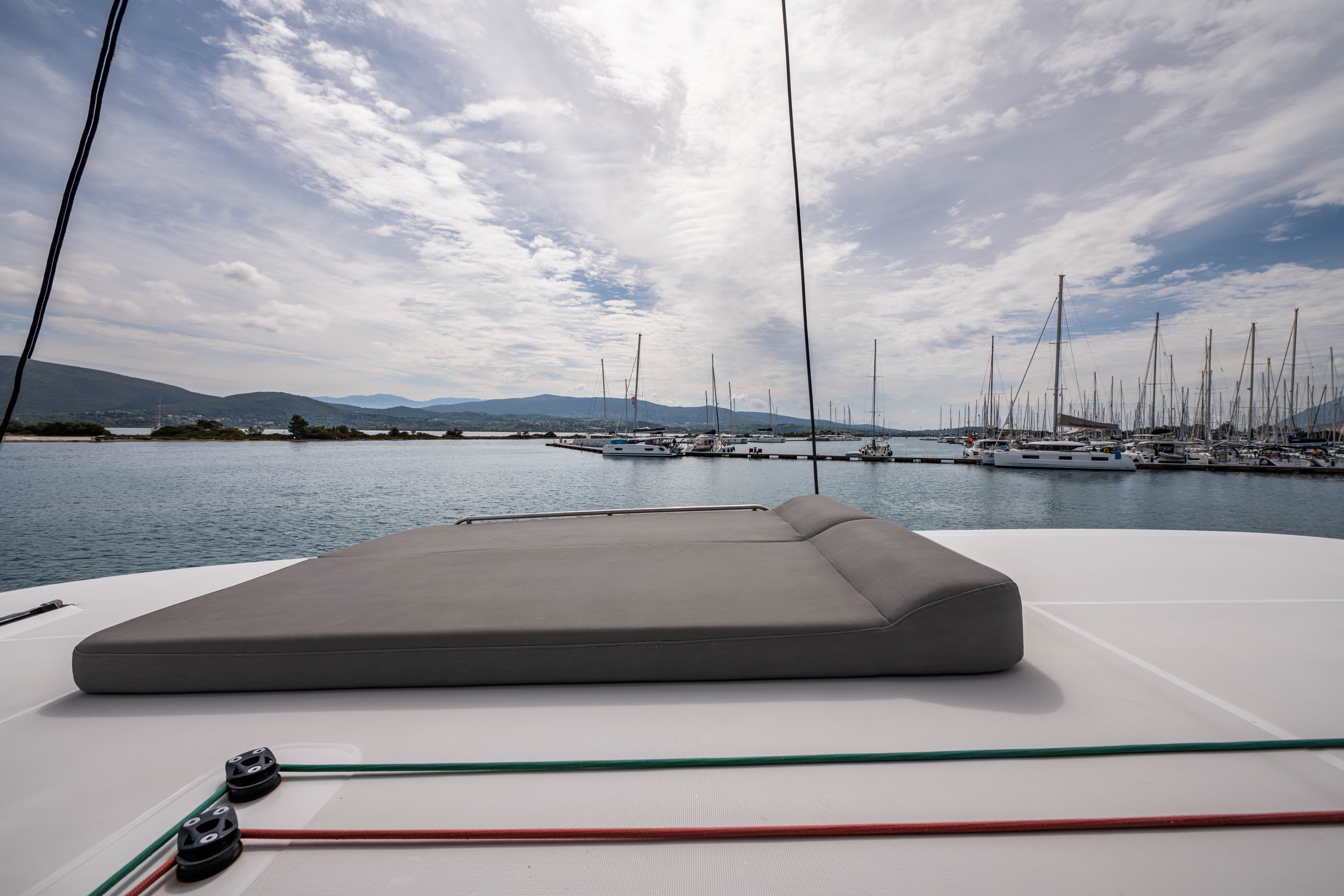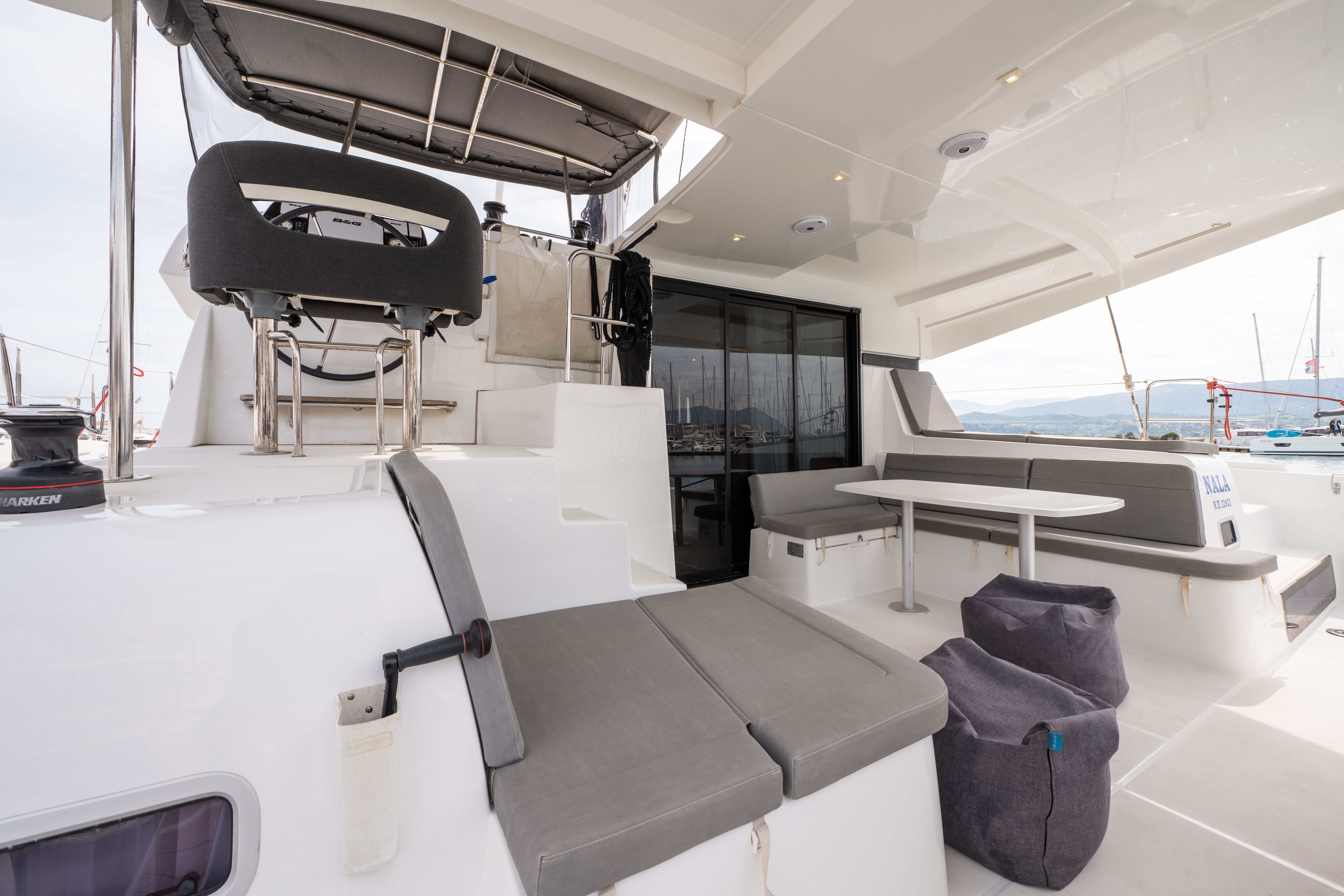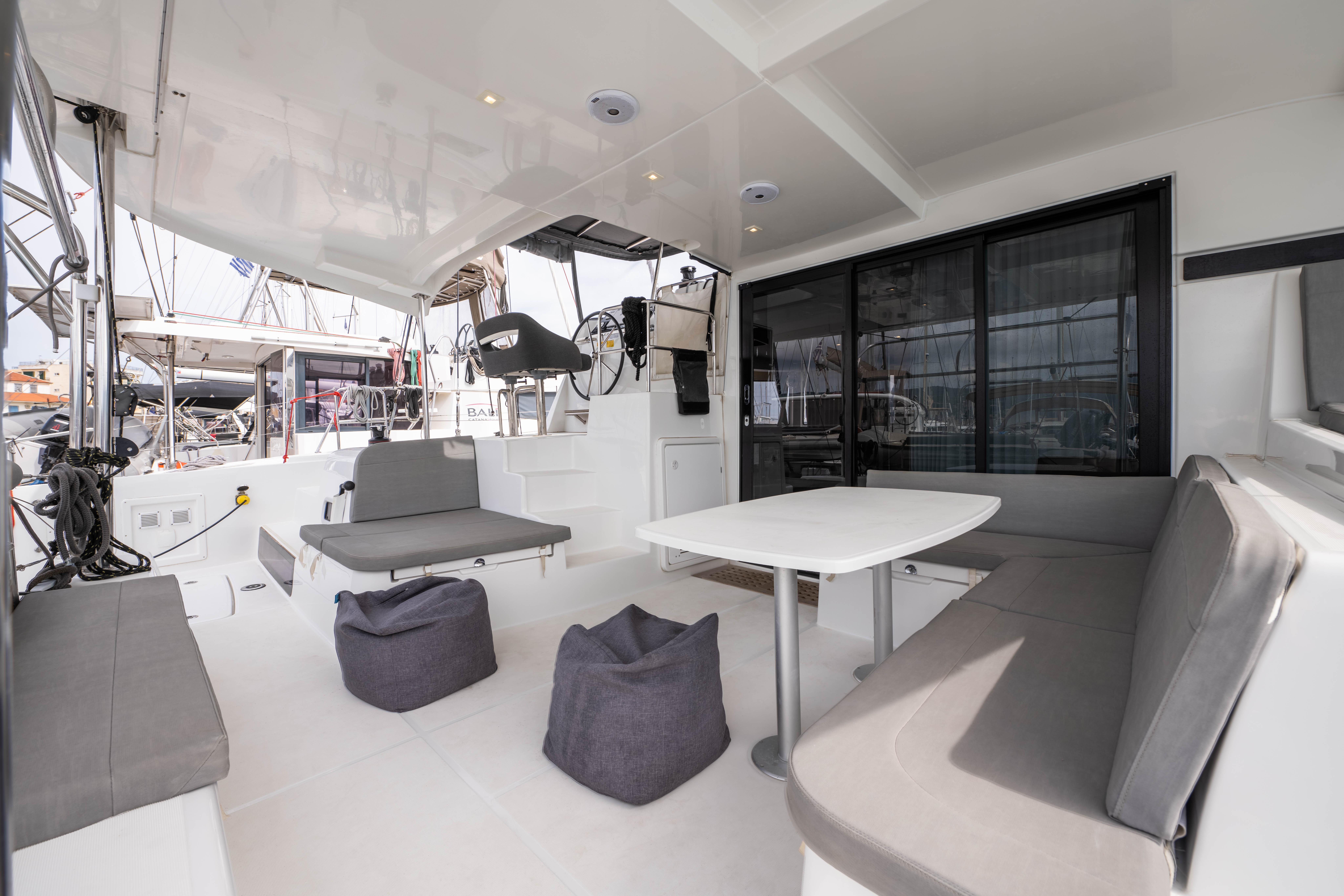 | Outside | Badeleiter, Biminitop, Cockpitdusche, Cockpitlautsprecher, Cockpitpolster, Cockpittisch, Deckpolster, elektr. Ankerwinsch, elektr. Winsch, Segel-Flickwerkzeug, Solaranlage, Sonnendeck, Sprayhood, Treibanker, Windex |