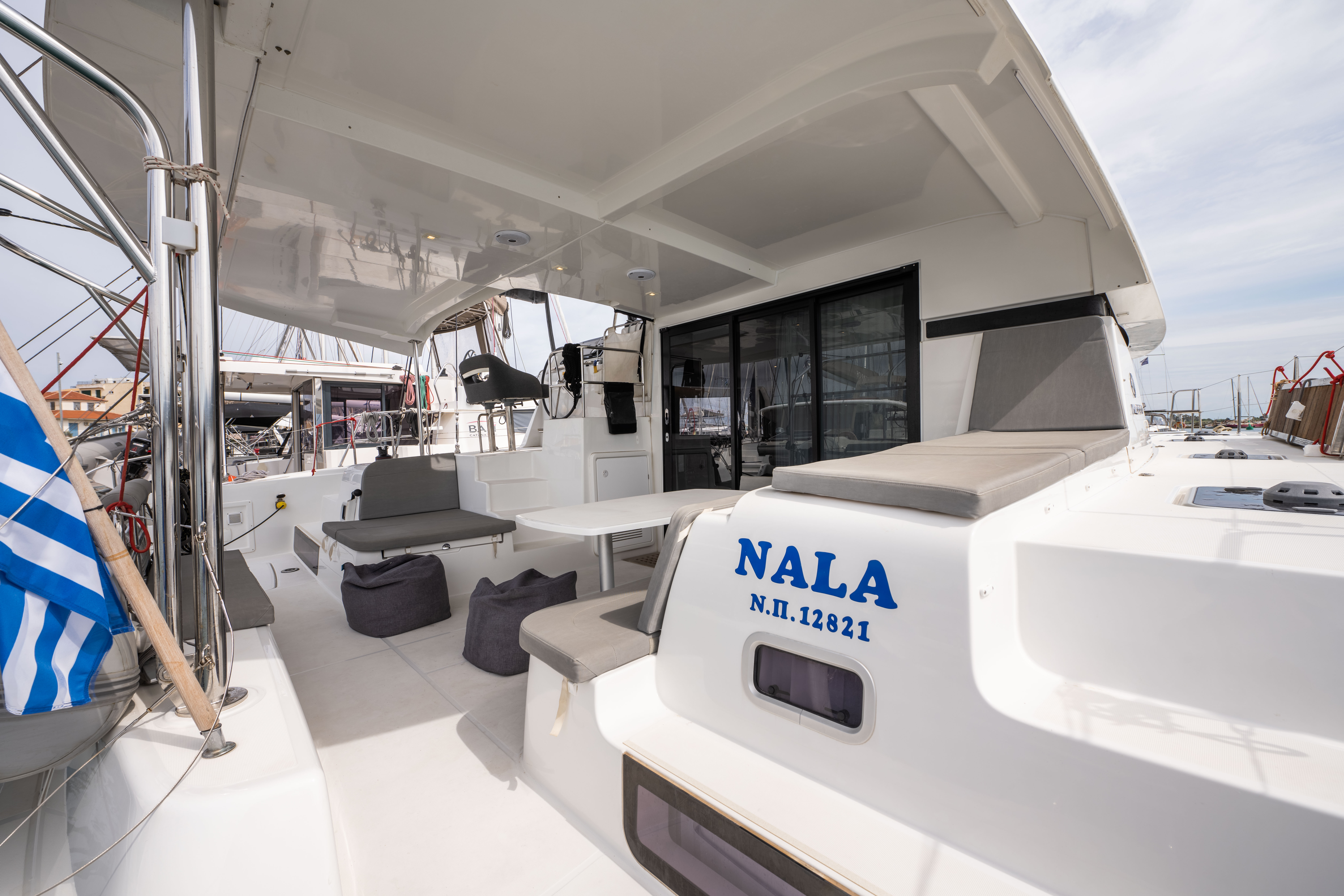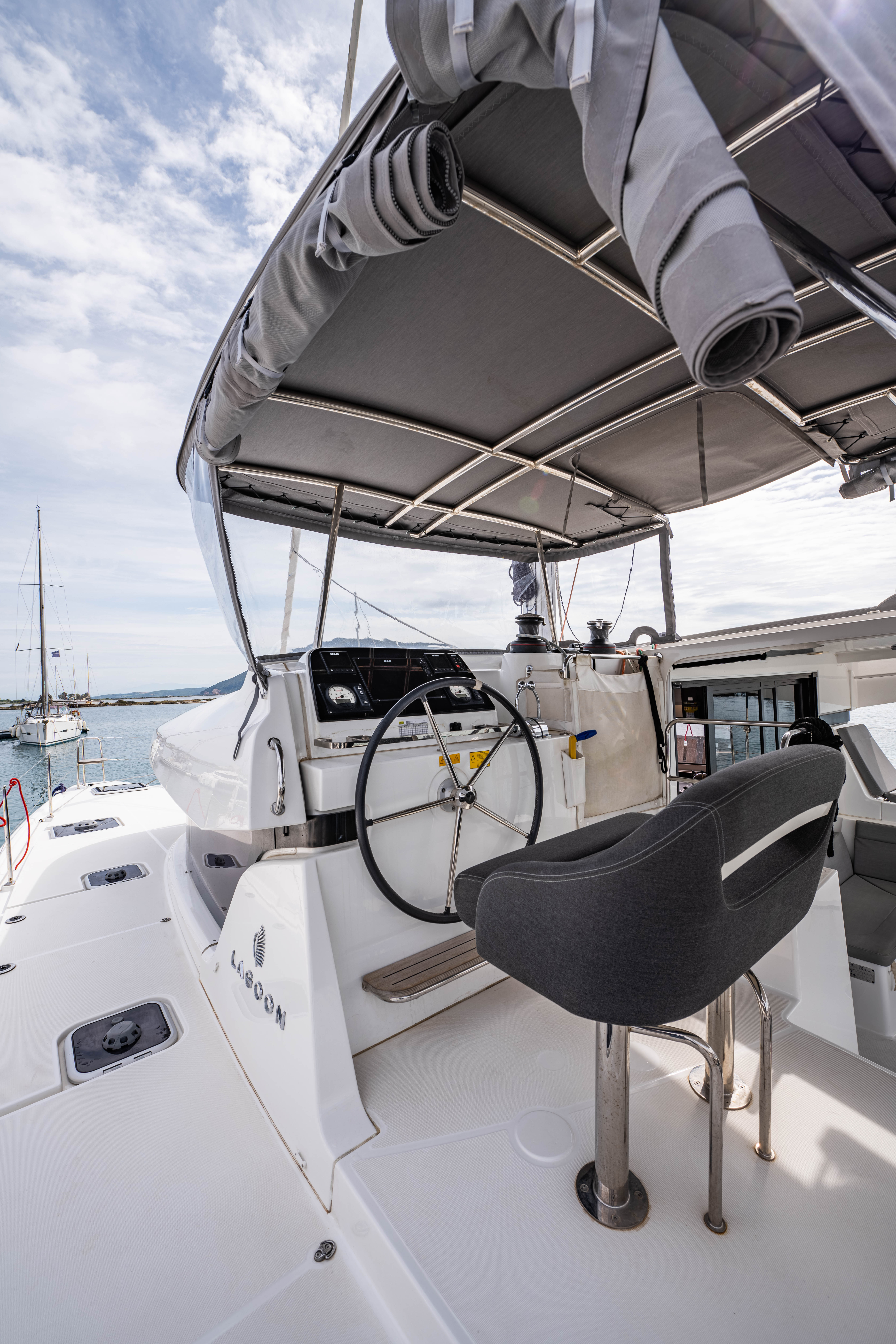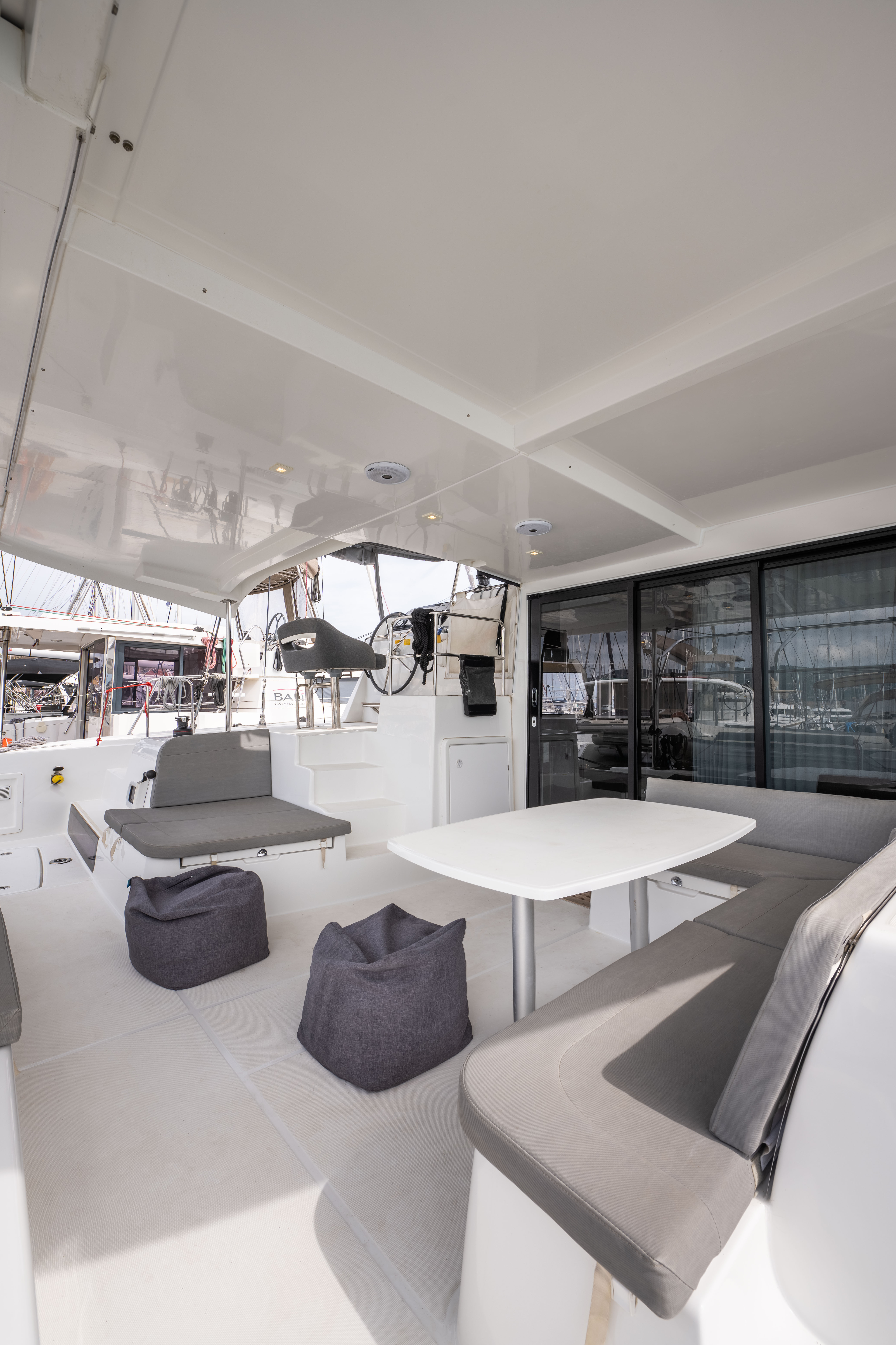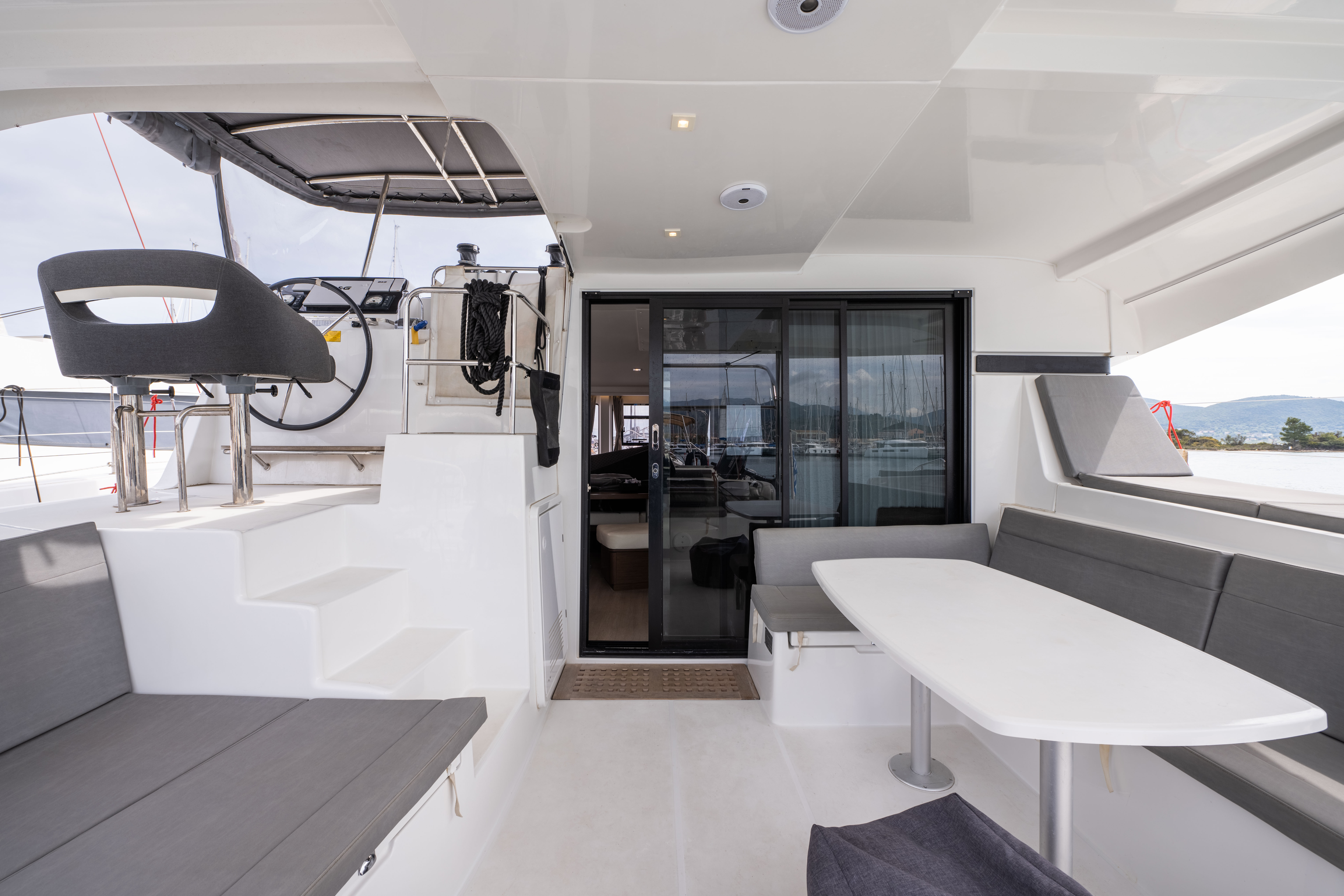 | Outside | Badeleiter, Biminitop, Cockpitdusche, Cockpitlautsprecher, Cockpitpolster, Cockpittisch, Deckpolster, elektr. Ankerwinsch, elektr. Winsch, Segel-Flickwerkzeug, Solaranlage, Sonnendeck, Sprayhood, Treibanker, Windex |