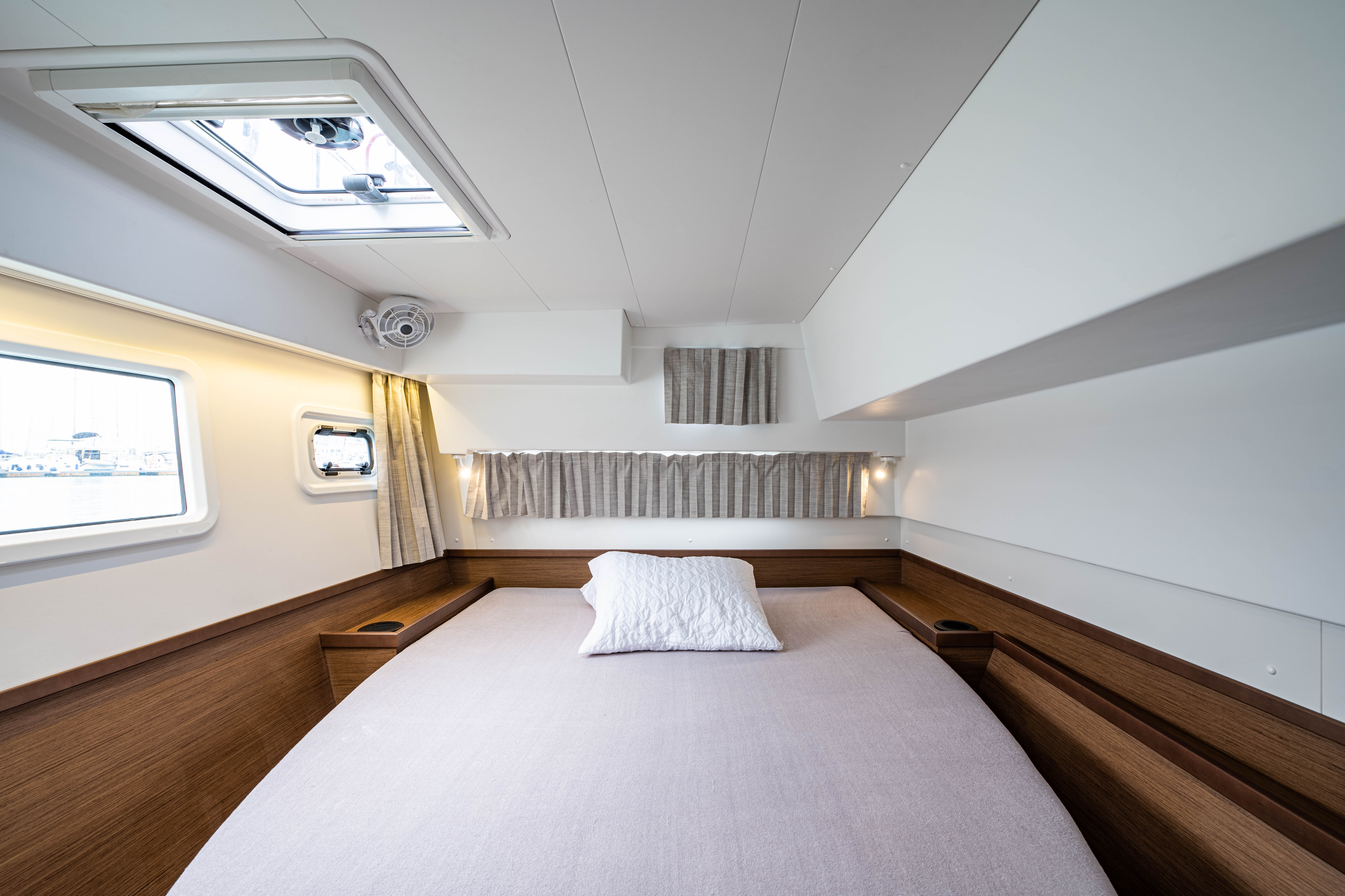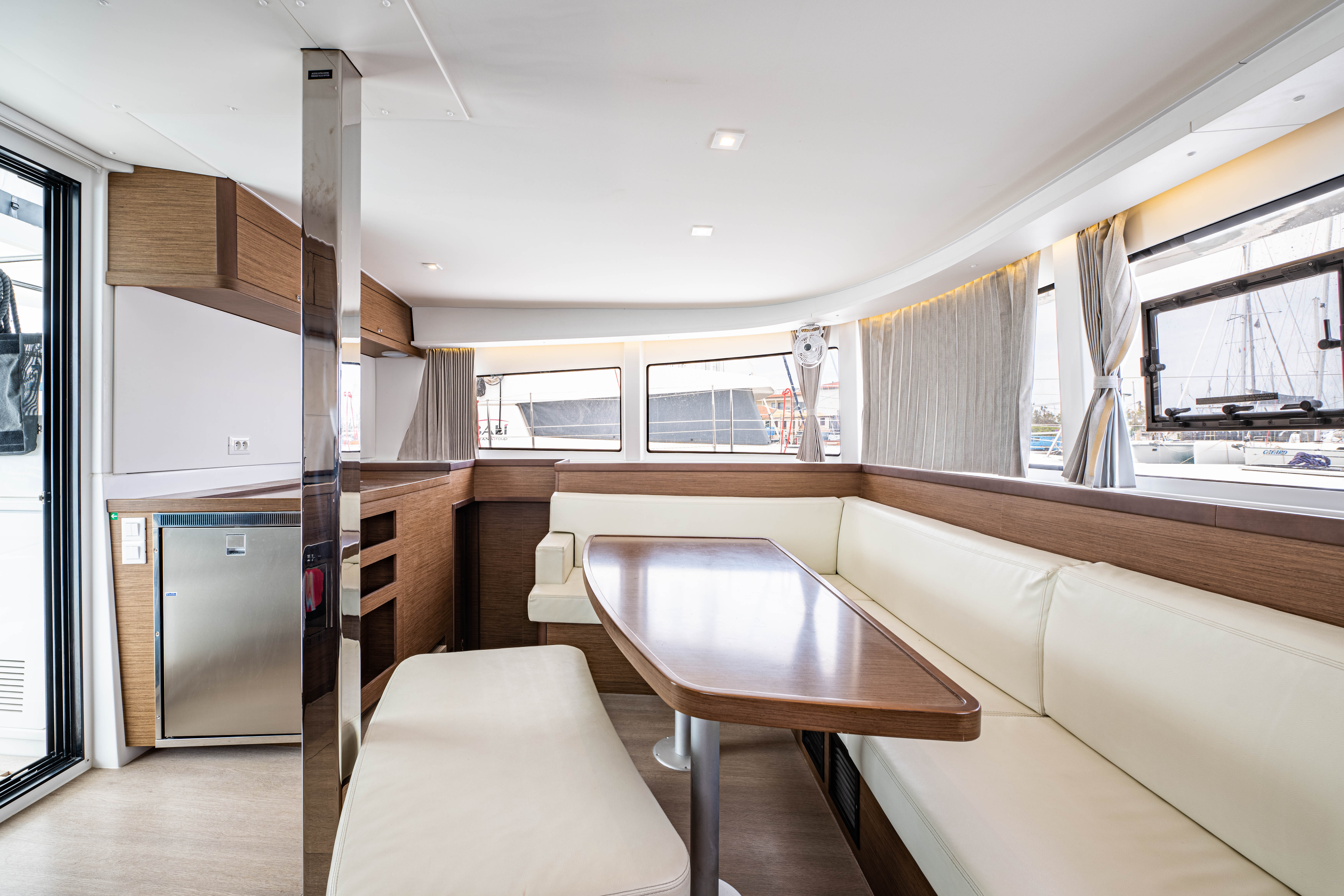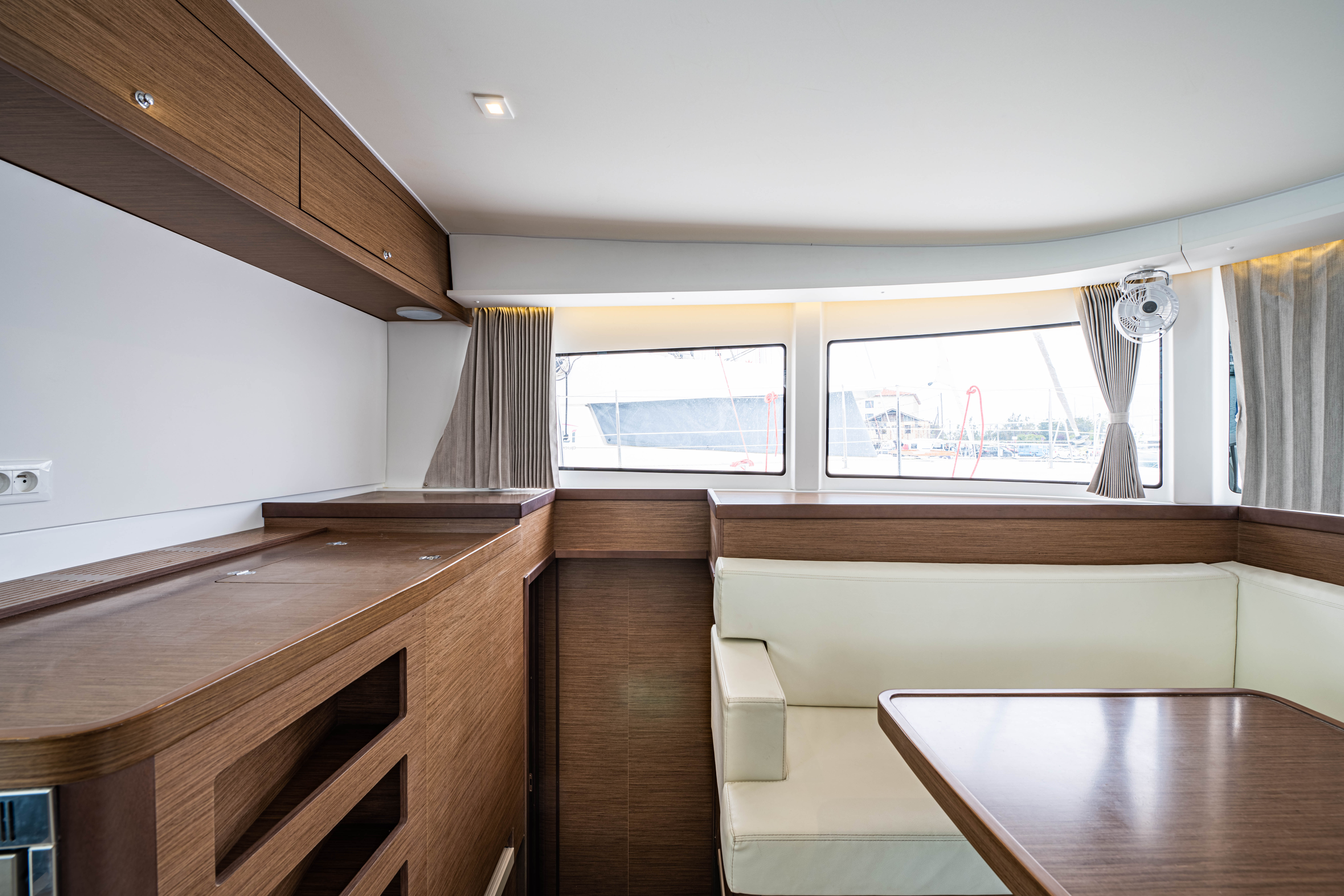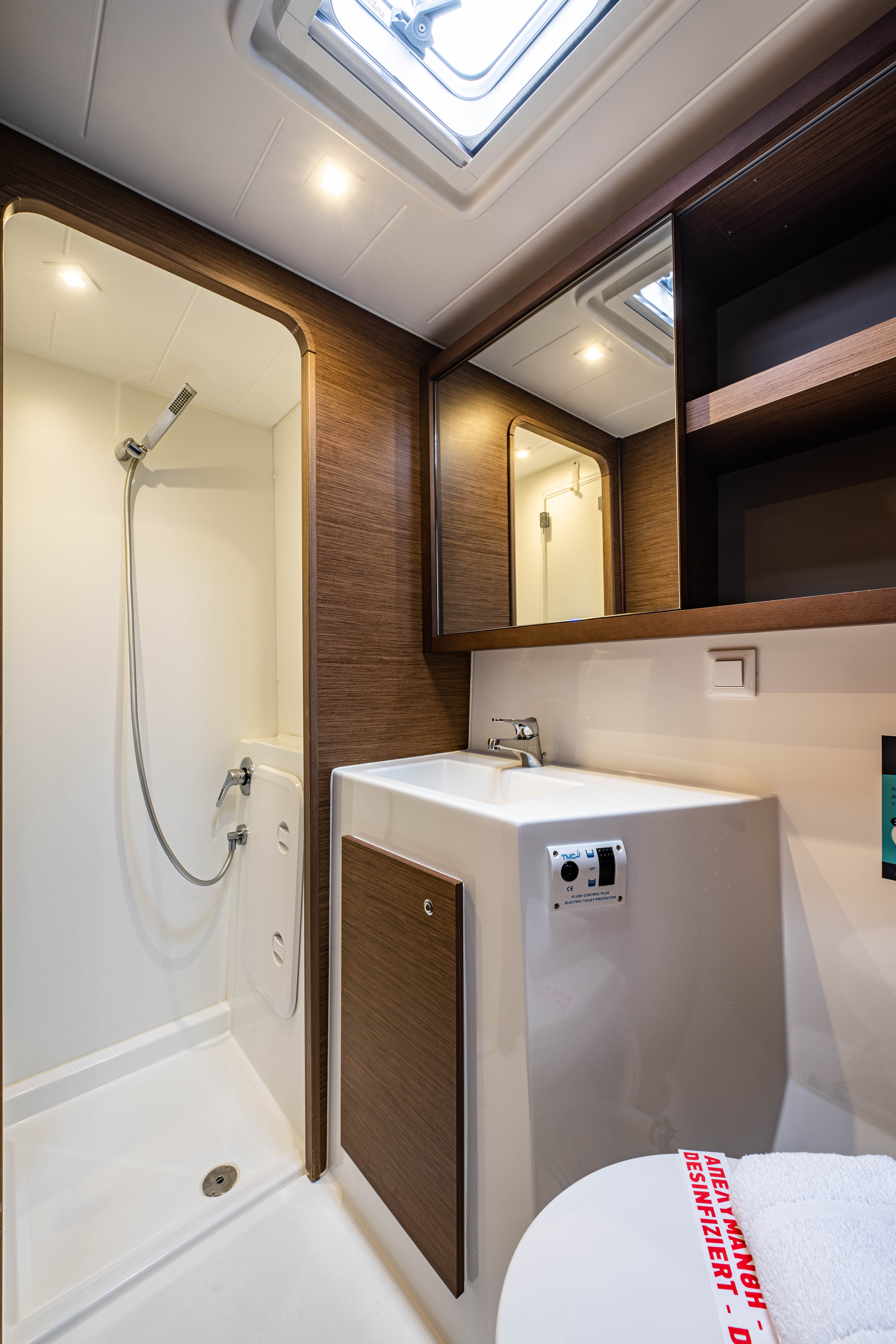 | Inside | 12V Steckdose, 220V Steckdosen, Borduhr, Fäkalientank, Gasherd, Gefrierschrank, Generator, Klimaanlage, Klimaanlage (ohne Landstrombedarf), Kühlschrank, Lautsprecher im Salon, Pantryausstattung, Radio mit CD, Salontisch absenkbar, USB Steckdosen in den Kabinen, Ventilatoren in Kabinen, Warmwasser, WC (elektr.) |
