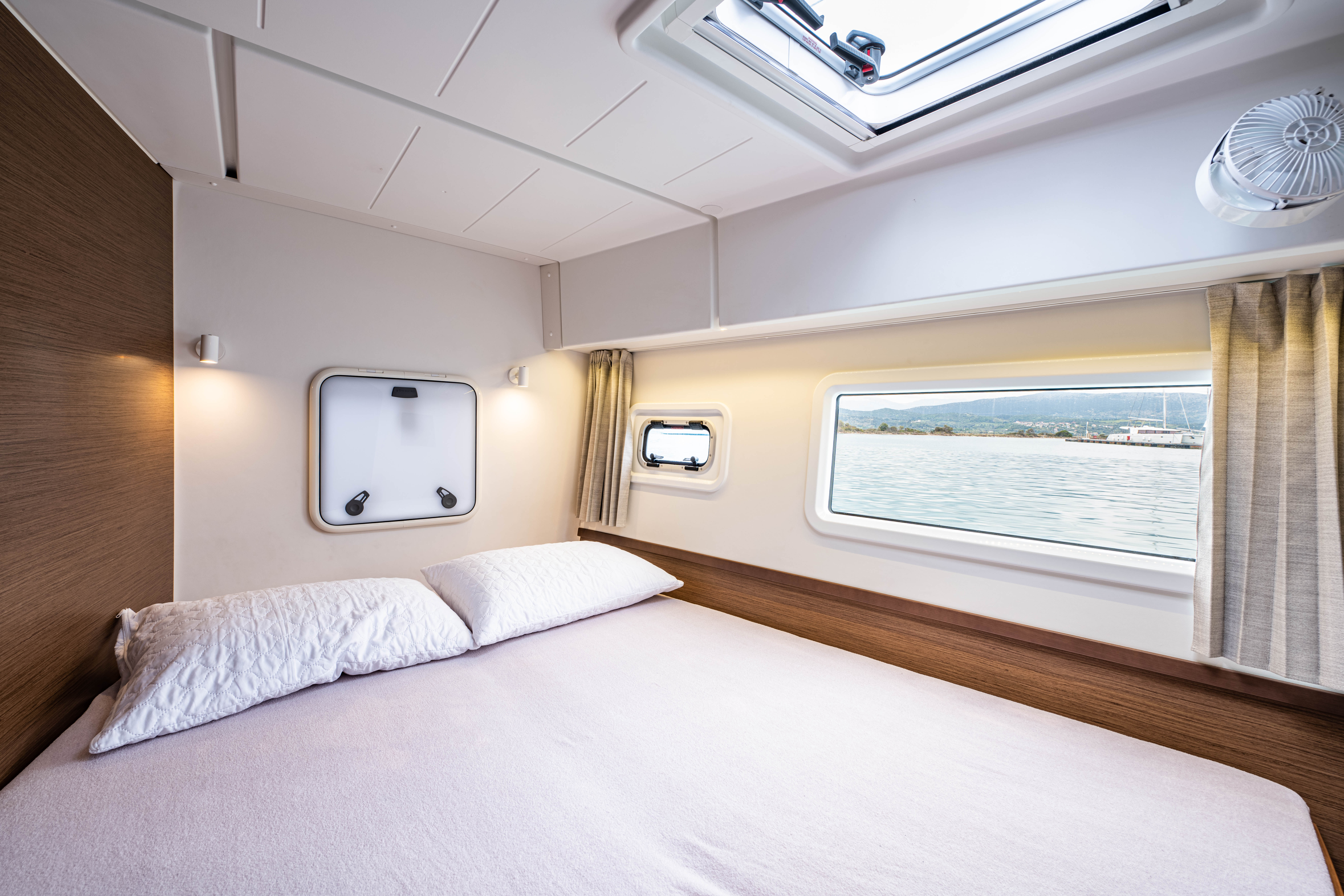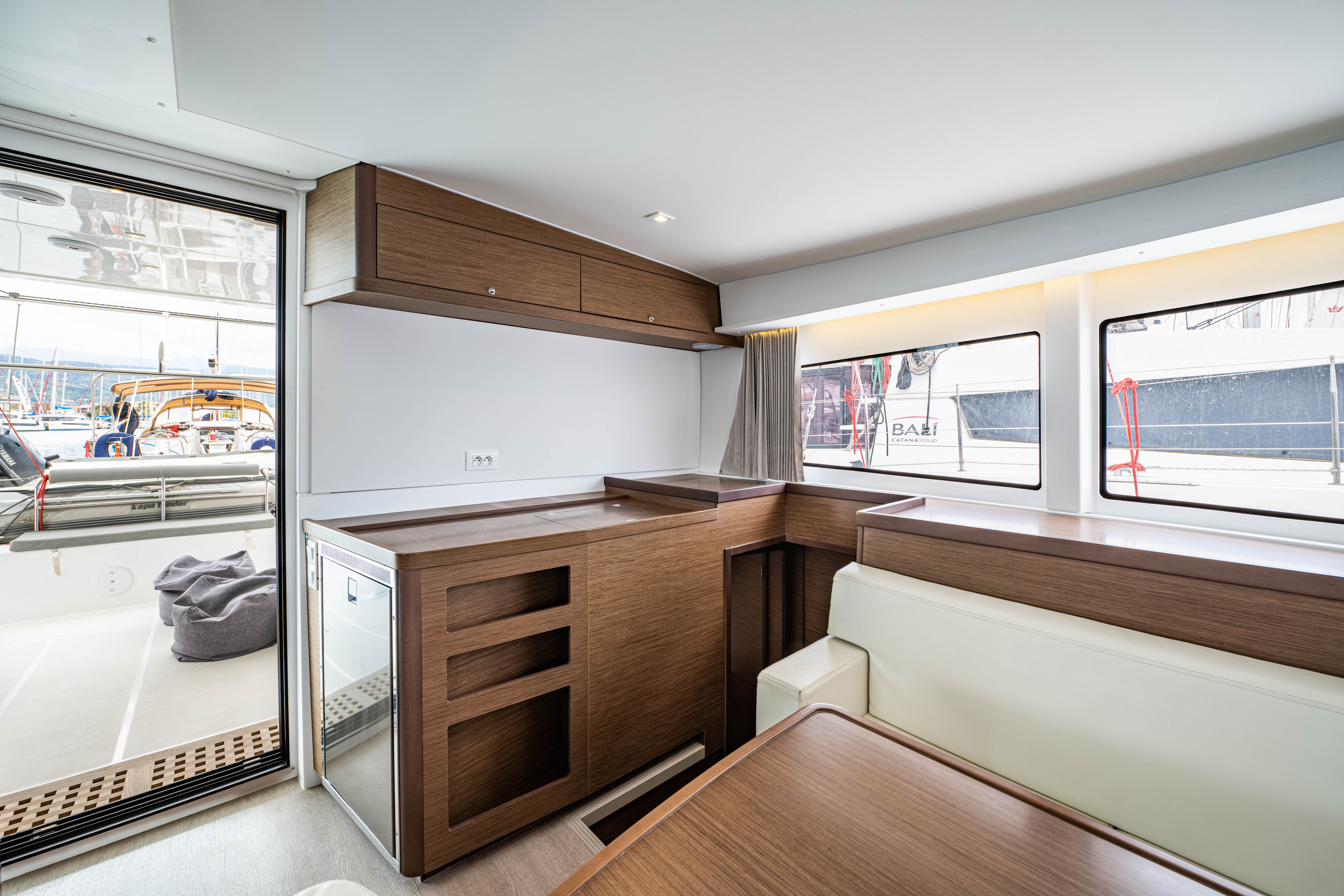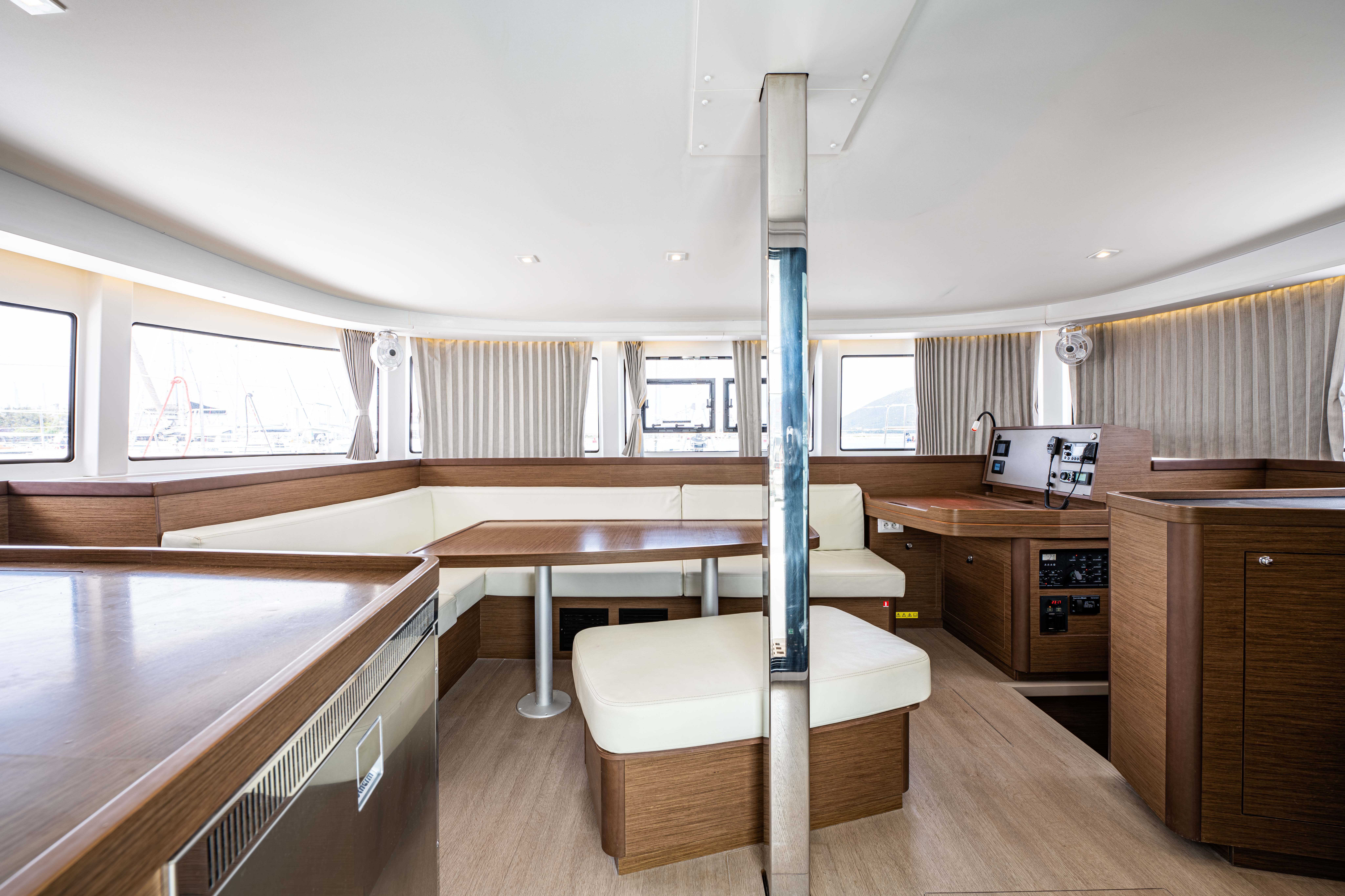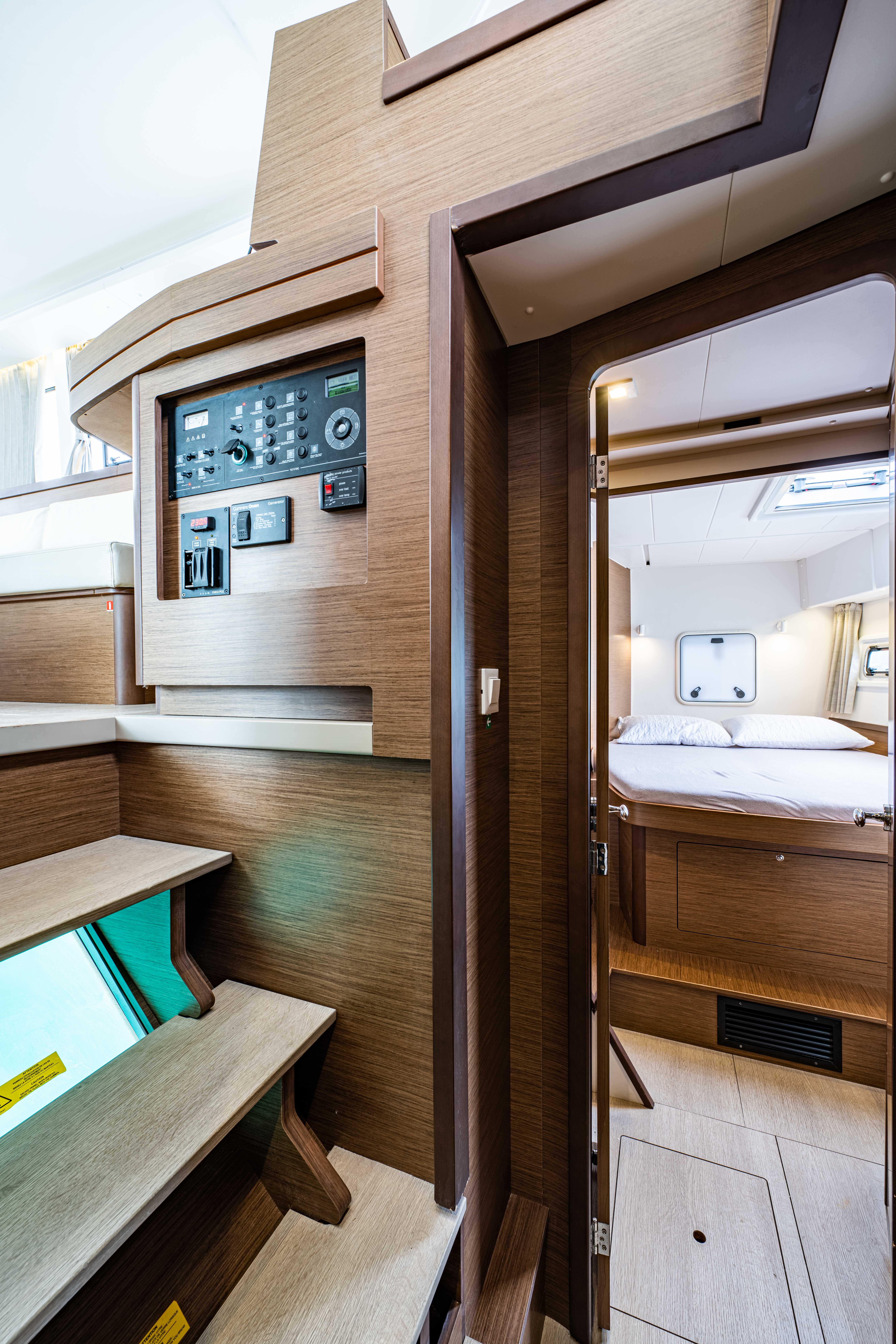 | Inside | 12V Steckdose, 220V Steckdosen, Borduhr, Fäkalientank, Gasherd, Gefrierschrank, Generator, Klimaanlage, Klimaanlage (ohne Landstrombedarf), Kühlschrank, Lautsprecher im Salon, Pantryausstattung, Radio mit CD, Salontisch absenkbar, USB Steckdosen in den Kabinen, Ventilatoren in Kabinen, Warmwasser, WC (elektr.) |