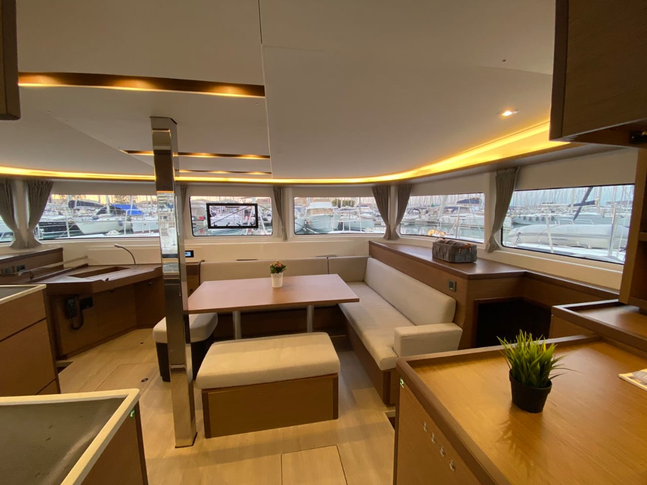 | Inside | Gasherd mit Backofen, Gefrierschrank, Generator, Heizung, Kaffeemaschine, Klimaanlage (ohne Landstrombedarf), Kühlschrank, Mikrowelle, MP3-Player, Nespresso-Maschine, Pantryausstattung, Radio mit CD, Salontisch absenkbar, Spülbecken, Warmwasser, Watermaker, WC (elektr.) |