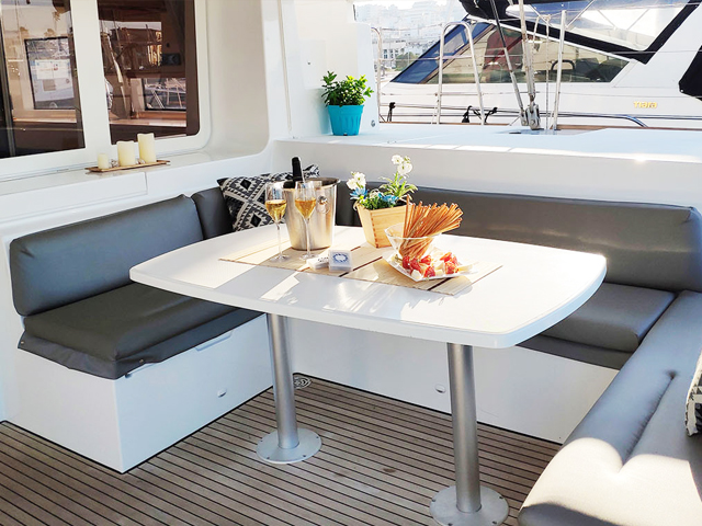| Outside | Badeleiter, Badeplattform, Biminitop, Cockpitdusche, Cockpitlautsprecher, Cockpitpolster, Cockpittisch, Deckpolster, elektr. Winsch, Schnorchelausrüstung, Sprayhood, Teakdeck, Unterwasserbeleuchtung, Windex |