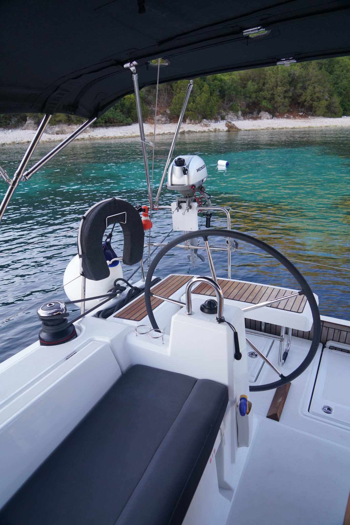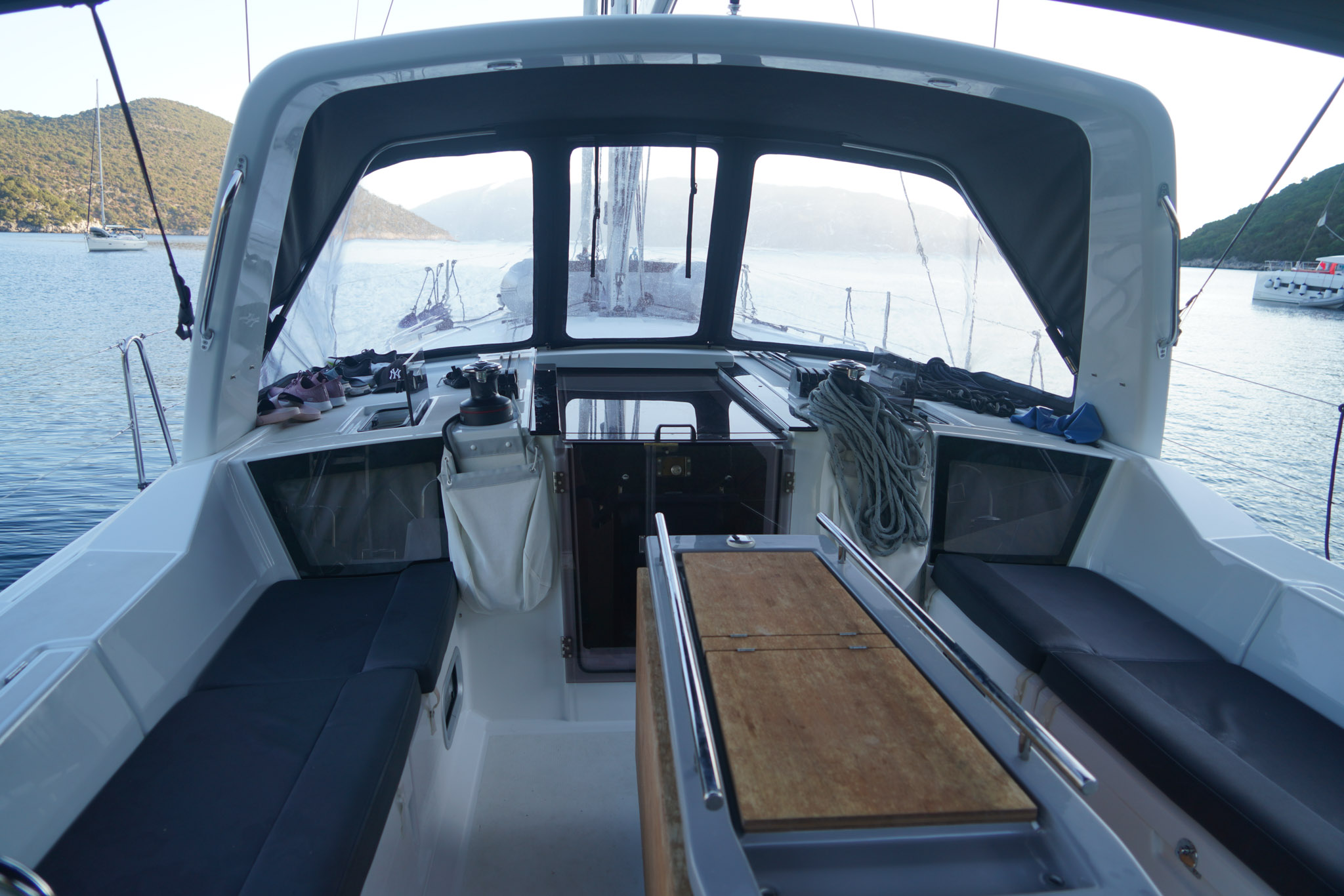 | Outside | Außendusche, Badeleiter, Biminitop, Cockpitlautsprecher, Cockpitpolster, Cockpittisch, Segel-Flickwerkzeug, Solaranlage, Sprayhood, Teak im Cockpit, Treibanker, Windex |
