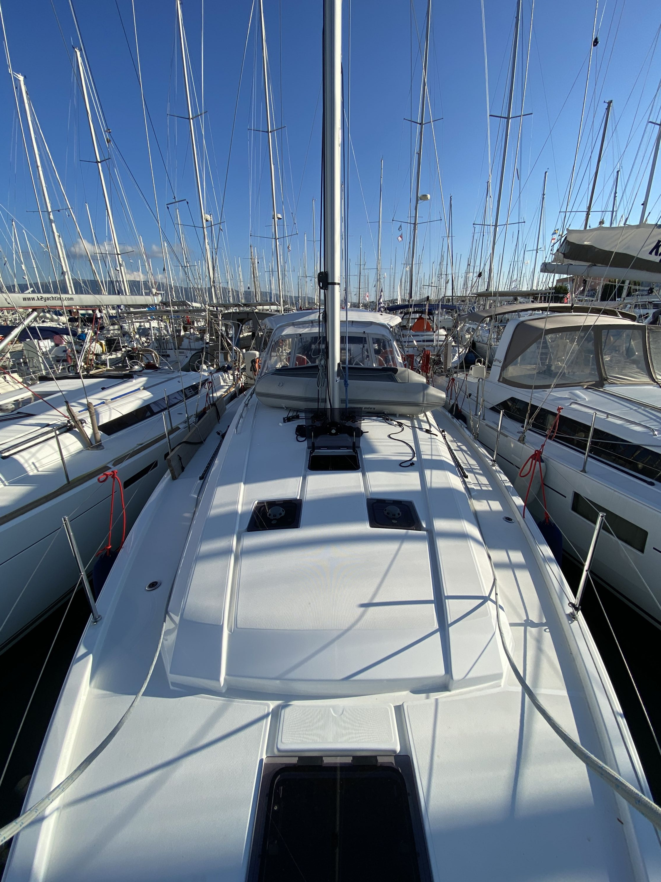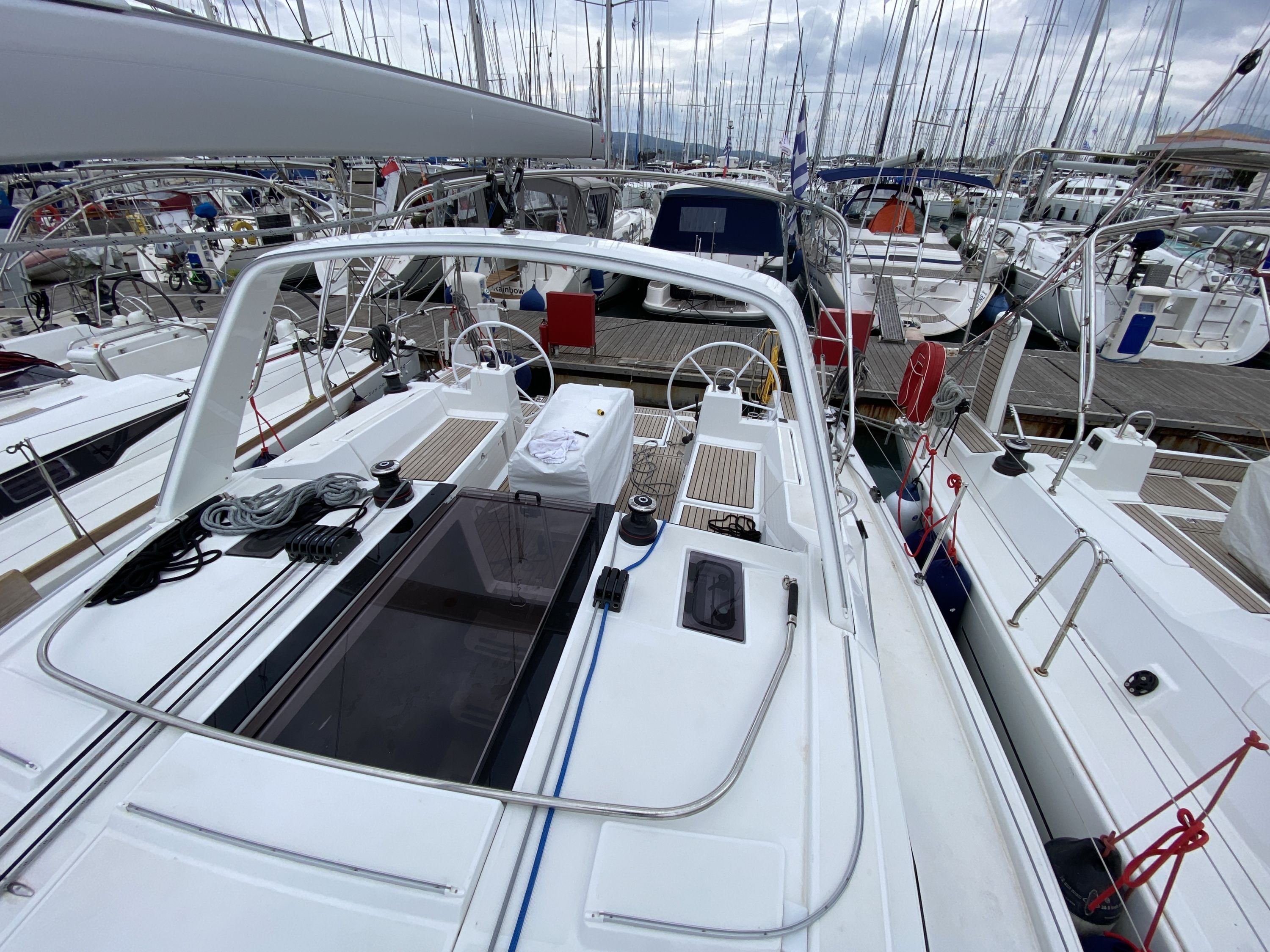 | Outside | Anker mit Kette, Badeleiter, Badeplattform, Biminitop, Cockpitdusche, Cockpitlautsprecher, Cockpitpolster, Cockpittisch, elektr. Ankerwinsch, Gangway, Segel-Flickwerkzeug, Selbstholende Winschen, Solaranlage, Sprayhood, Teak im Cockpit, Treibanker, Windex |