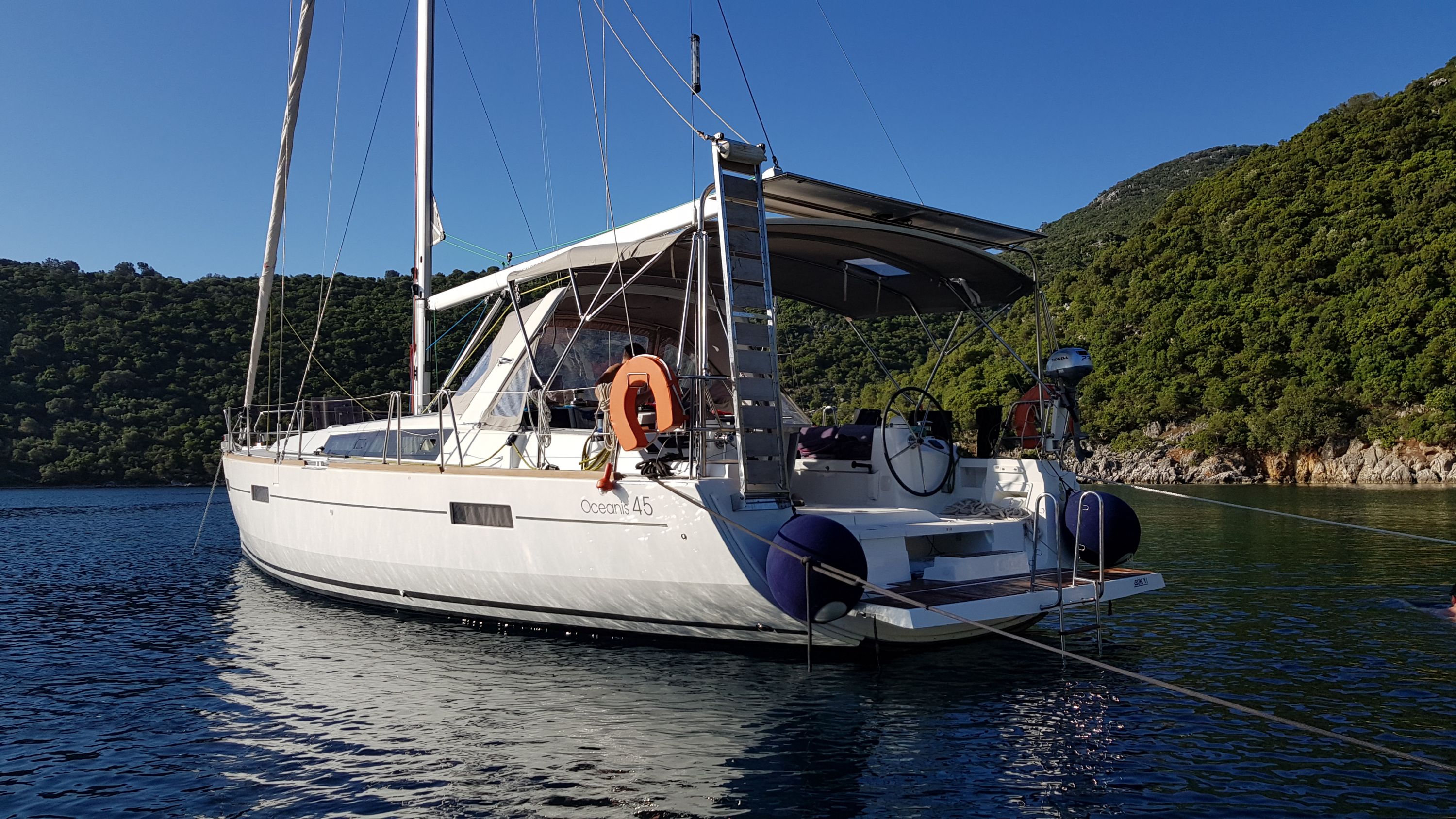 | Outside | Badeplattform, Biminitop, Cockpitdusche, Cockpittisch, elektr. Ankerwinsch, Gangway, Solaranlage, Sprayhood |