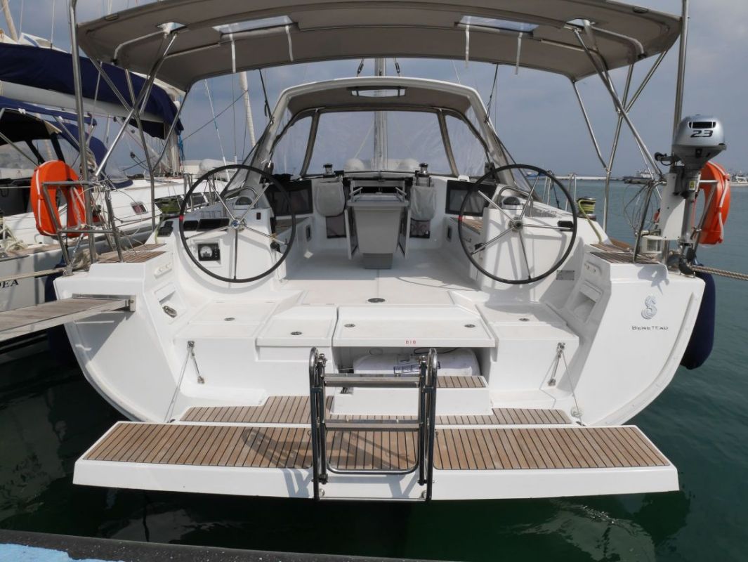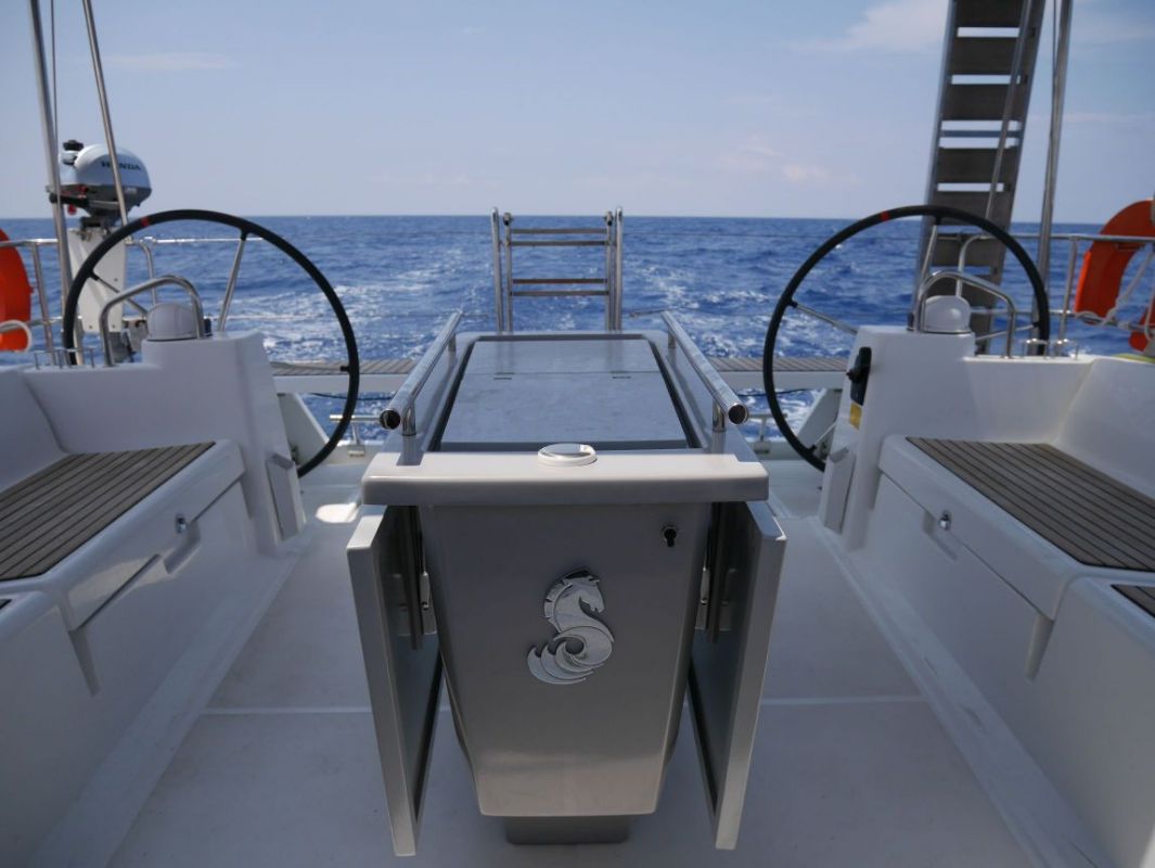 | Outside | Anker mit Kette, Badeleiter, Biminitop, Bootshaken, Cockpitdusche, Cockpitlautsprecher, Cockpitpolster, Deckbürste, elektr. Ankerwinsch, Faltsteuerrad, Fender, Festmacherleinen, Gangway, Kugelfender, Kunststoff-Eimer (Pütz), Schnorchelausrüstung, Solaranlage, Sprayhood, Wantenschneider, Wasserschlauch, Winschen |
