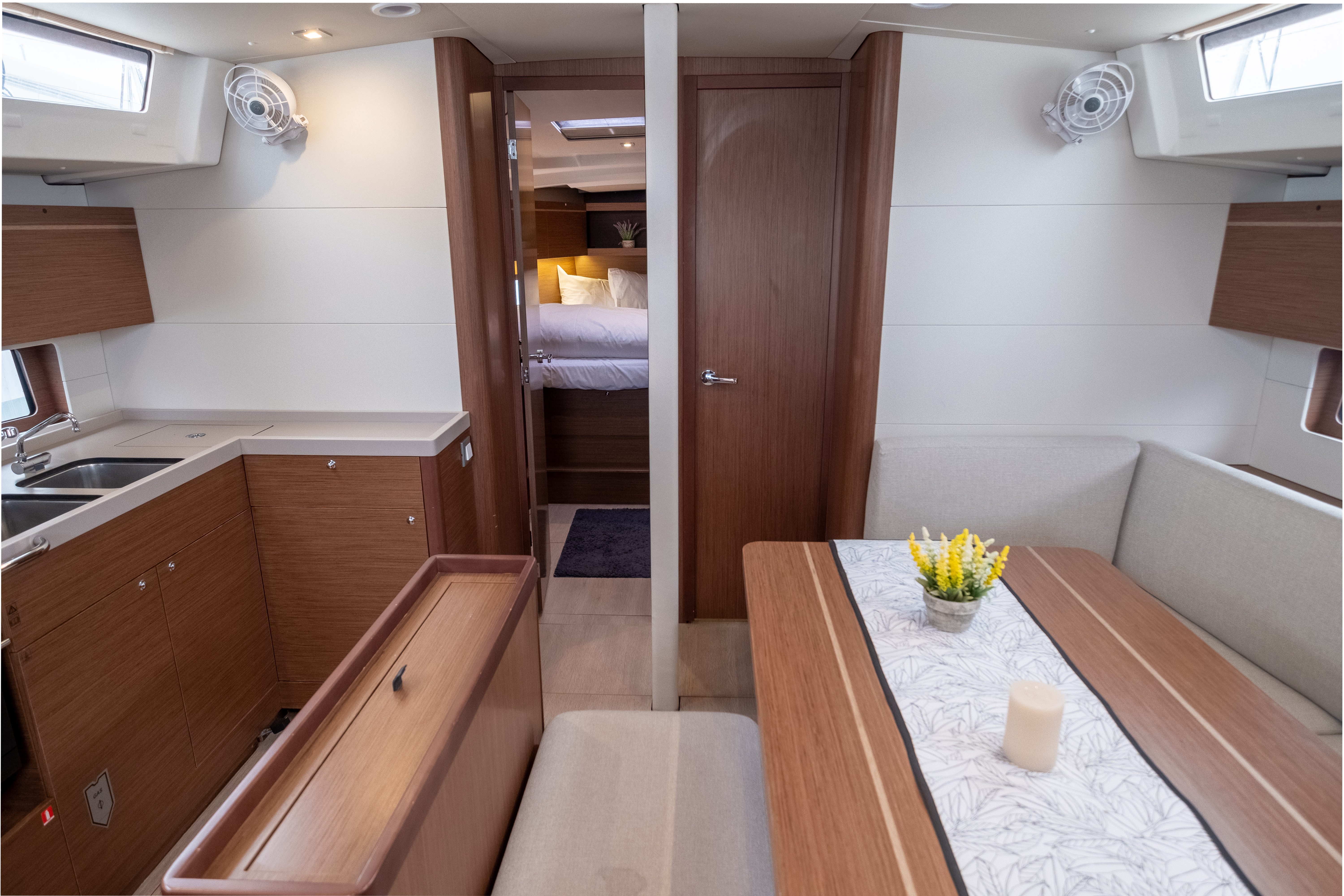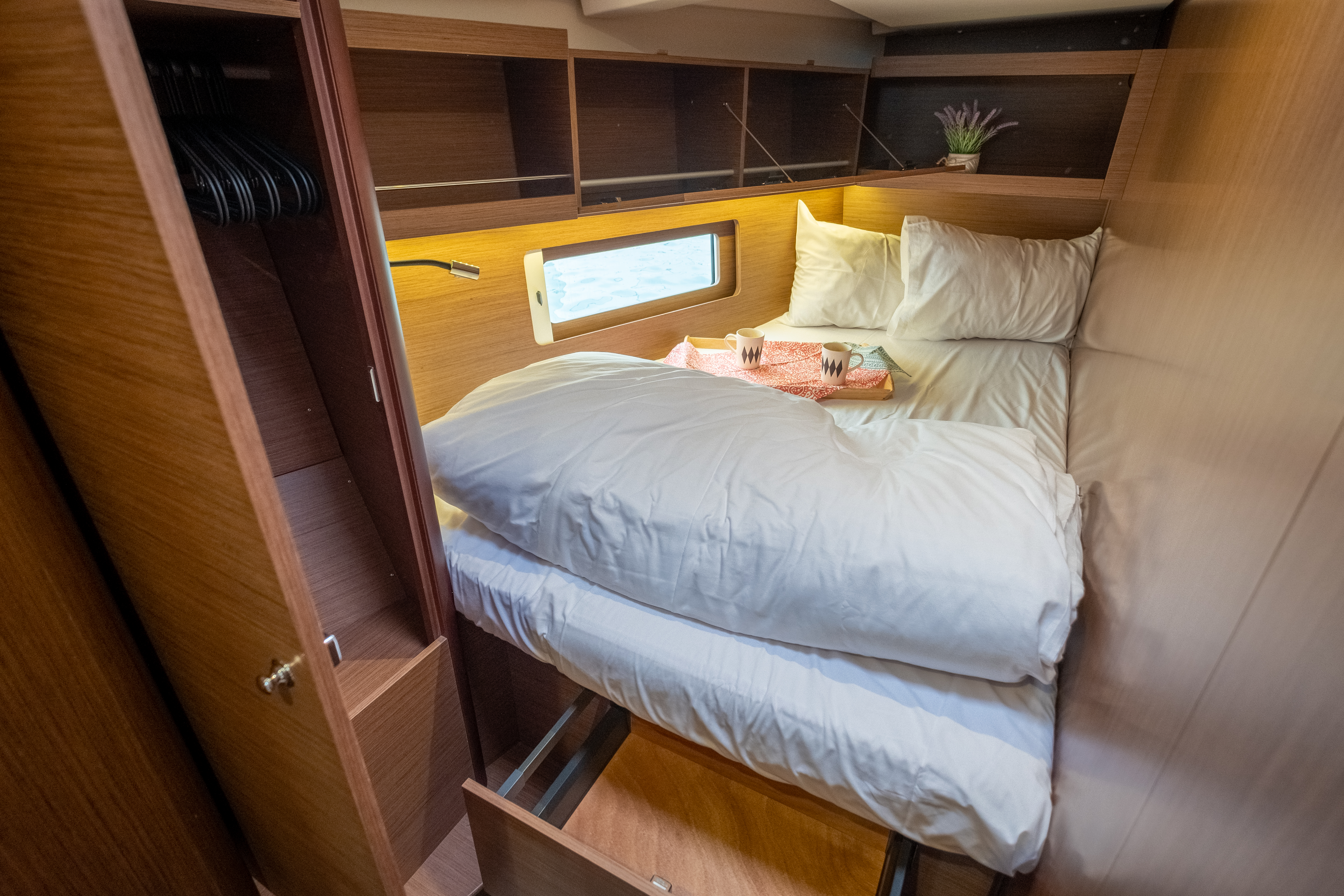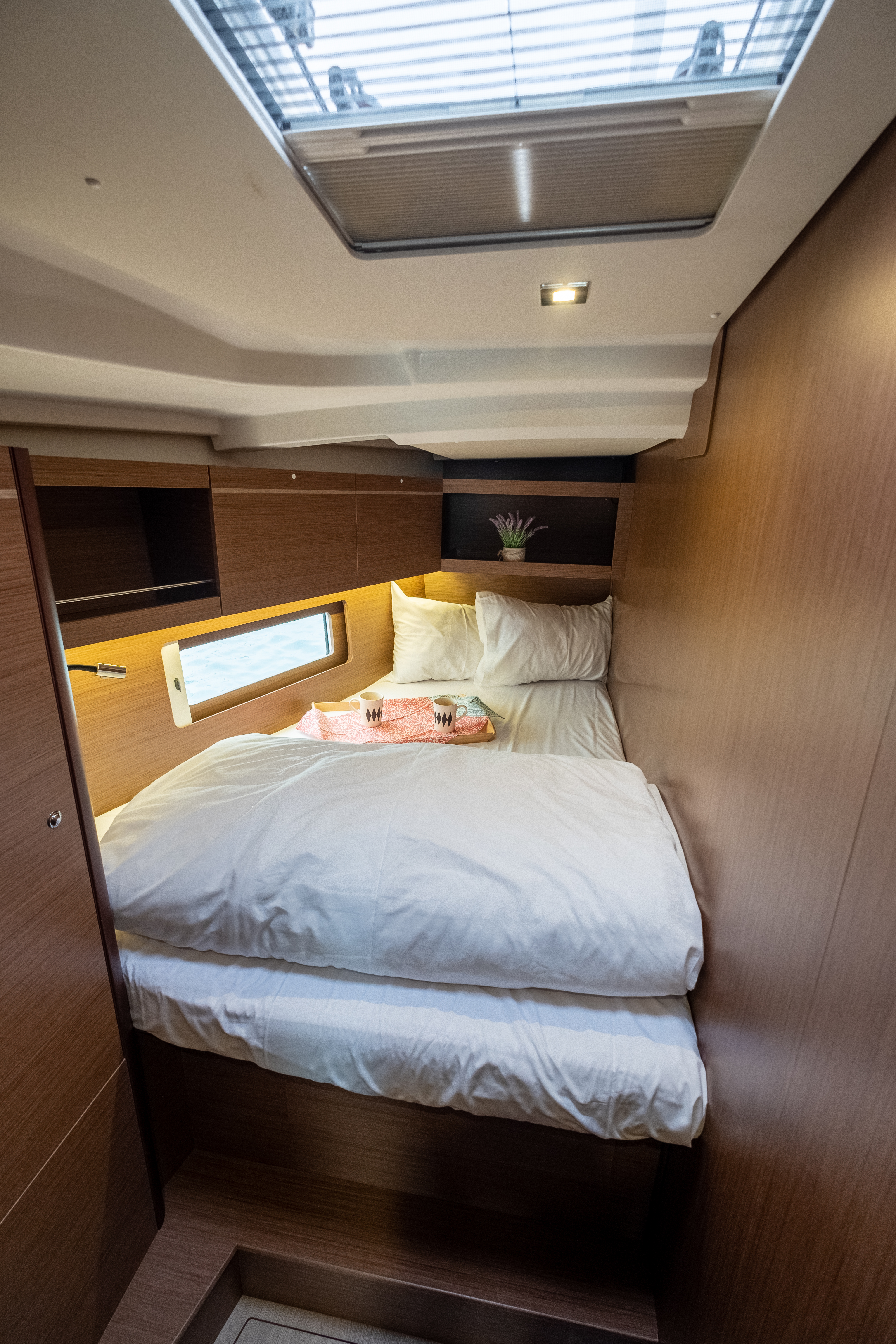| Inside | FUSION Sound System, Inverter 12V/220V, Lautsprecher im Salon, Mikrowelle, Moskitonetze, Salontisch absenkbar, USB Steckdose, Ventilatoren in Salon und Kabinen, Watermaker |