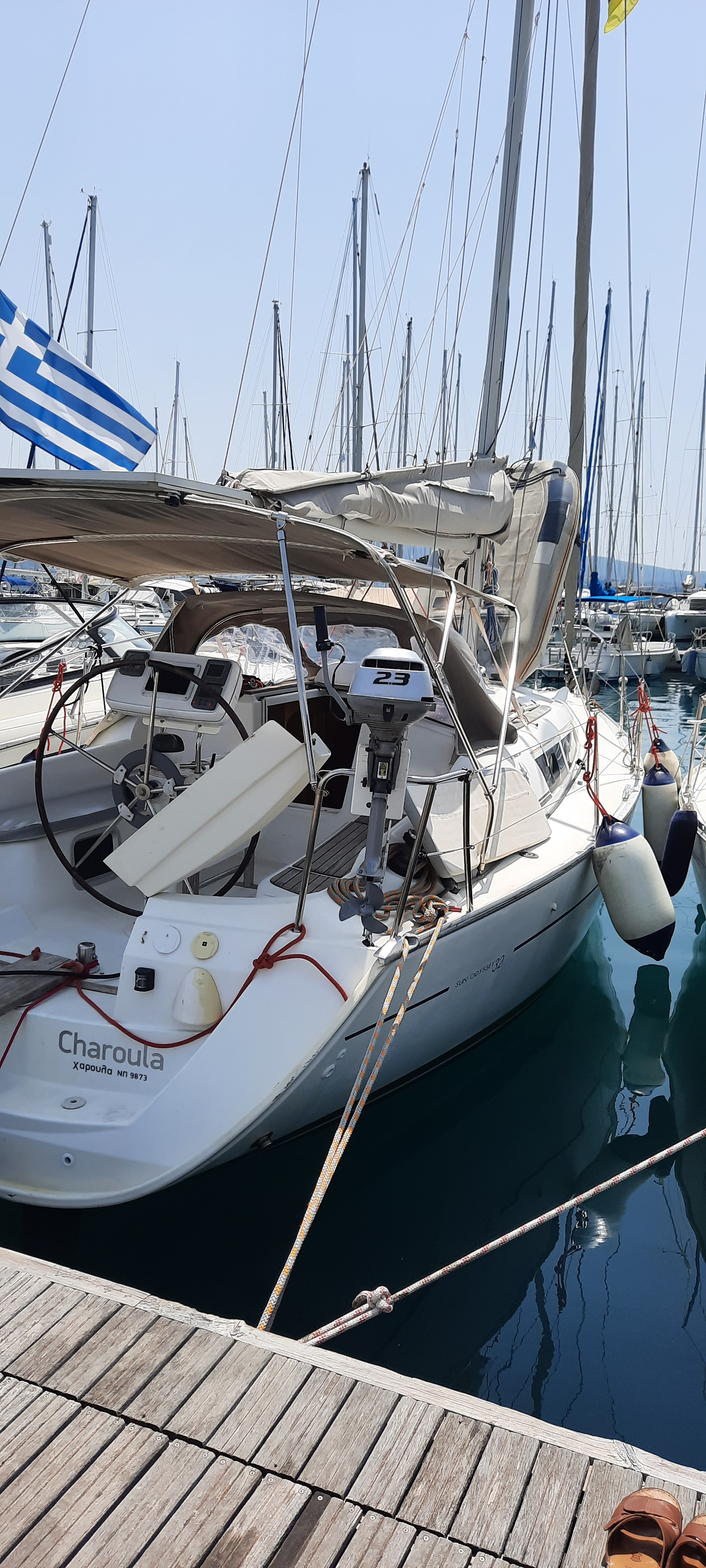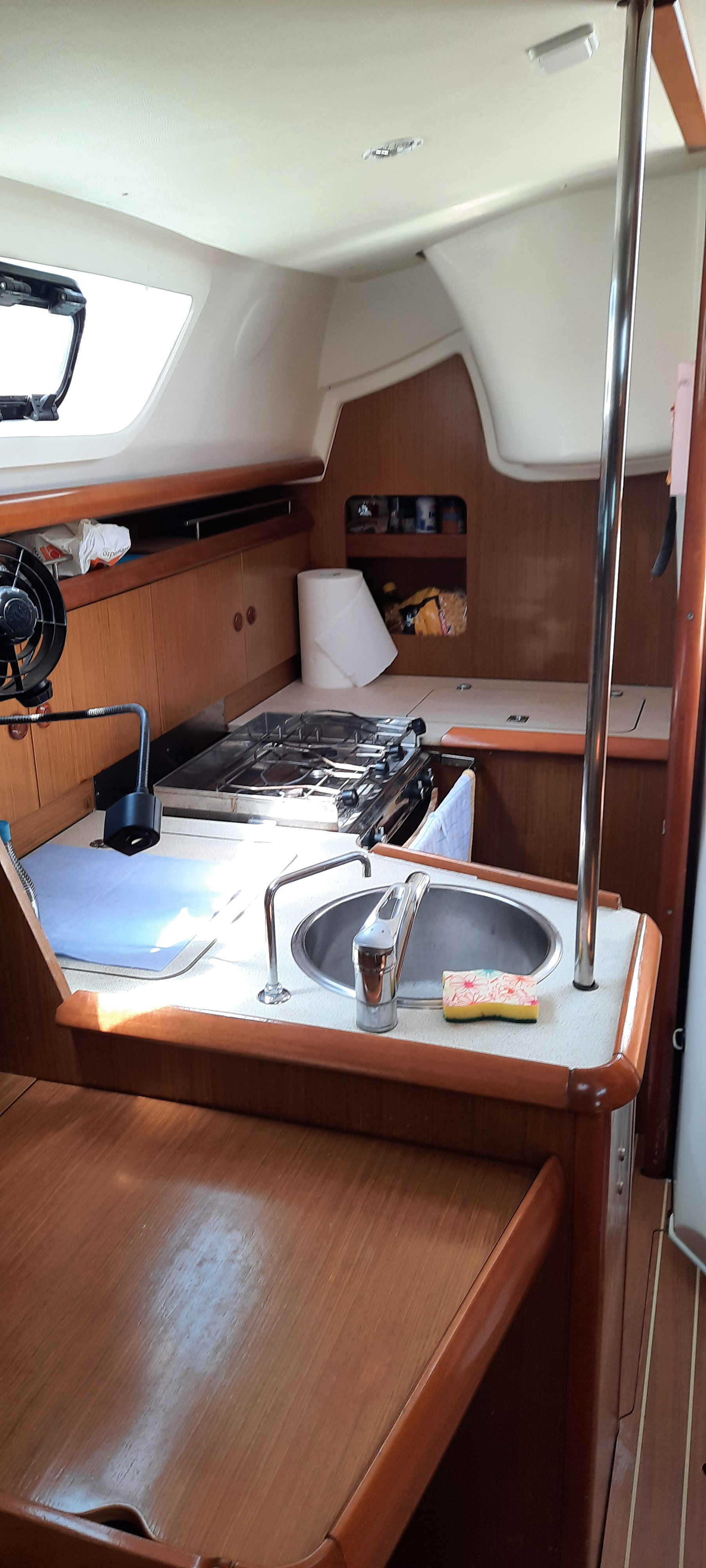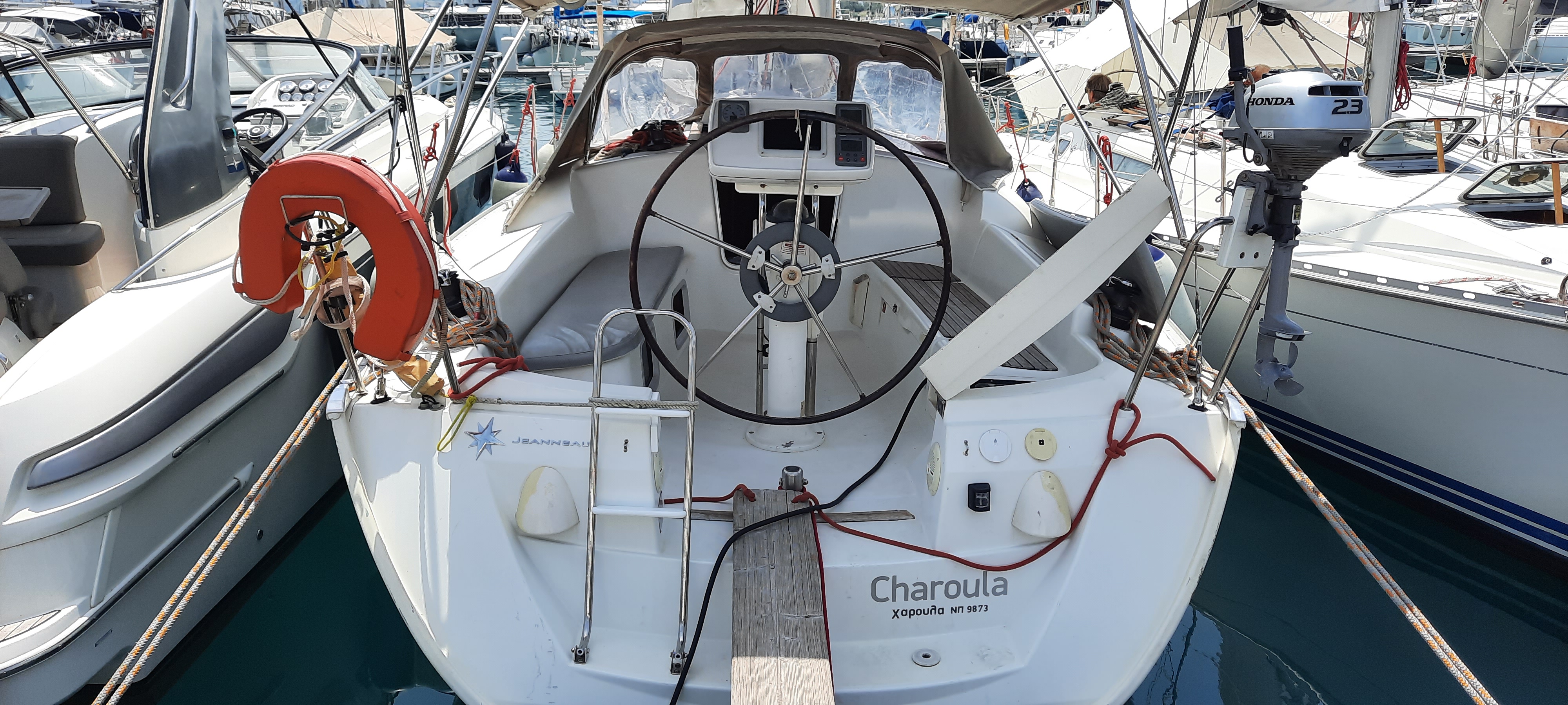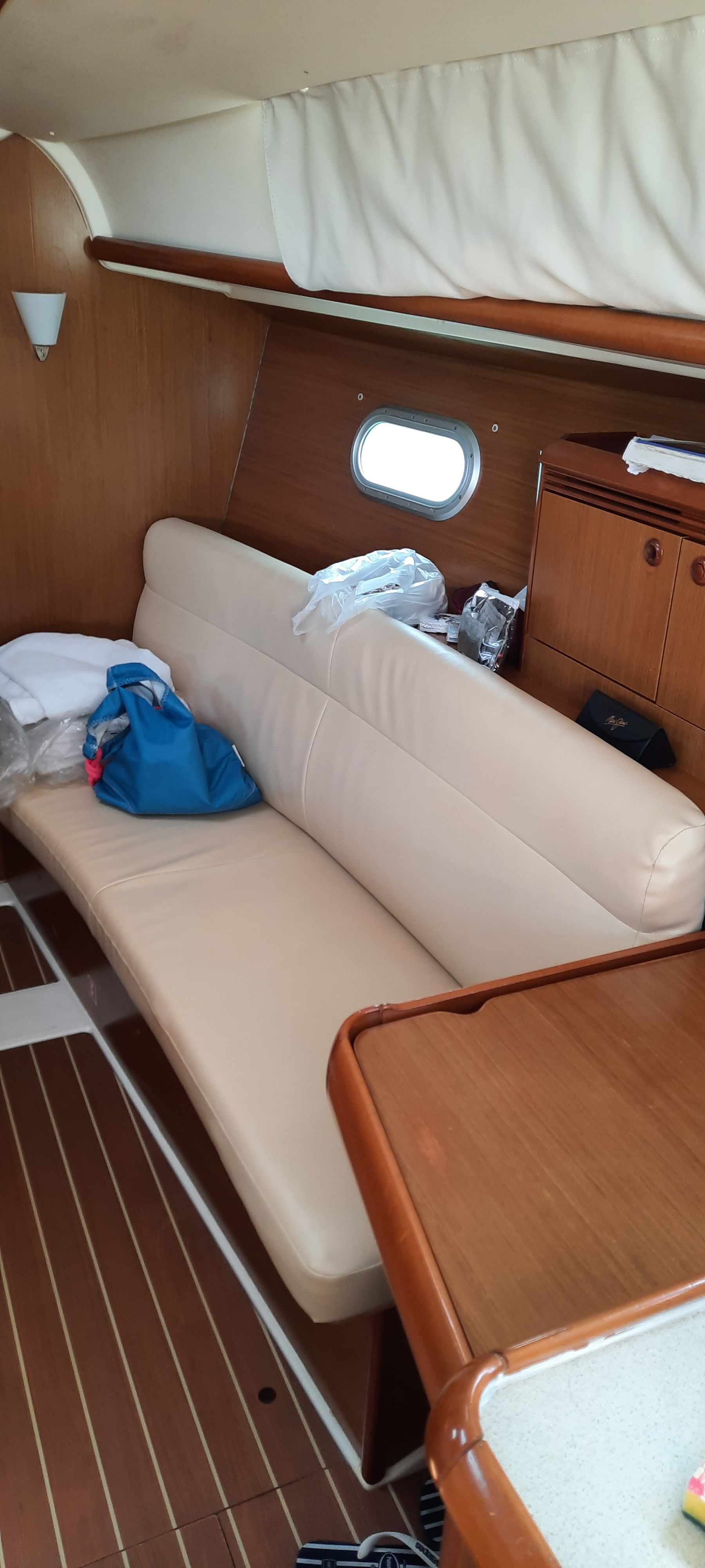 | Outside | Anker mit Kette, Badeleiter, Cockpitdusche, Cockpitlautsprecher, Cockpittisch, elektr. Ankerwinsch, Segel-Flickwerkzeug, Teak im Cockpit, Treibanker, Windex |