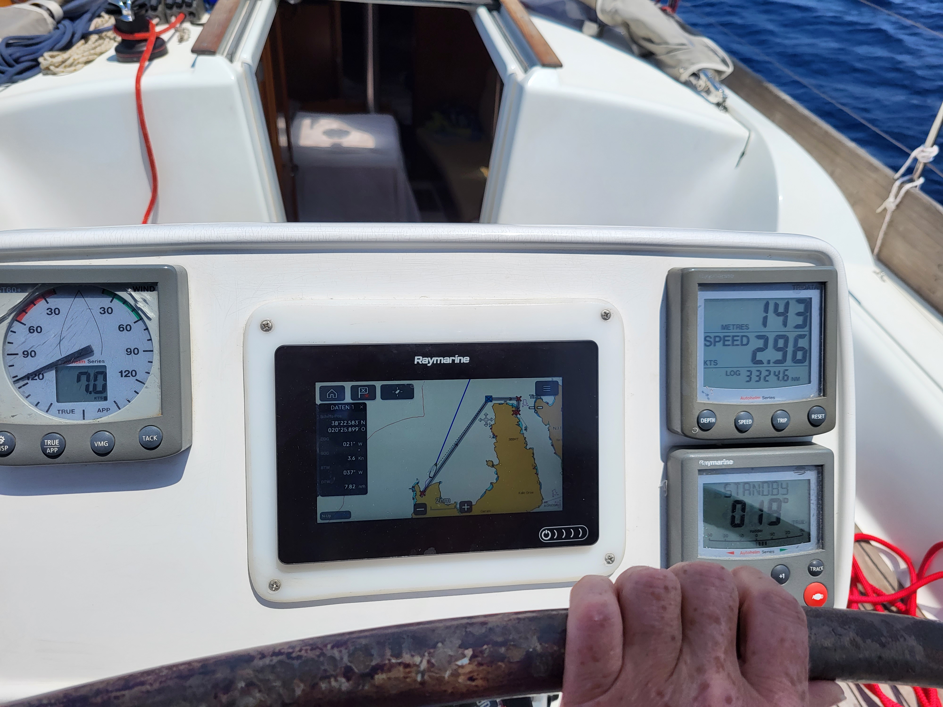 | Navigation | Barometer, Echolot, Fernglas, GPS mit Kartenplotter, Hafenhandbücher, Handpeilkompass, Kompass, Seekarten, Sumlog, Tridata (Log, Echolot, Windm.), Windmesser |