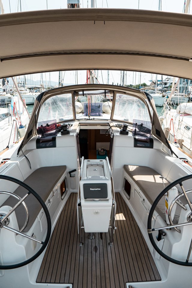 | Outside | 220 V-Landanschluss, Badeleiter, Badeplattform, Biminitop, Cockpitdusche, Cockpitlautsprecher, Cockpitpolster, Cockpittisch, Delta-Anker, elektr. Ankerwinsch, Gangway, hydraul. Gangway, Solaranlage, Sprayhood, Teak im Cockpit |