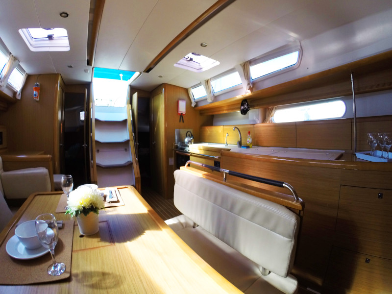 | Outside | Anker mit Kette, Ankerwinsch, Badeleiter, Biminitop, Bolzenschneider, Bootshaken, Cockpitpolster, Deckbürste, elektr. Ankerwinsch, Fender, Gangway, Kunststoff-Eimer (Pütz), Segel-Flickwerkzeug, Solaranlage, Sprayhood, Winschen |