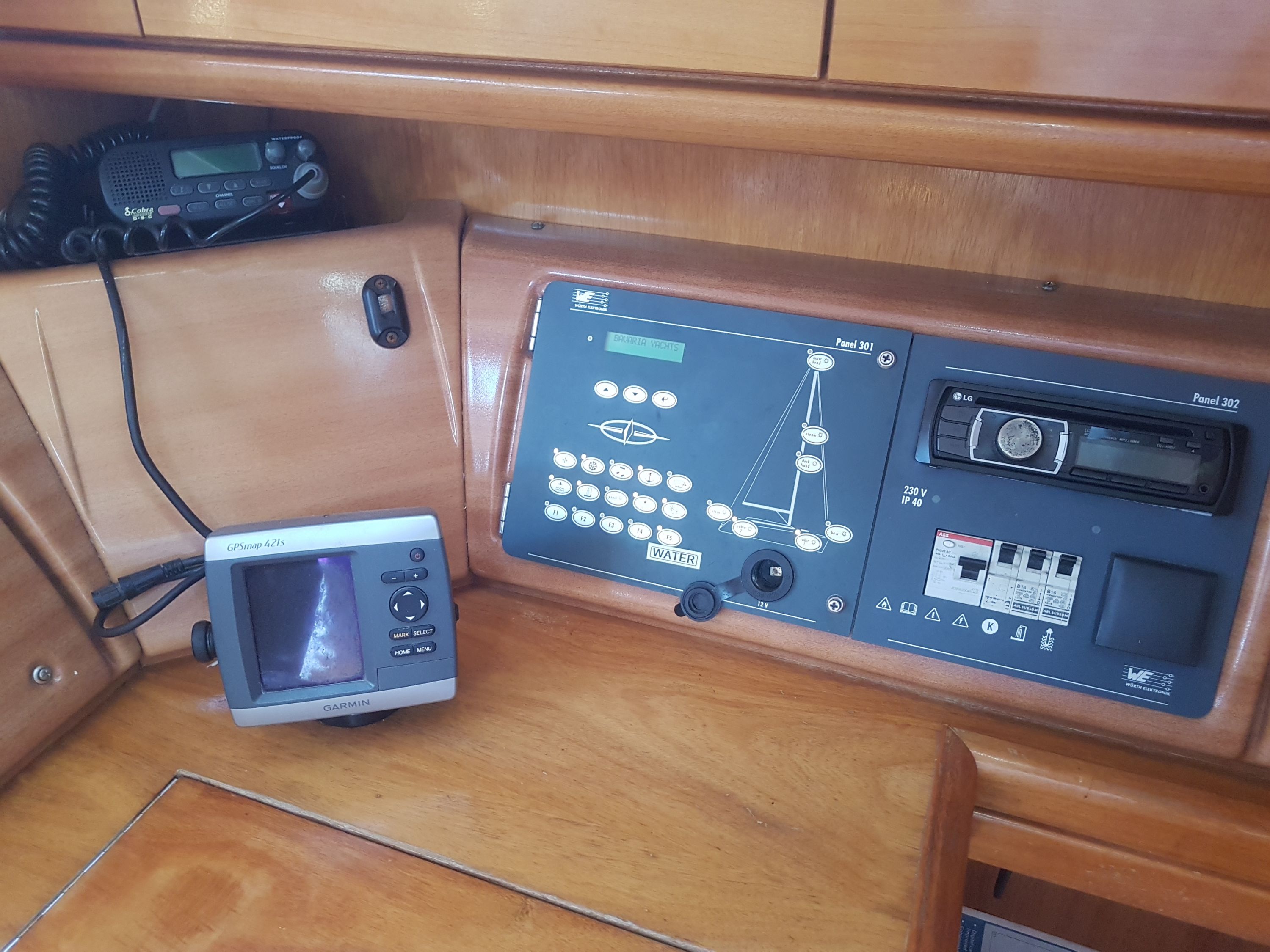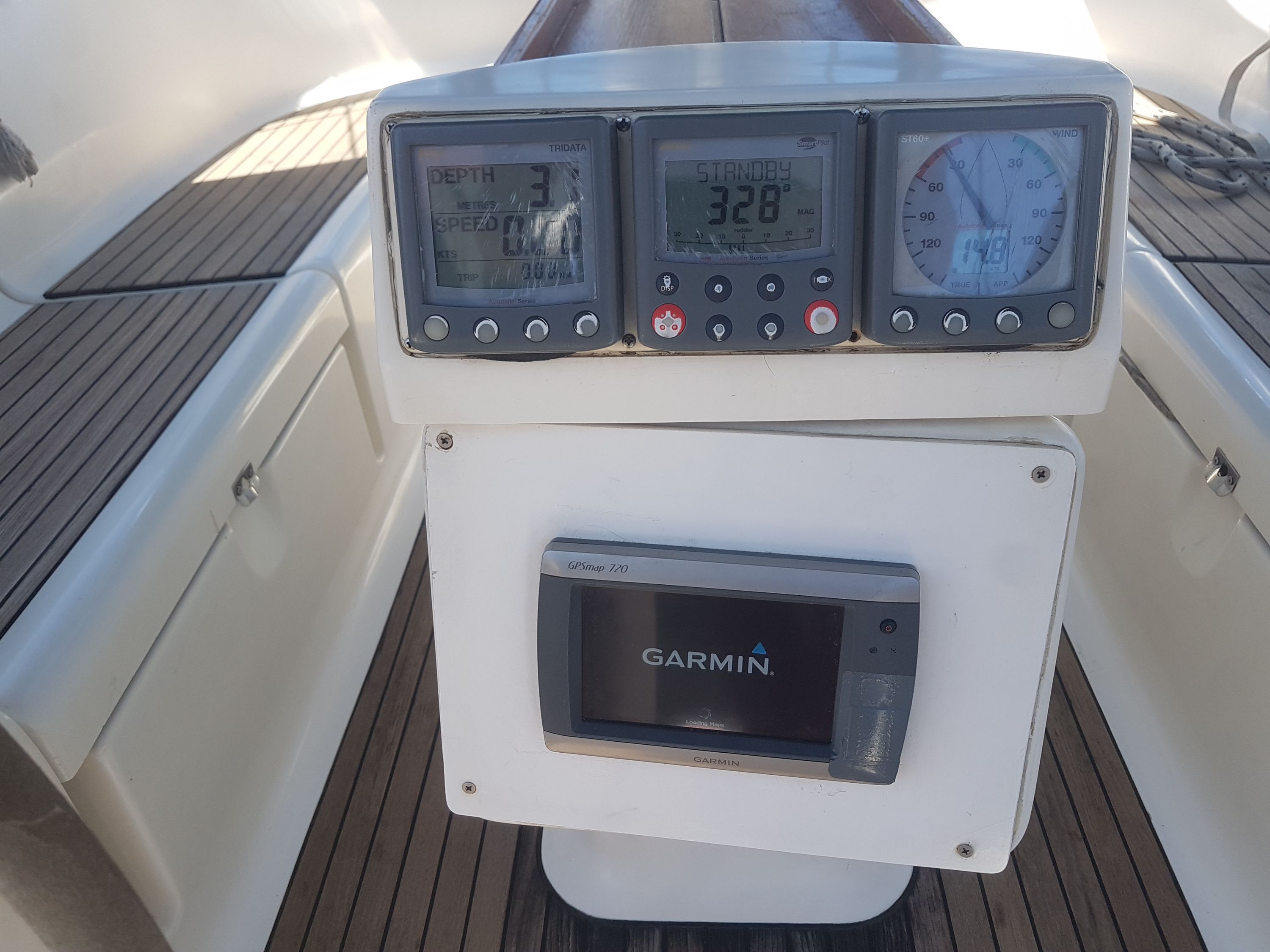 | Navigation | Barometer, elektr. Seekarten, Fernglas, GPS mit Kartenplotter im Cockpit, Hafenhandbücher, Handpeilkompass, Seekarten, Windmesser |