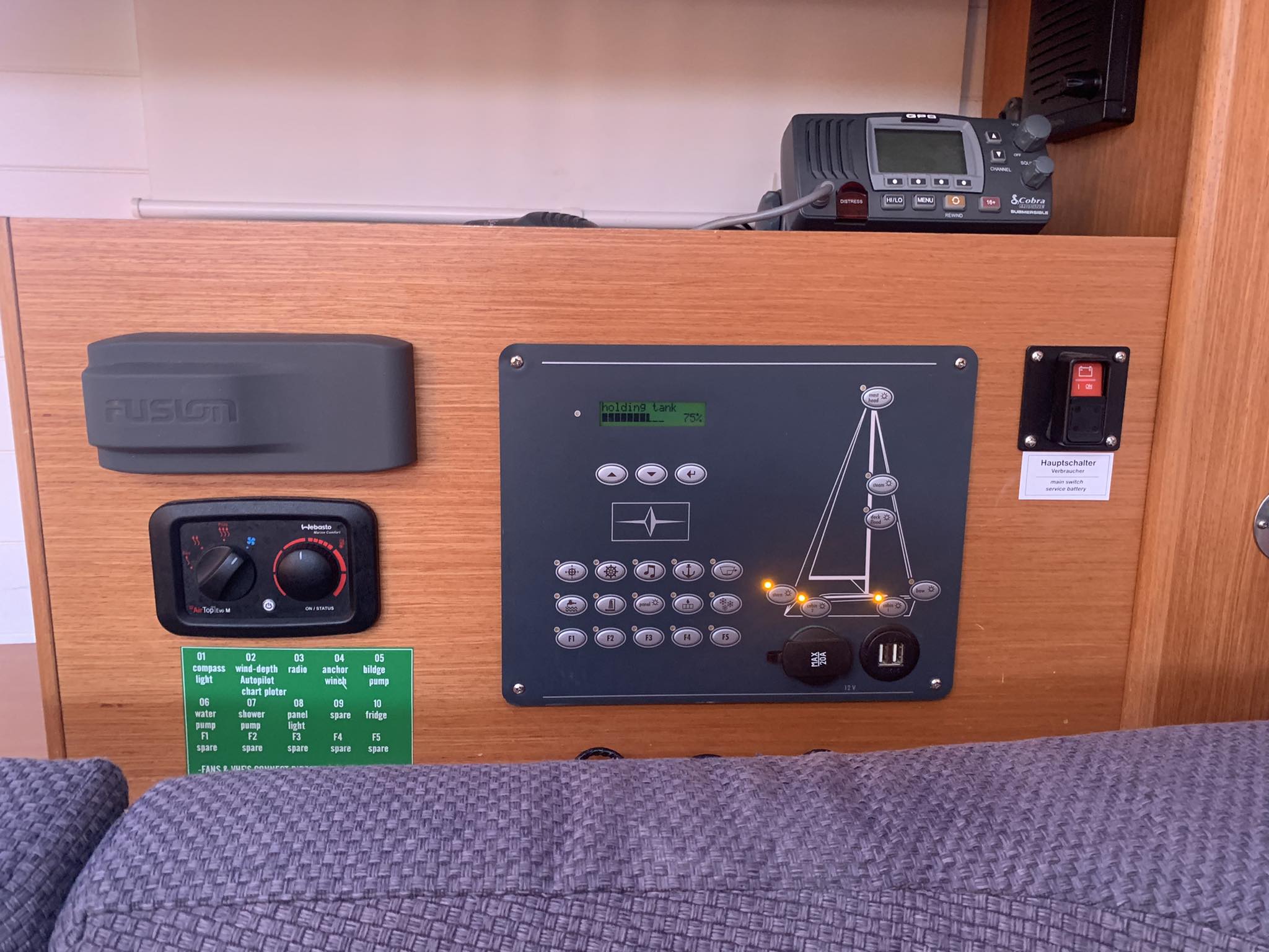 | Outside | Außendusche, Badeleiter, Badeplattform, Biminitop, Cockpitlautsprecher, Cockpitpolster, elektr. Ankerwinsch, Solaranlage |