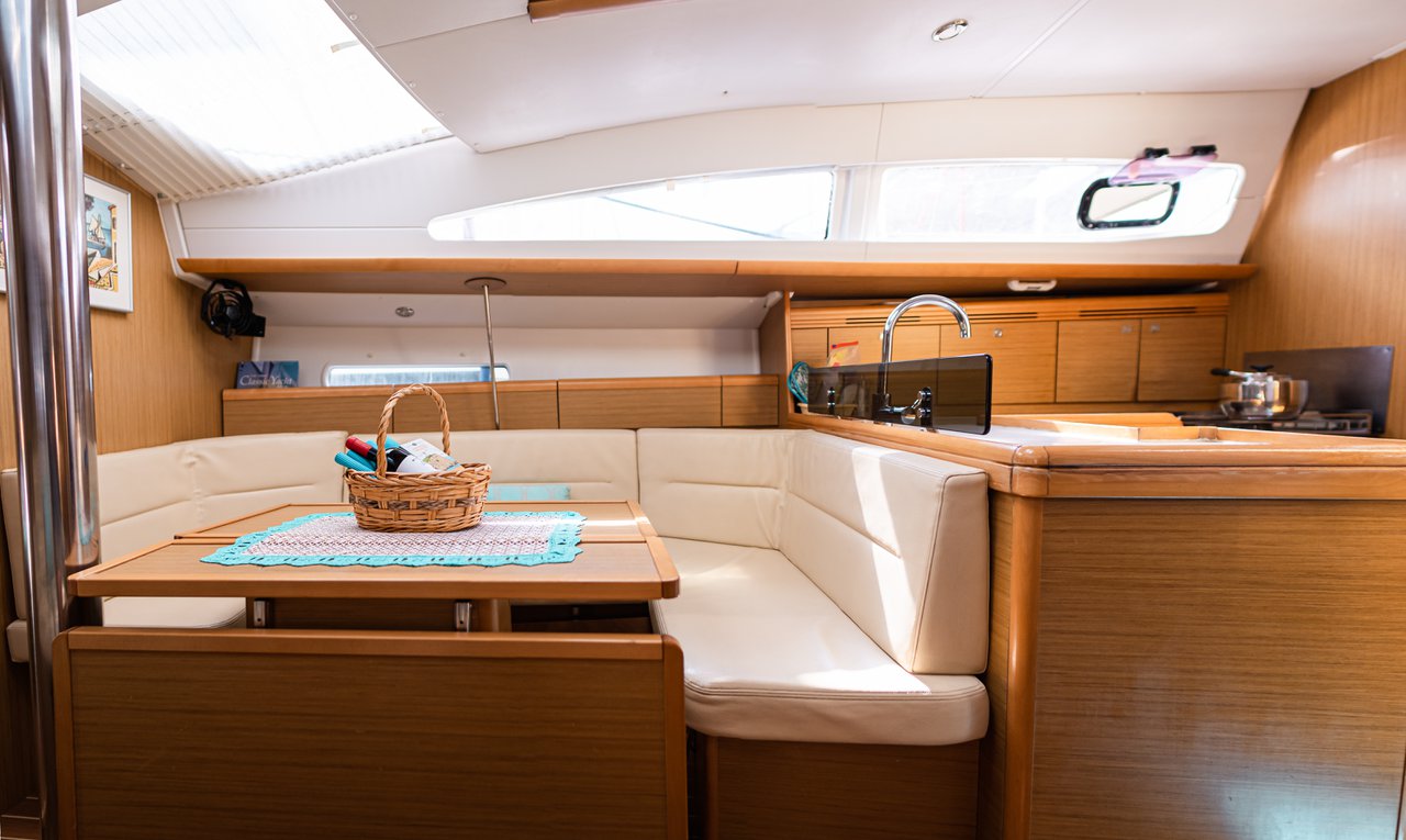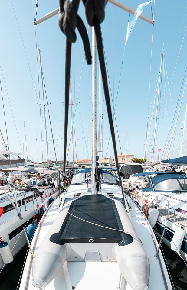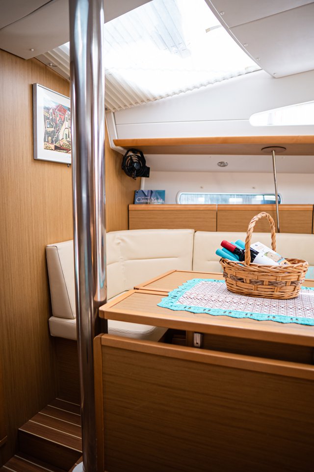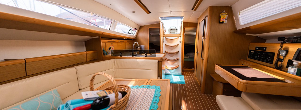 | Outside | Badeleiter, Biminitop, Cockpitlautsprecher, Cockpitpolster, Cockpittisch, Delta-Anker, elektr. Ankerwinsch, Solaranlage, Sprayhood, Teak im Cockpit |