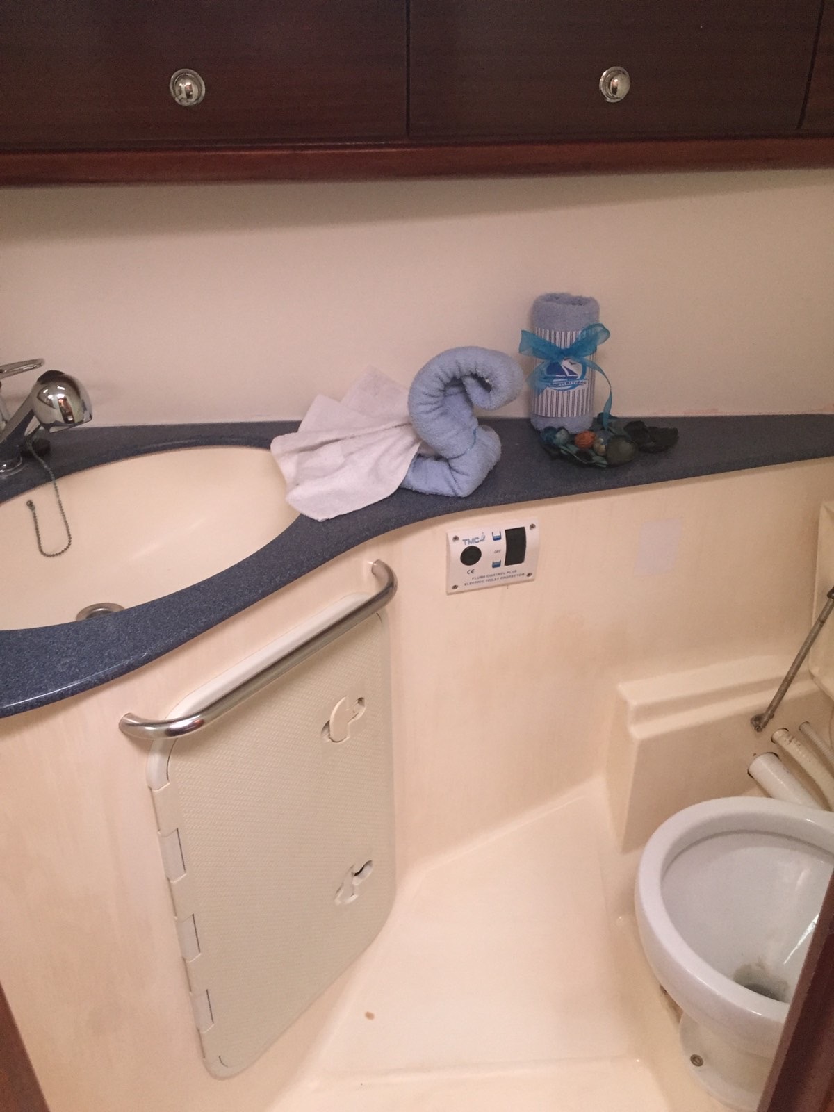 | Outside | 220 V-Landanschluss, Biminitop, Cockpitdusche, Cockpitlautsprecher, Cockpittisch, elektr. Ankerwinsch, Solaranlage, Sprayhood, Teak im Cockpit |