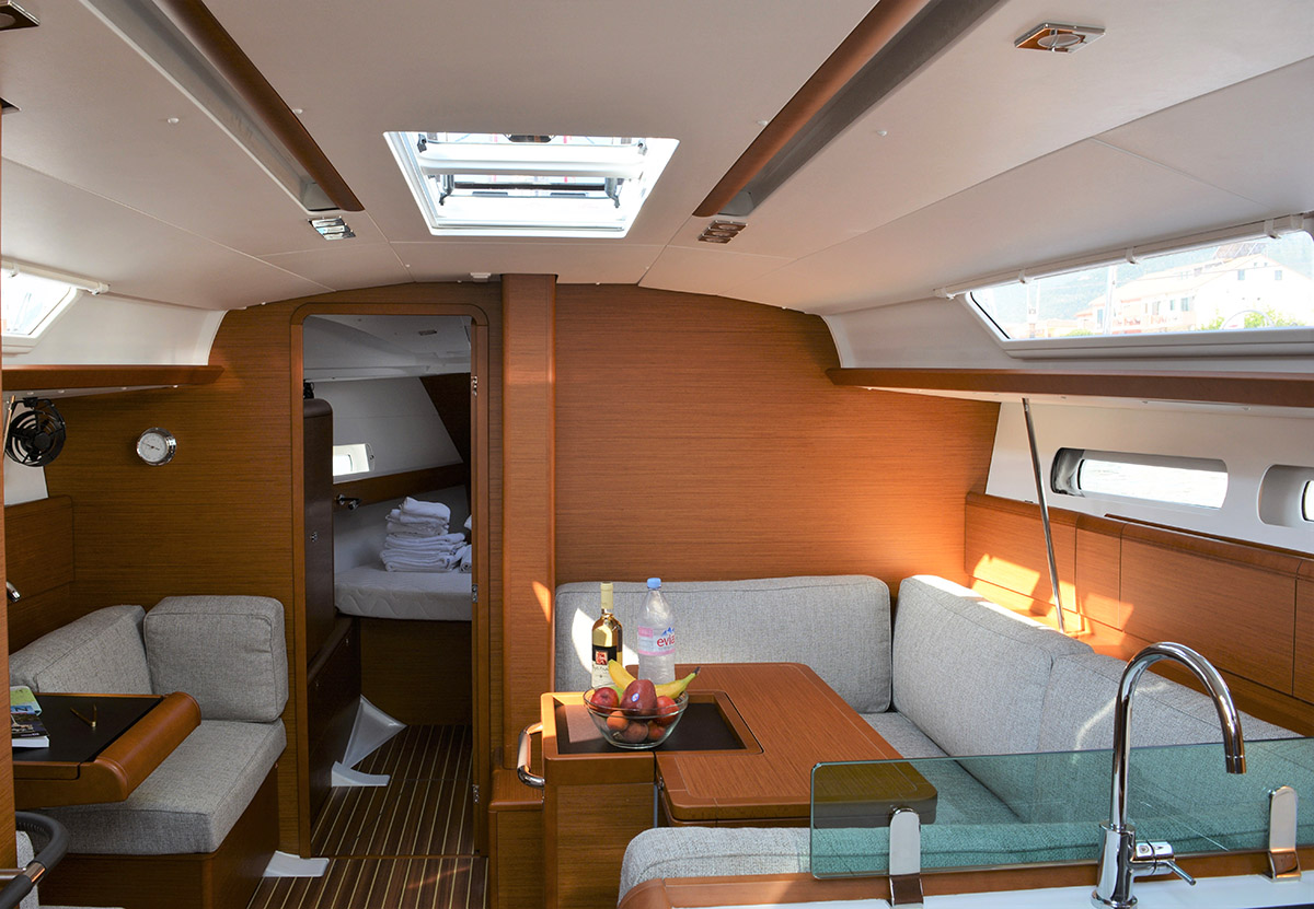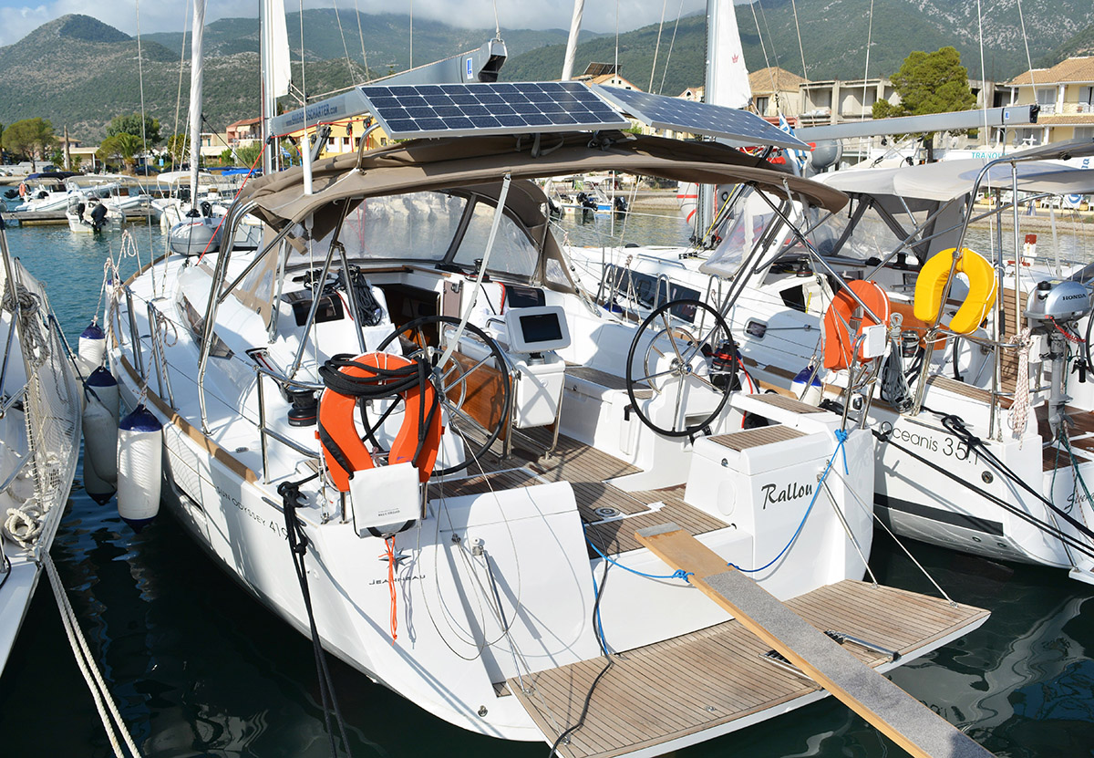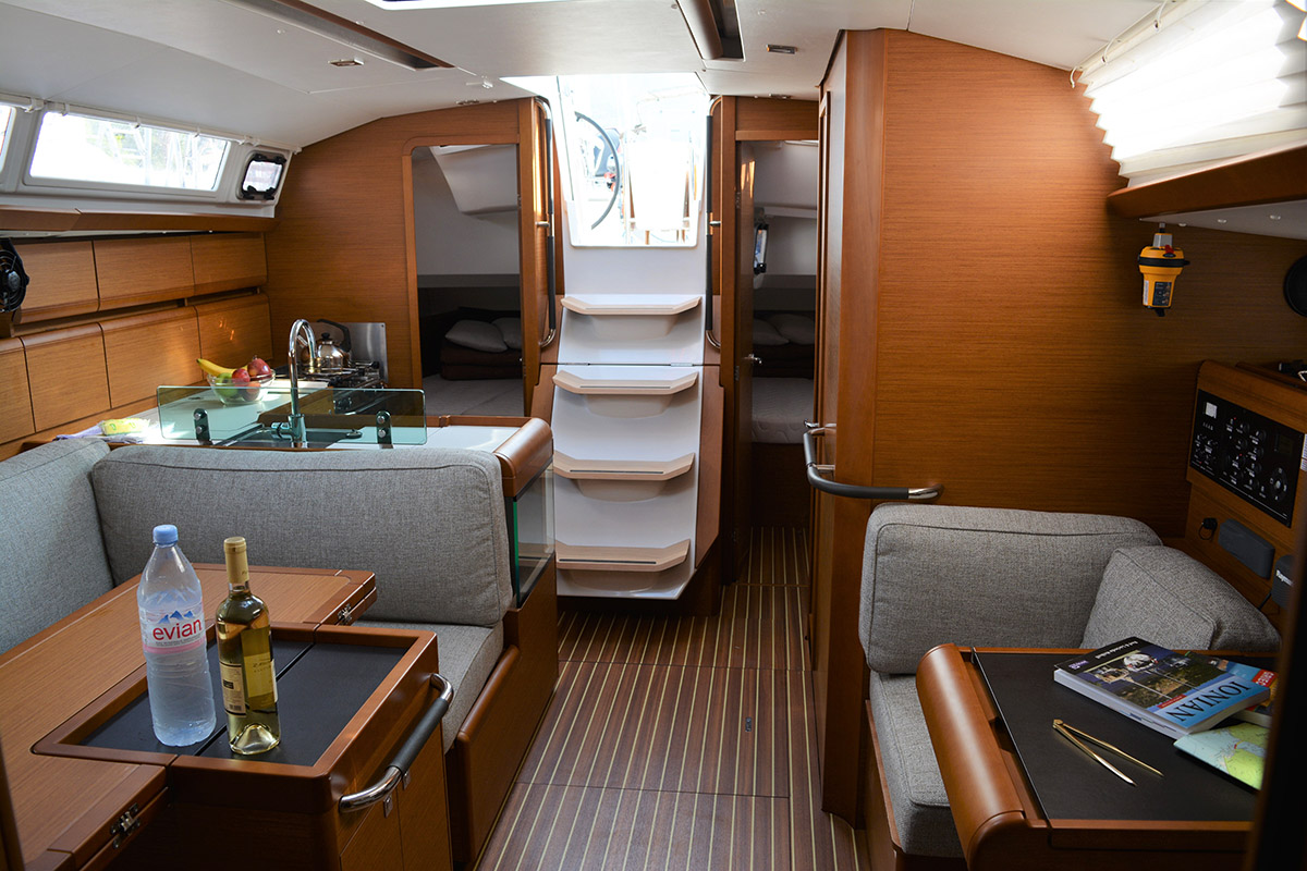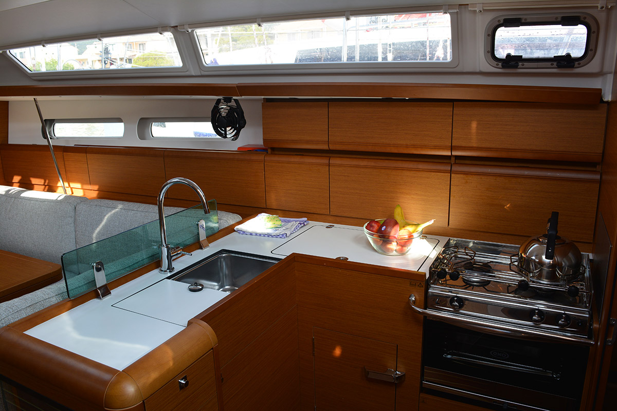| Outside | Badeleiter, Biminitop, Cockpitdusche, Cockpitlautsprecher, Cockpittisch, elektr. Ankerwinsch, Gangway, Segel-Flickwerkzeug, Solaranlage, Sonnensegel, Windex |