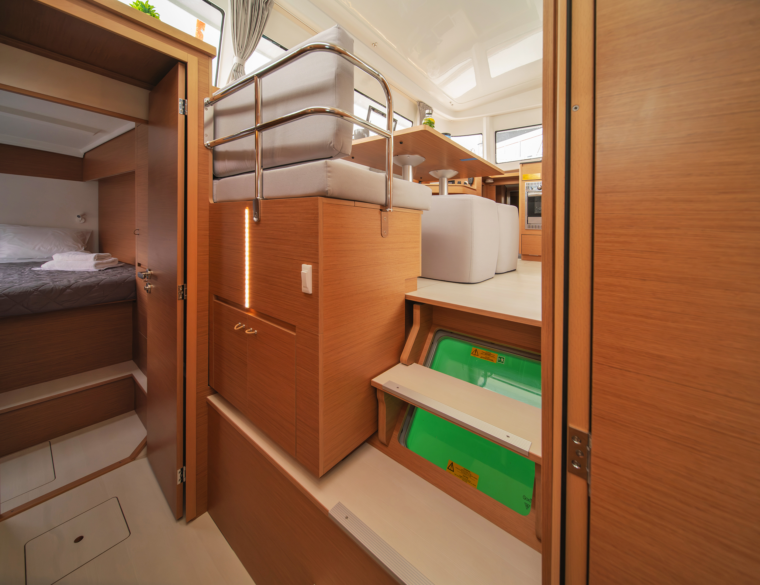 | Safety | Autopilot, Bootsmannstuhl, Bordapotheke, Bordwerkzeug, elektr. Bilgepumpe, Feststoffschwimmwesten, Feuerlöscher, Handbilgepumpe, Leuchtboje, Lifebelts, Motor-Ersatzteile, Nebelhorn, Notpinne, Notsignale, Radarreflektor, Rettungsinsel, Rettungskragen, Taschenlampe, UKW-Funk, Zweitanker |
