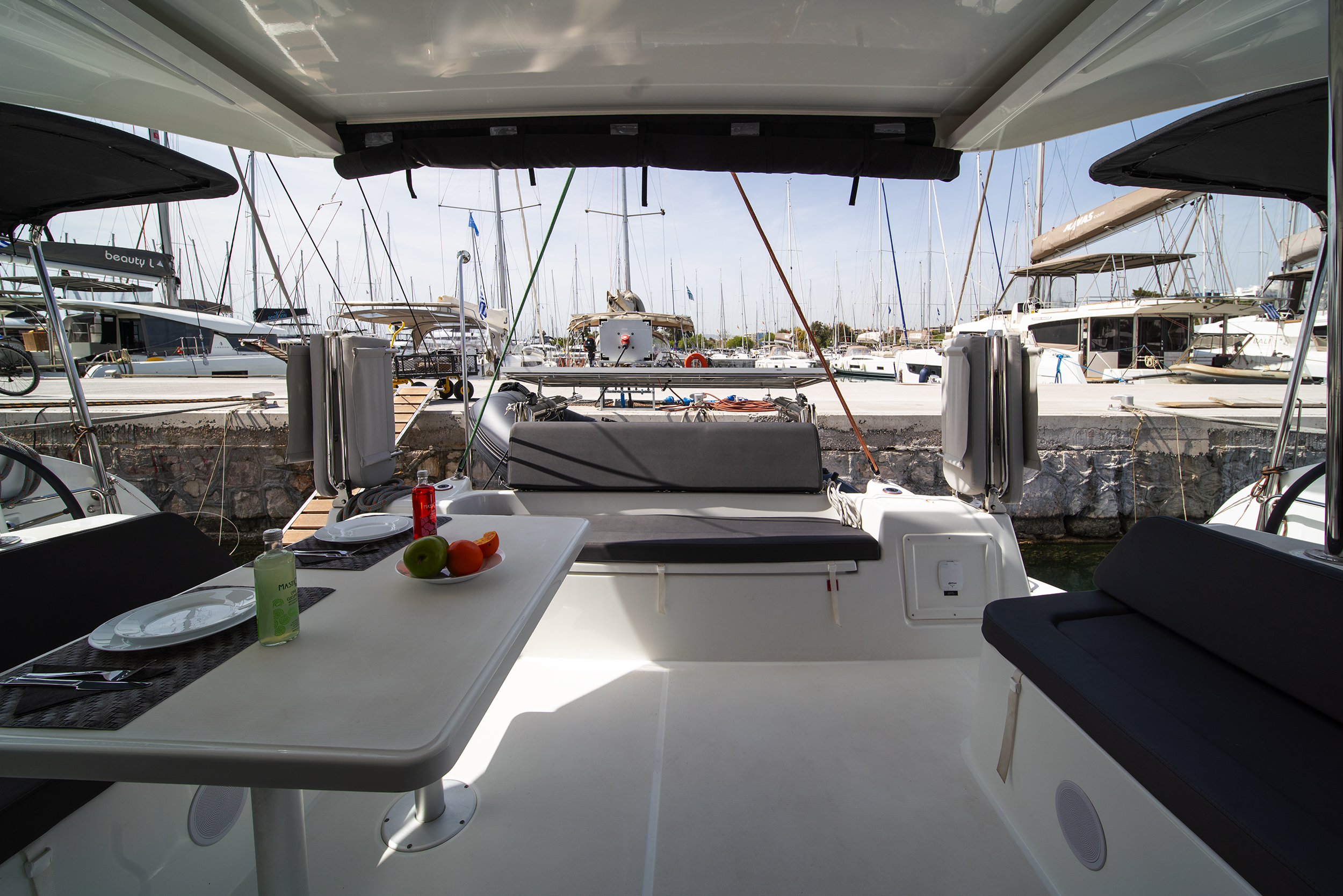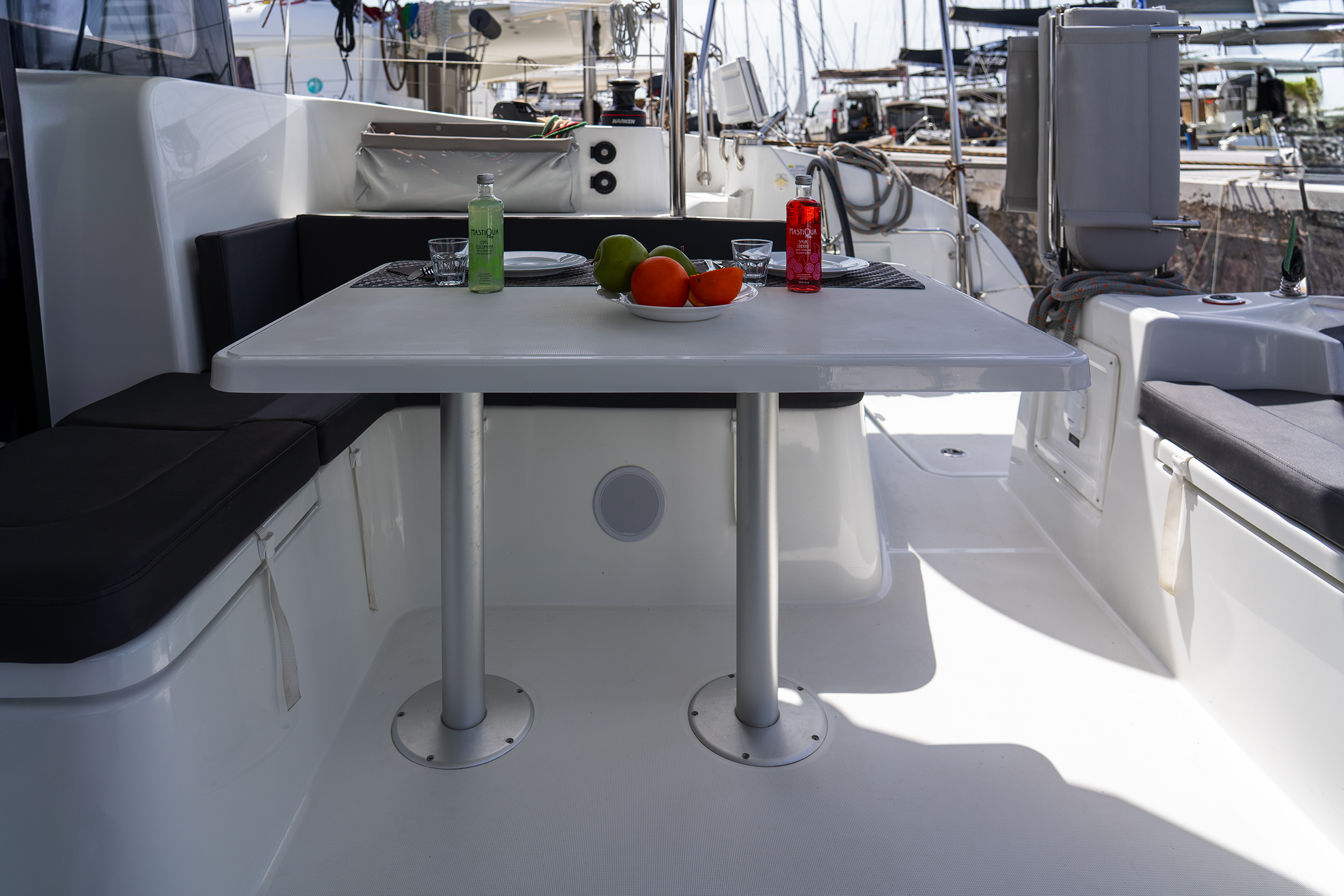 | Outside | 220 V-Landanschluss, Anker mit Kette, Badeleiter, Benzinkanister, Bootshaken, Cockpitdusche, Cockpitlautsprecher, Cockpitpolster, elektr. Ankerwinsch, elektr. Winsch, Fender, Festmacherleinen, Gangway, Kunststoff-Eimer (Pütz), Schnorchelausrüstung, Solaranlage, Wantenschneider, Wasserschlauch |