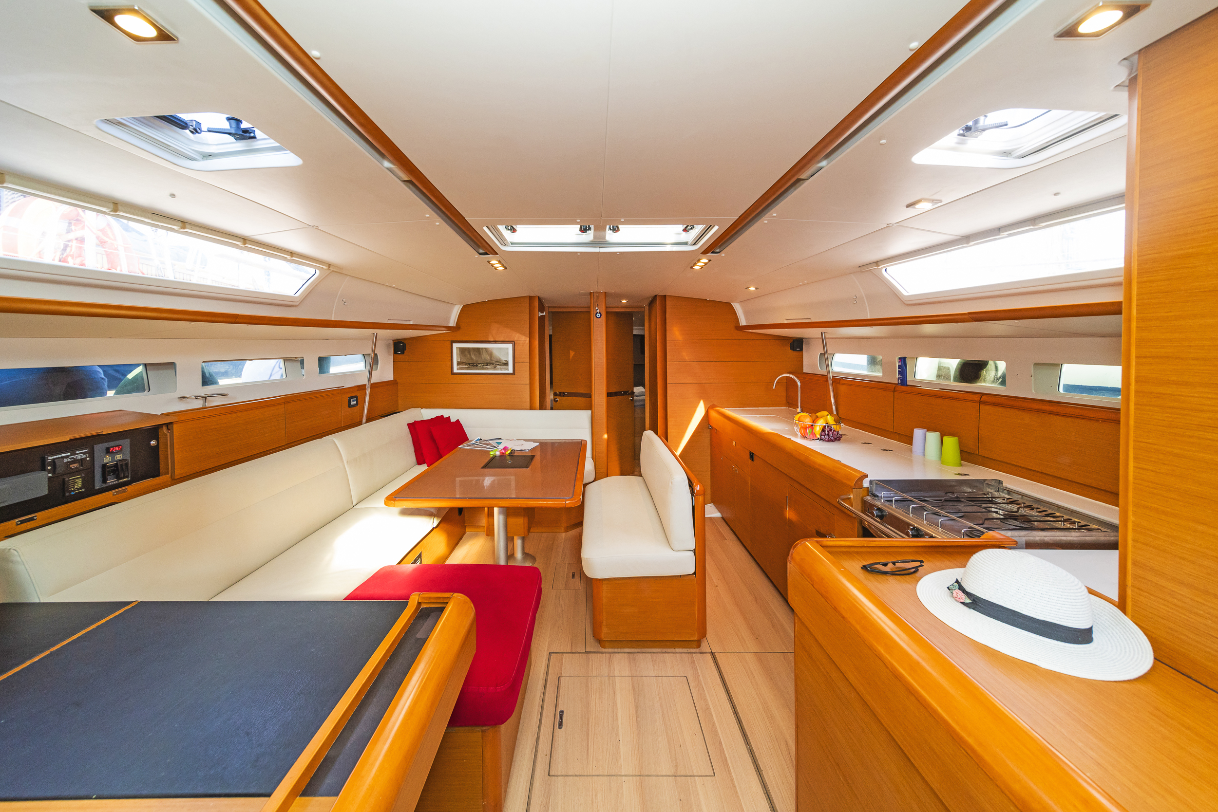 | Inside | 220V Steckdosen, Gasherd, Generator, Inverter 12V/220V, Klimaanlage (ohne Landstrombedarf), Ladegerät, Pantryausstattung, Radio mit CD/USB/MP3/Aux-In/Bluetooth, USB Steckdose, Ventilatoren in Kabinen, Watermaker, WC (elektr.) |