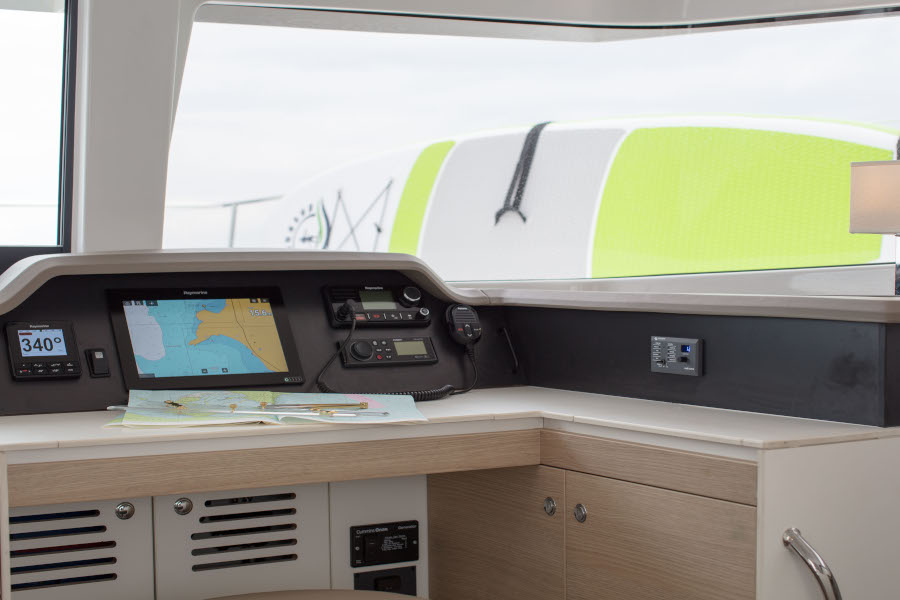 | Navigation | Echolot, GPS mit Kartenplotter auf Flybridge, Seekarten, Sumlog, Windmesser |