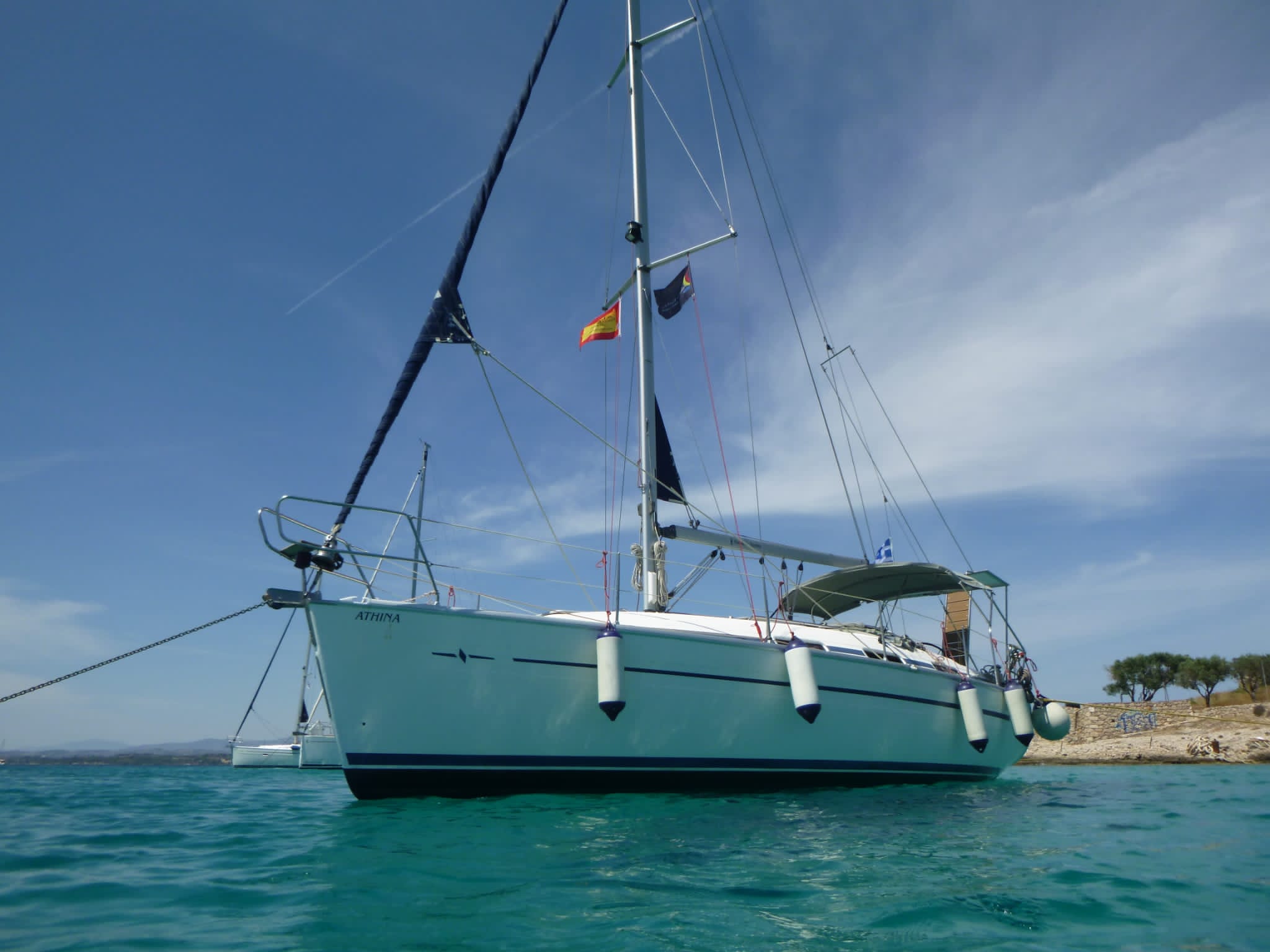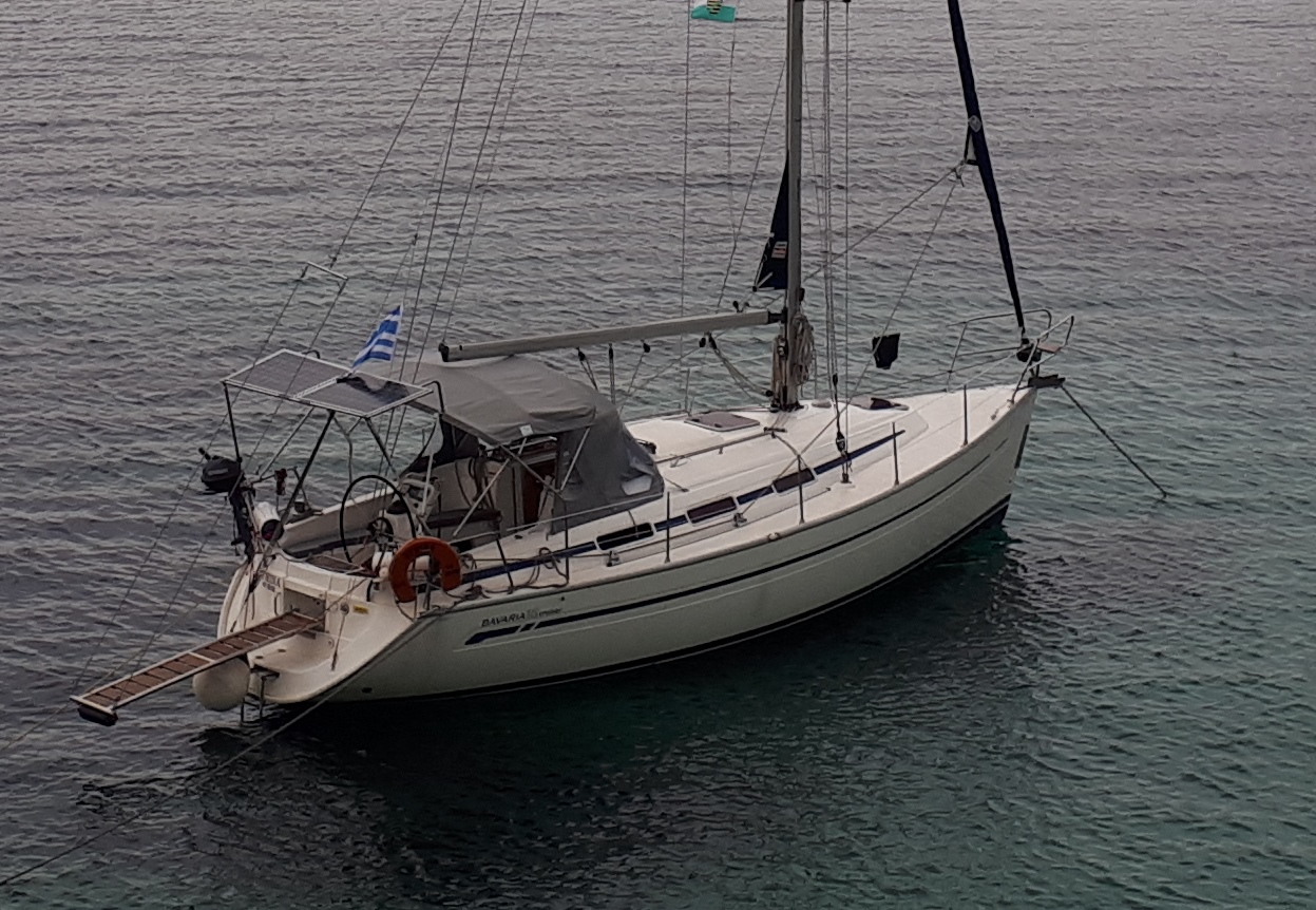Eine alte Bavaria 32c, aber in recht gutem Zustand. Das Steuerrad ist unnötig groß, so dass man nur kletternderweise in die Pflicht kommt. Die Ankerwinde sitzt ab Werk zu tief im Rumpf. Daher läuft die Kette in einem ungünstigen Winkel und kann leicht von der Winde abrutschen und dann ausrauschen (Ist uns 2mal passiert). Die Ankerbedienung ist verlängert worden - eine schöne Sache, auch wenn das Kabel trotzdem ein kleines bisschen zu kurz ist, um vom Steuerstand aus bedient zu werden. Insgesamt ein gutes Boot.
