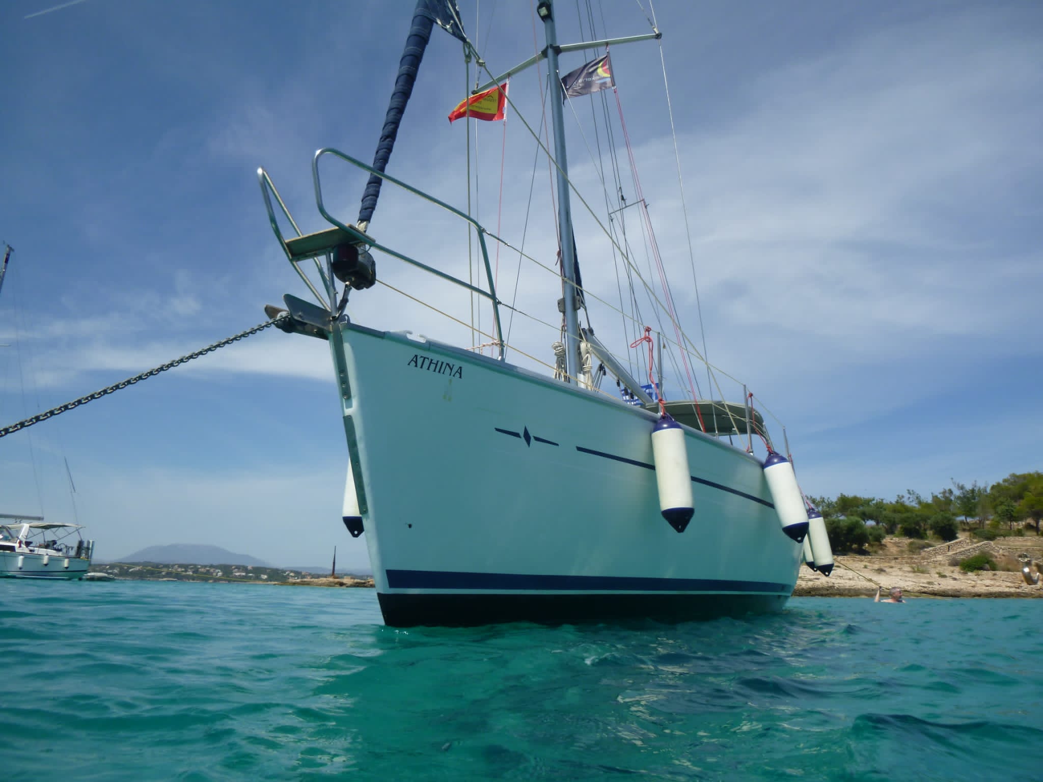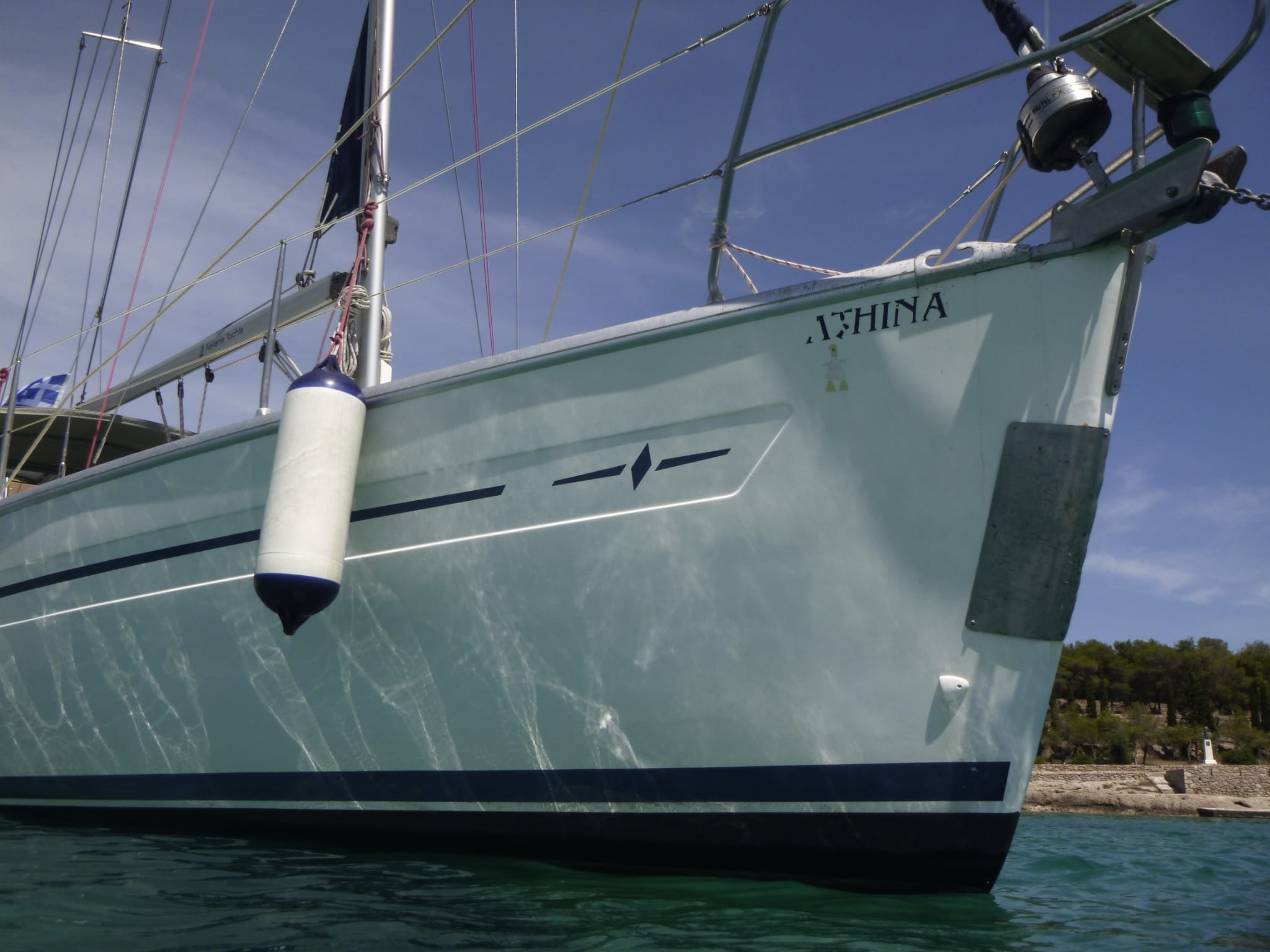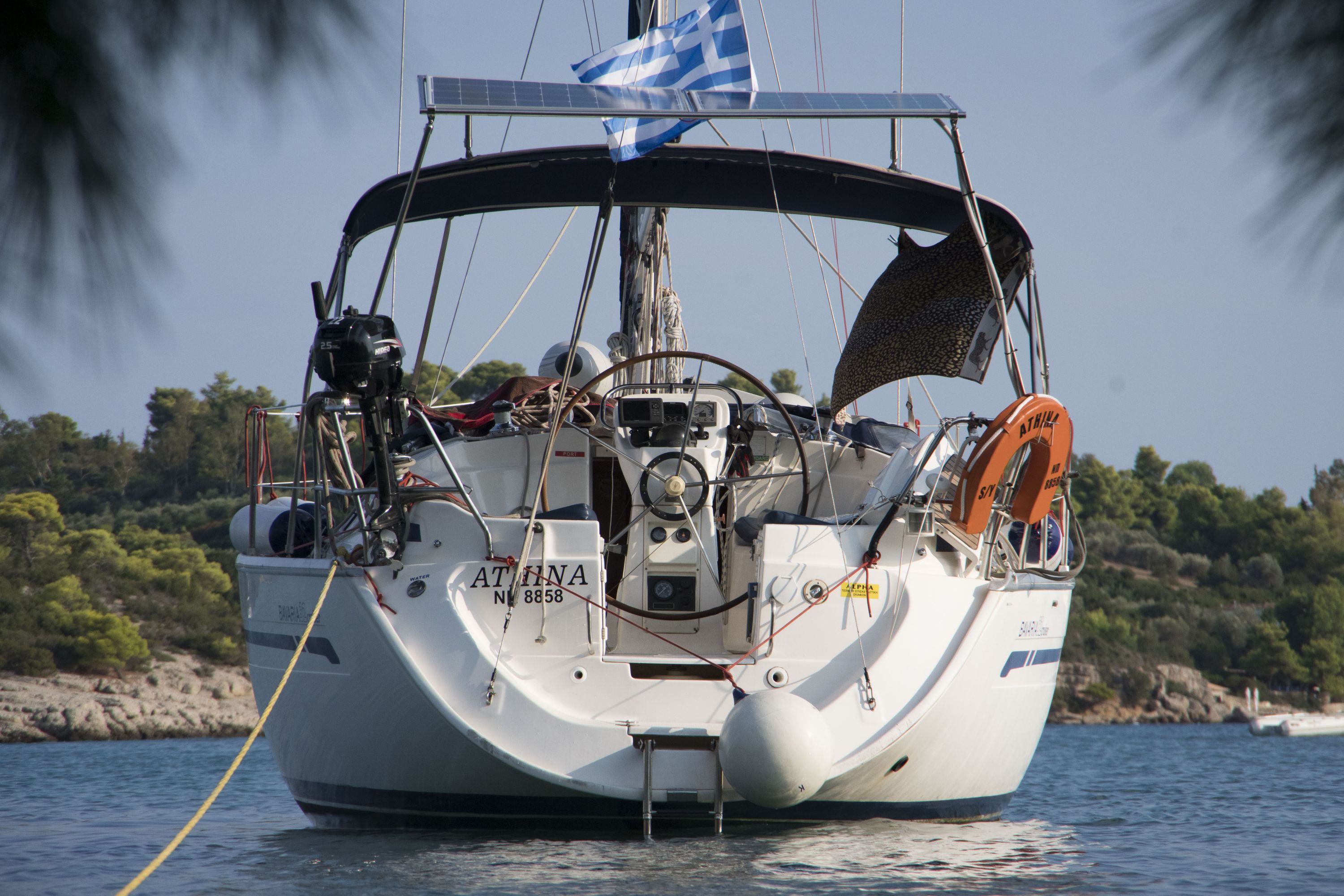 Die "Athina" ist die beste Yacht, die wir bisher gechartert haben. Zwar etwas älter, aber für einen Törn im Mittelmeer für zwei Personen ideal ausgestattet. Ob das die fest installierte Gangway ist, das gut dimensionierte Solarpanel, oder die Fernbedienung der Ankerwinsch, die so verlängert wurde, dass man sie bis ins Cockpit nehmen kann. Beim Anlegen römisch-katholisch zu zweit war letzteres äußerst hilfreich.