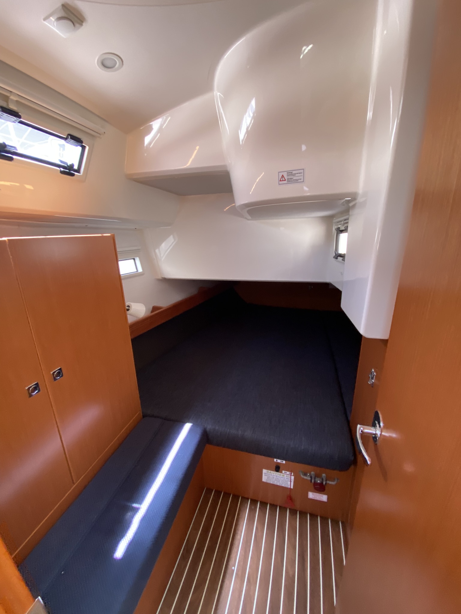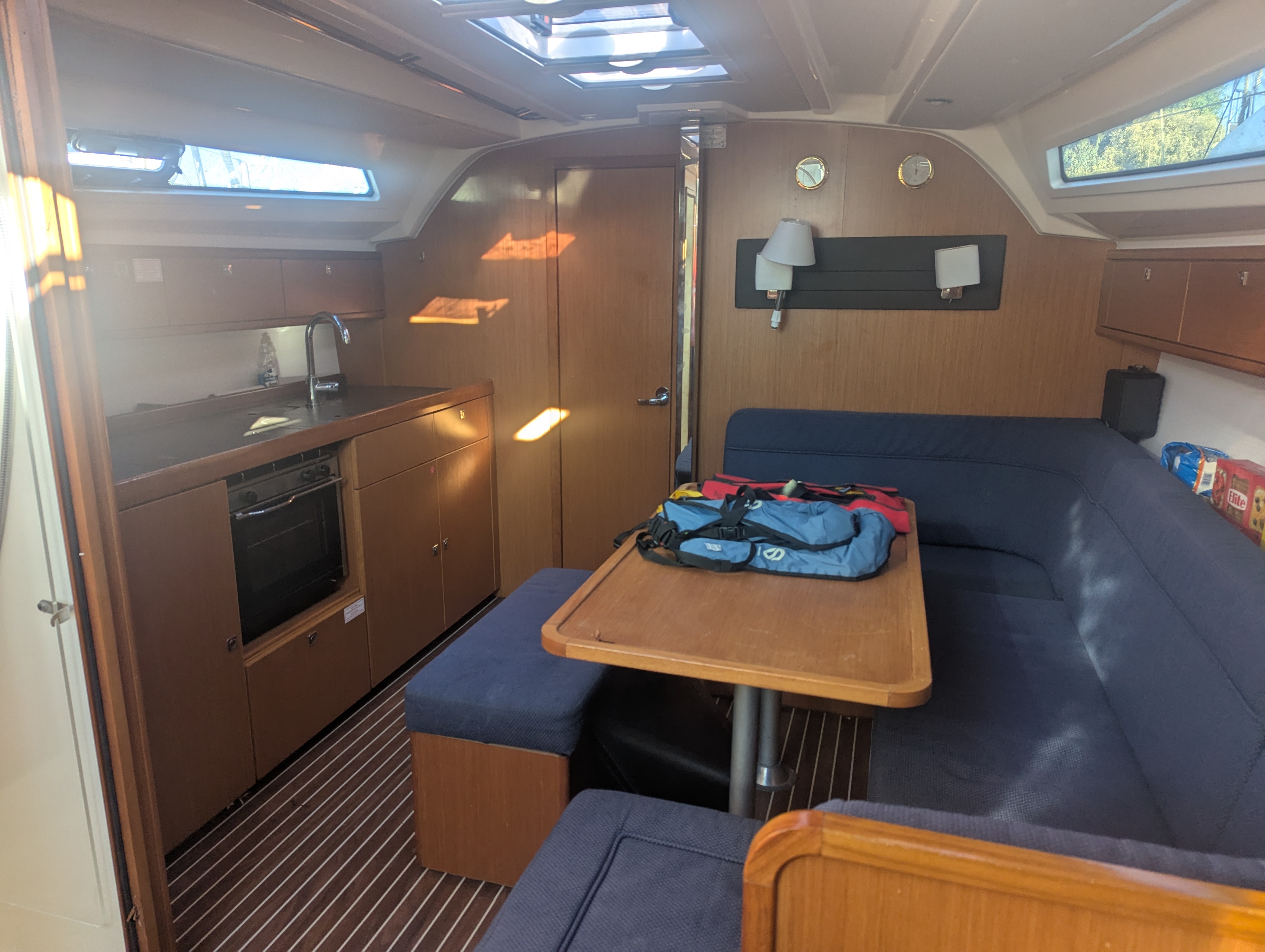 Wir bekamen bereits um 13.00 Uhr (statt 17.00 Uhr) die Einweisung auf die Yacht. Das Personal ist äußerst freundlich und hilft bei Fragen wie Problemen bereitwillig weiter. Aus den vorangegangenen Erfahrungsberichte können wir einige Kleinigkeiten ebenfalls bestätigen: sehr geringe Kühlleistung des Kühlschranks; geringe Leistung/ kleinste Gasflamme des Backofens; die vordere Toilette ist zwar nicht übergelaufen, jedoch kam es auch hier zu nassem Boden: vor dem Ablegen haben wir stets das Wasser aus der Toilette nach draußen gepumpt und das (Spül-)Wasserventil geschlossen, damit sich dir Toilette leert und kein Wasser in der Toilette steht bleibt, welches bei Krängung dann überschwappt. Im Gegensatz zur hinteren Toilette, füllte sich die vordere trotz geschlossener Ventile stets mit Frischwasser. Dies führte dann zu nassem Fußboden an windreichen Tagen. An Bord befinden sich nur Feststoffwesten, keine Automatikwesten. Zu einem Aufpreis konnten wir diese vor Ort noch hinzubuchen.