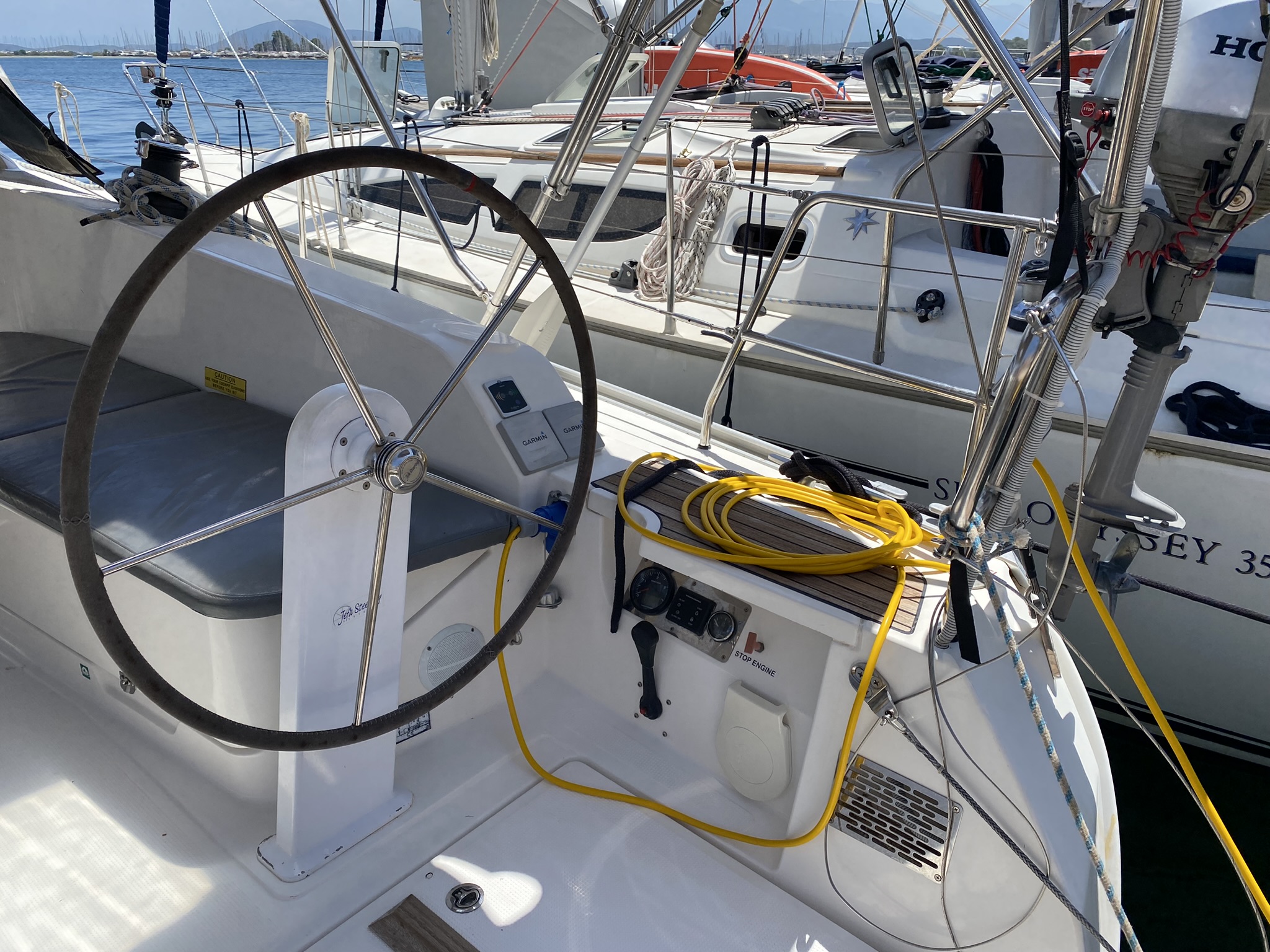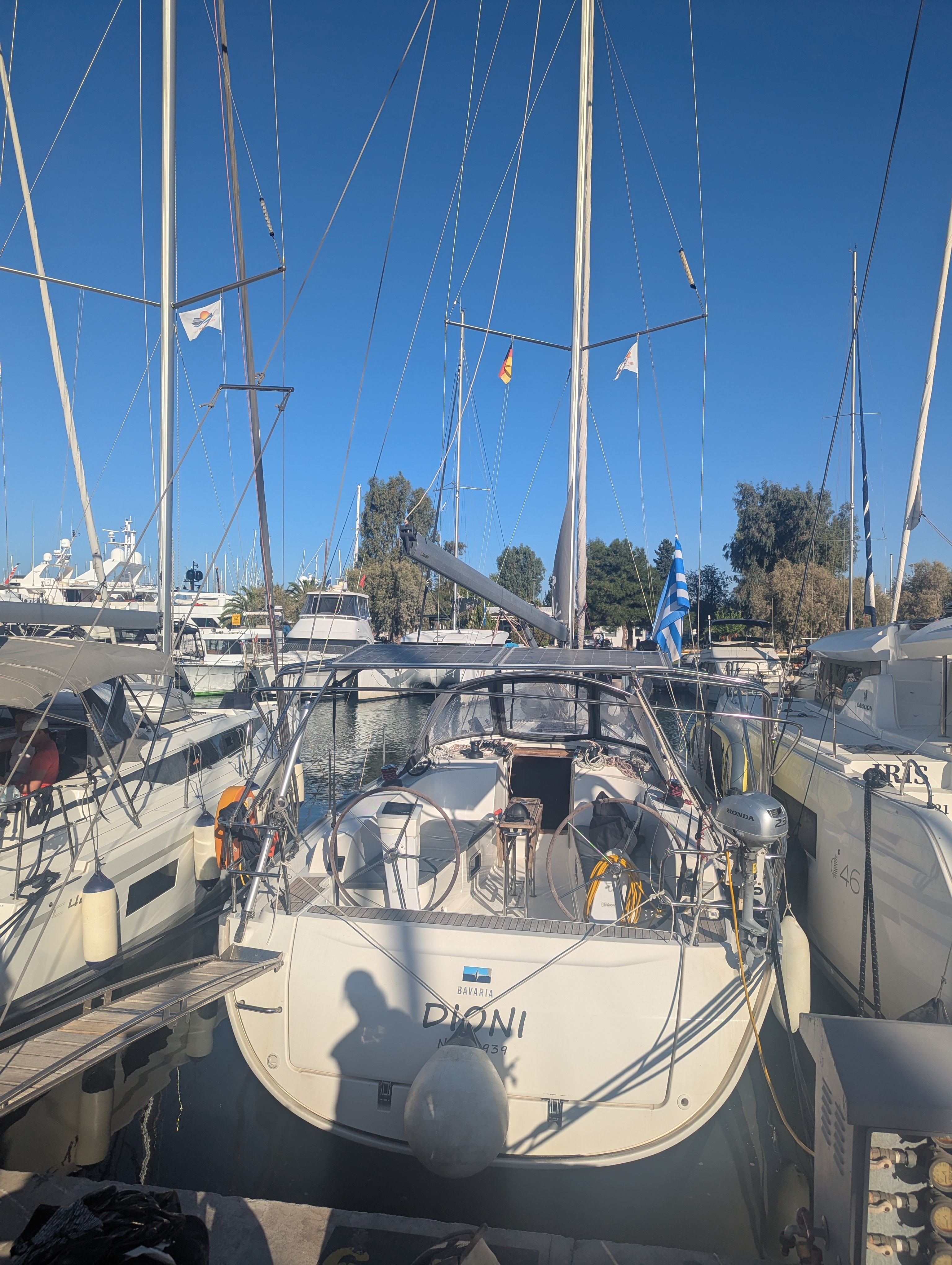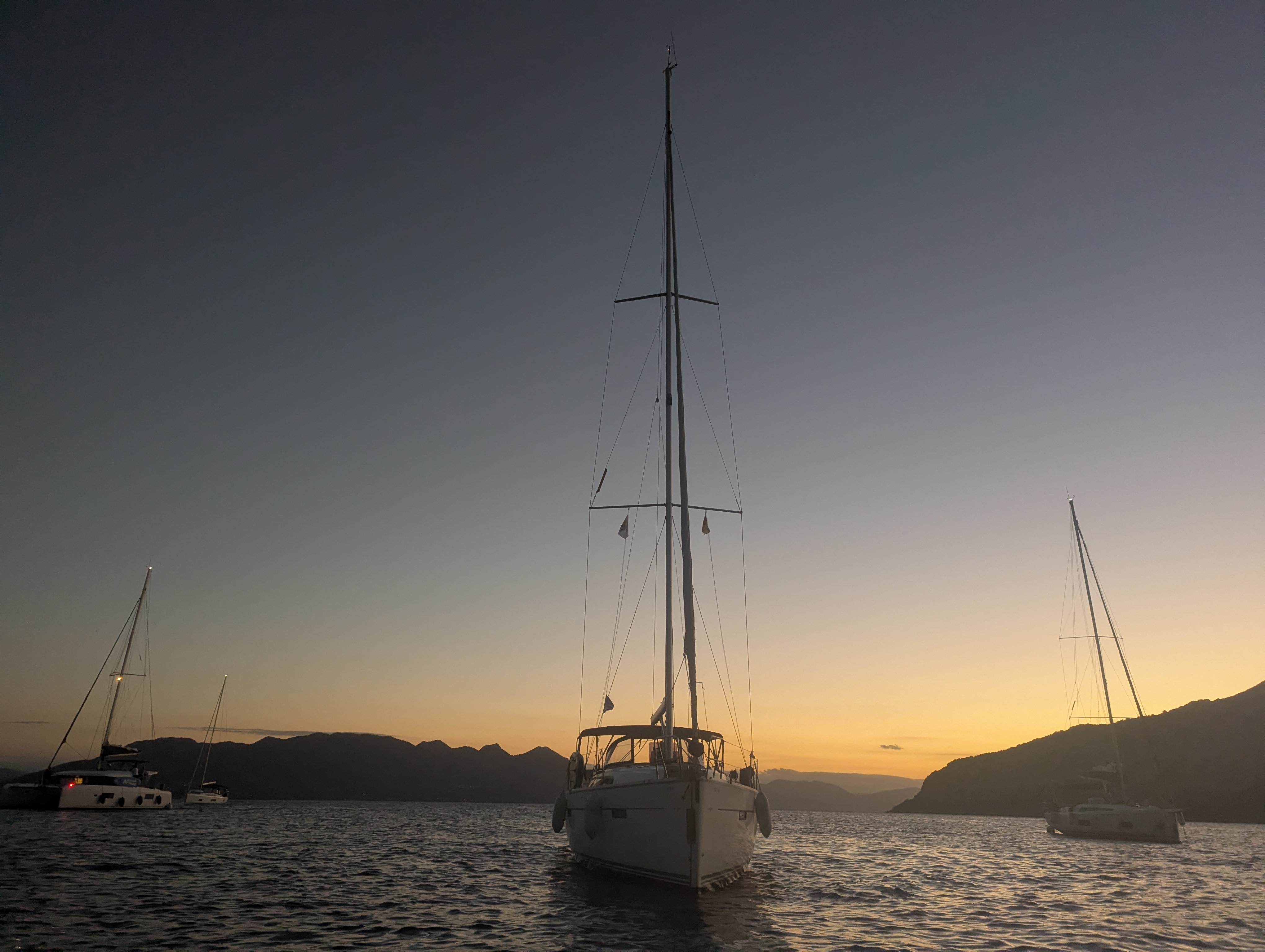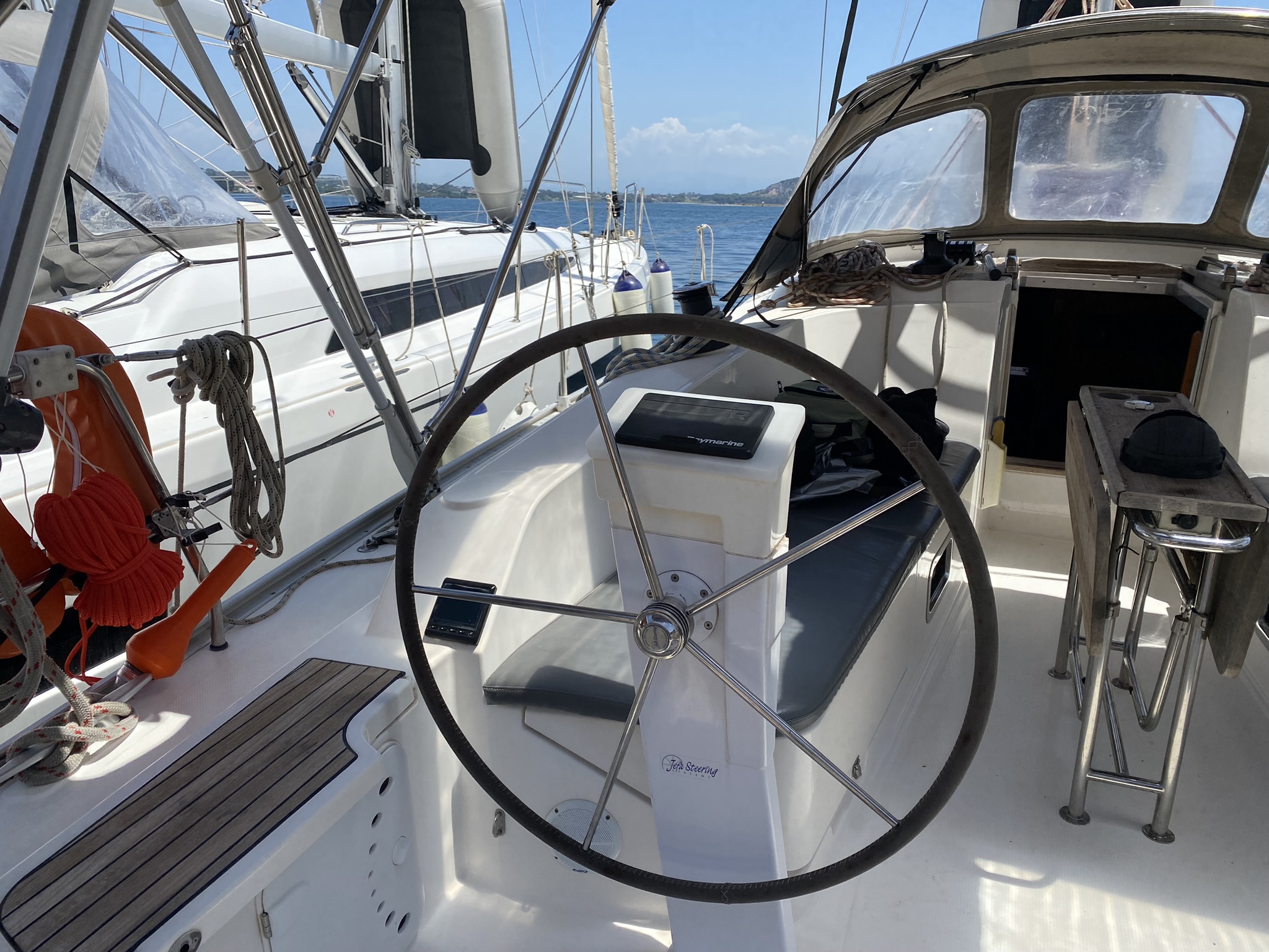 An der Yacht waren einige Dinge nicht in Ordnung aber wir konnten damit leben. Das Toplicht funktionierte nicht was beim ankern nötig war. In der Bilge stand etwas Wasser aus einer der Duschen. Dieses wurde aber im laufe der Zeit nicht mehr. Die Notlampe an der Rettungsleine hatte keine Batterien und es waren nicht genug längere Leinen an Bord.