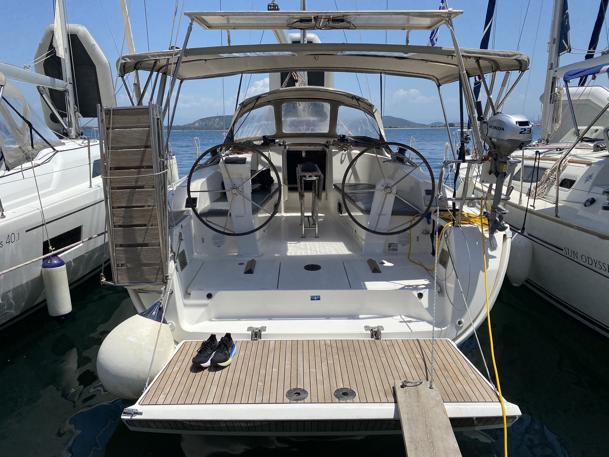 | Outside | 12 V-Anschluss, Badeleiter, Badeplattform, Biminitop, Cockpitdusche, Cockpitlautsprecher, Cockpitpolster, Cockpittisch, elektr. Ankerwinsch, Gangway, Selbstholende Winschen, Solaranlage, Sprayhood, Windex |