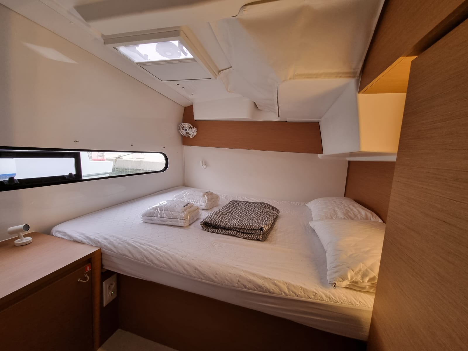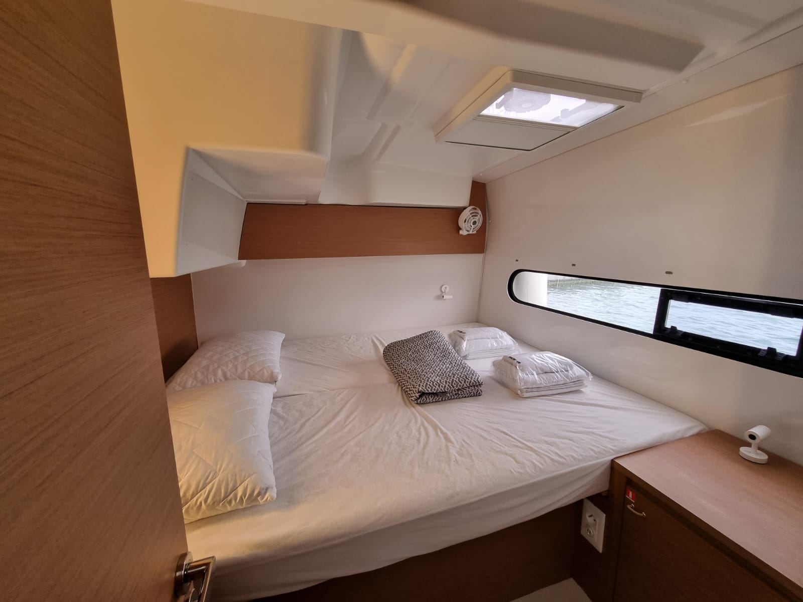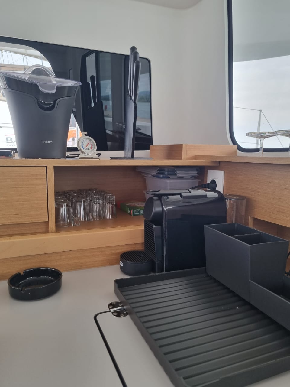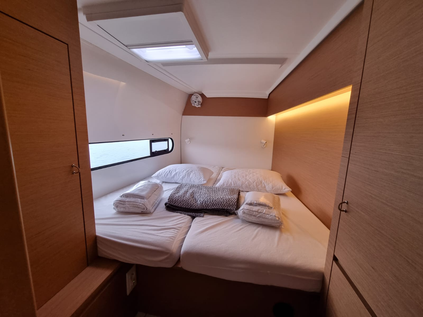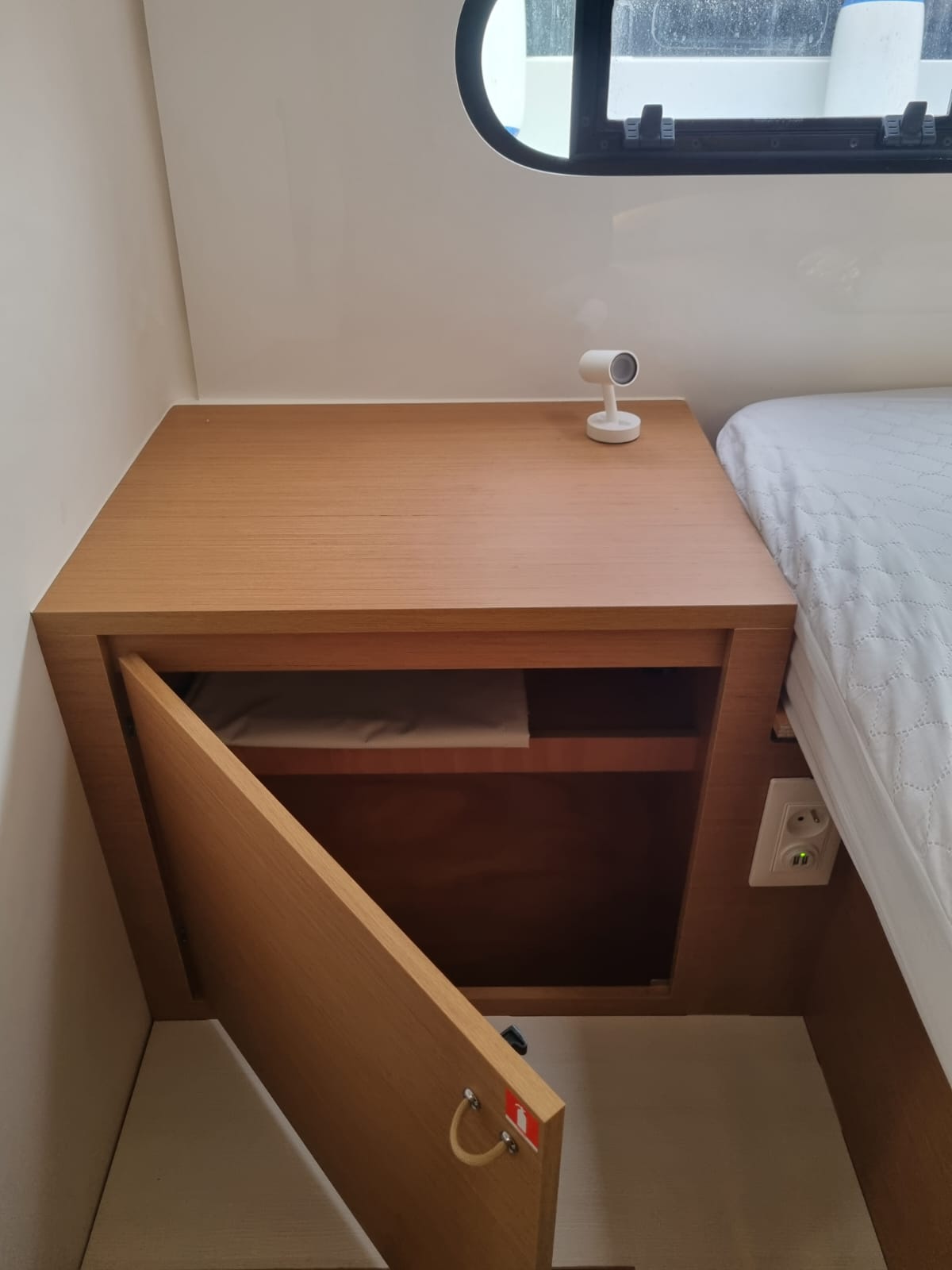 | Inside | 2. Kühlschrank, Eiswürfelmaschine, Espresso Maschine, FUSION Sound System, Generator, Inverter 12V/220V, Klimaanlage (ohne Landstrombedarf), Radio mit Bluetooth, TV, USB Steckdosen in Salon und Kabinen, Ventilatoren in Salon und Kabinen, Watermaker, WC (elektr.), Weinkühlschrank |