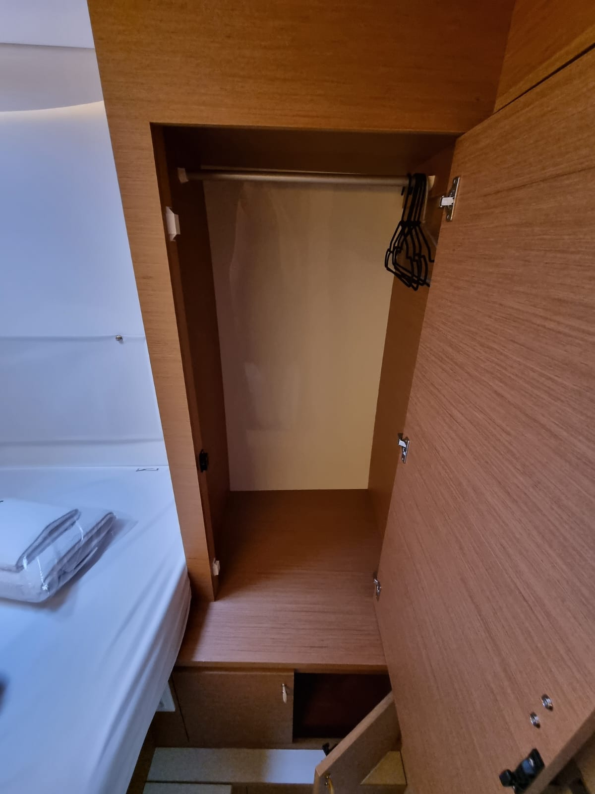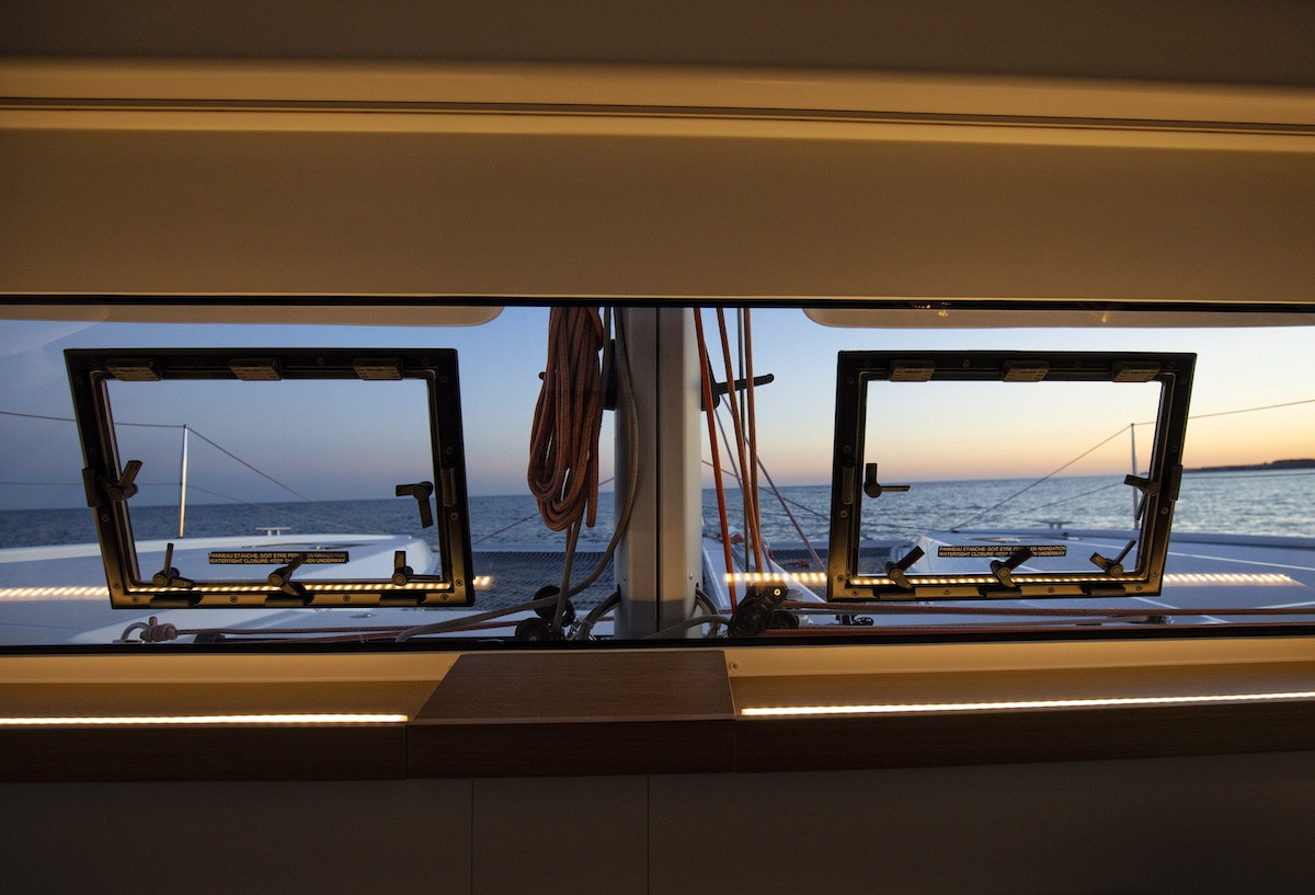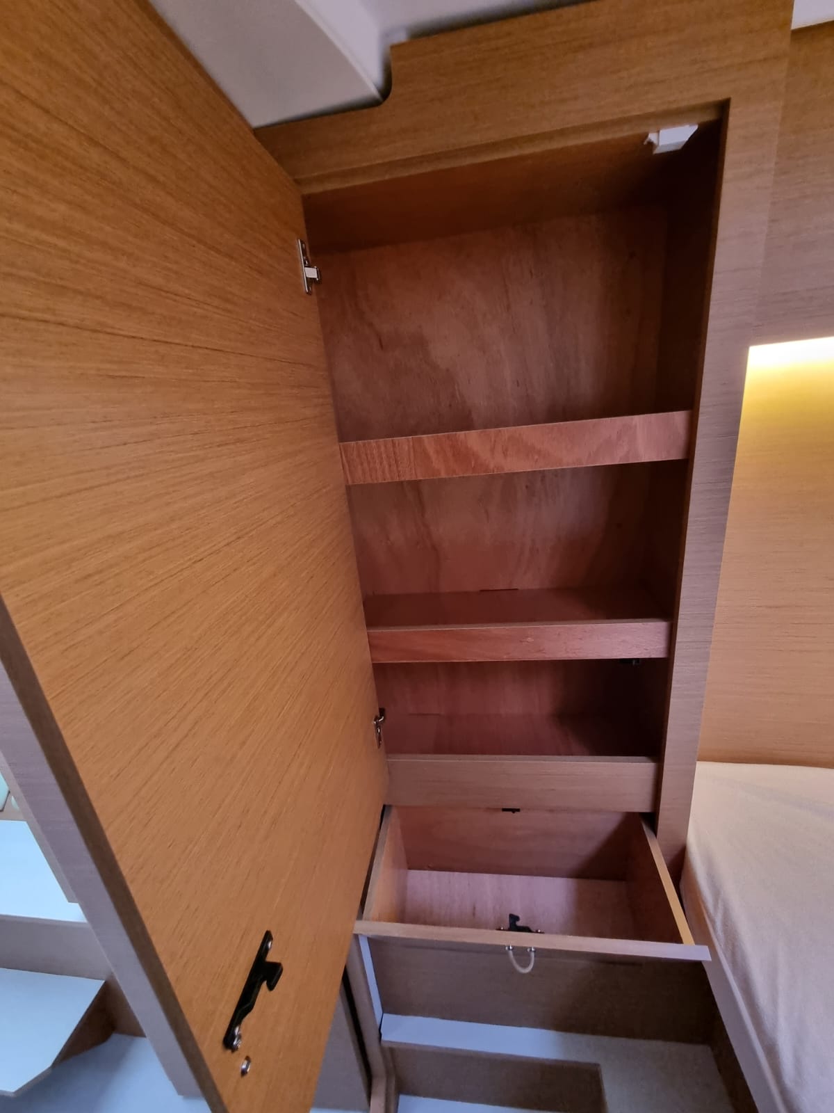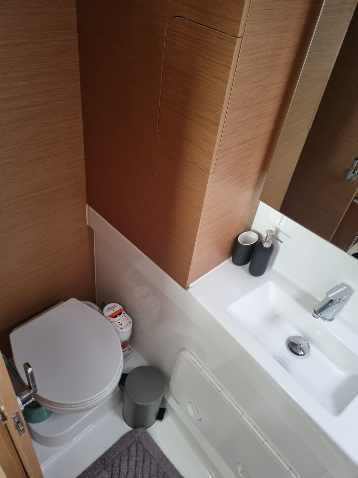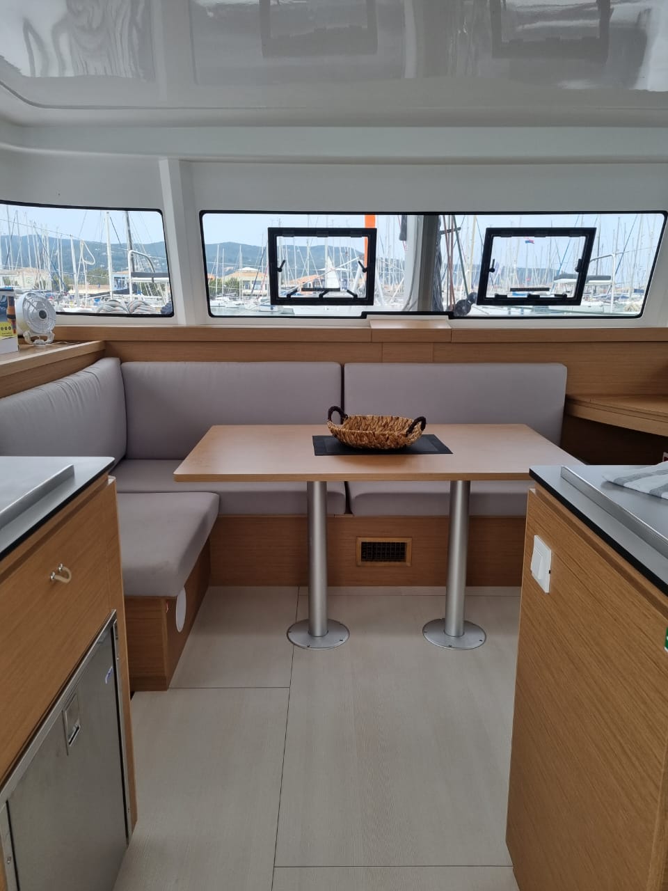 | Inside | 2. Kühlschrank, Eiswürfelmaschine, Espresso Maschine, FUSION Sound System, Generator, Inverter 12V/220V, Klimaanlage (ohne Landstrombedarf), Radio mit Bluetooth, TV, USB Steckdosen in Salon und Kabinen, Ventilatoren in Salon und Kabinen, Watermaker, WC (elektr.), Weinkühlschrank |