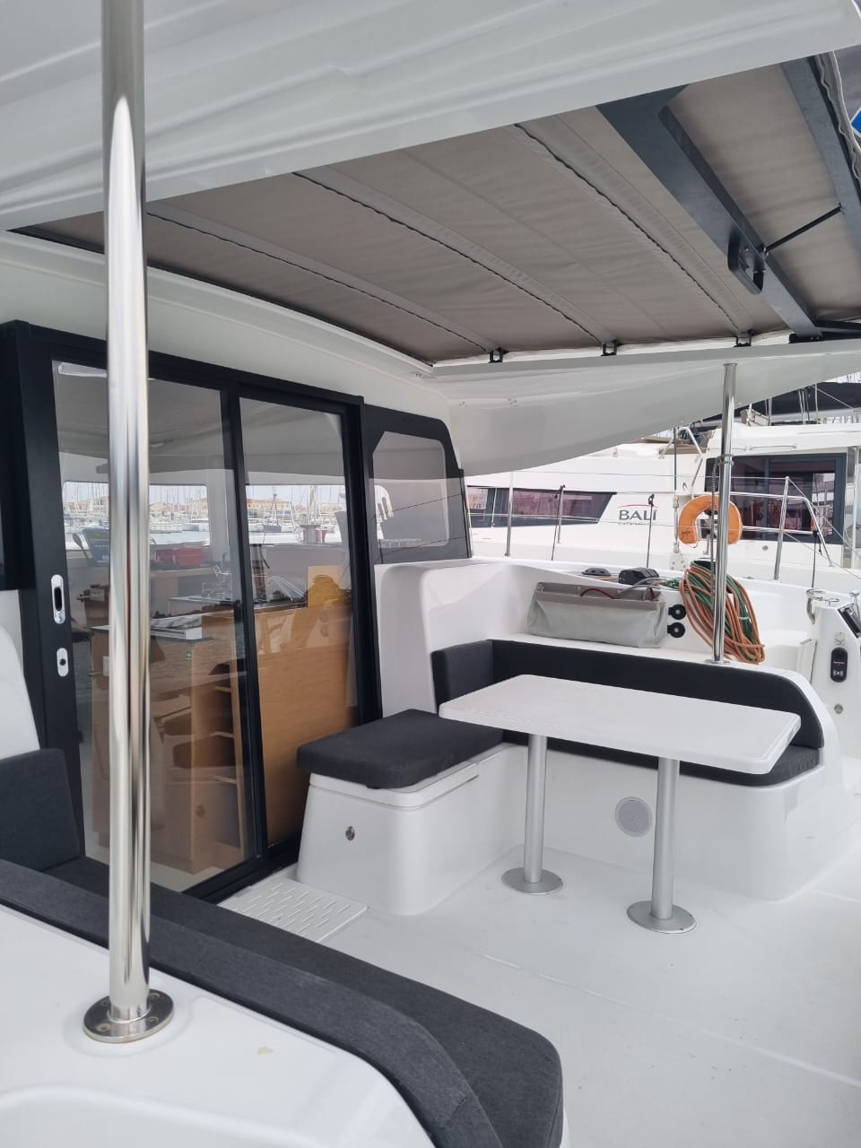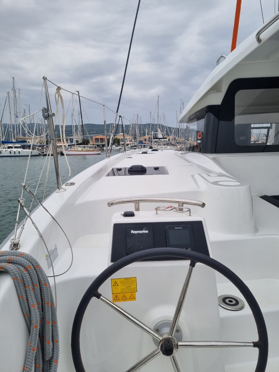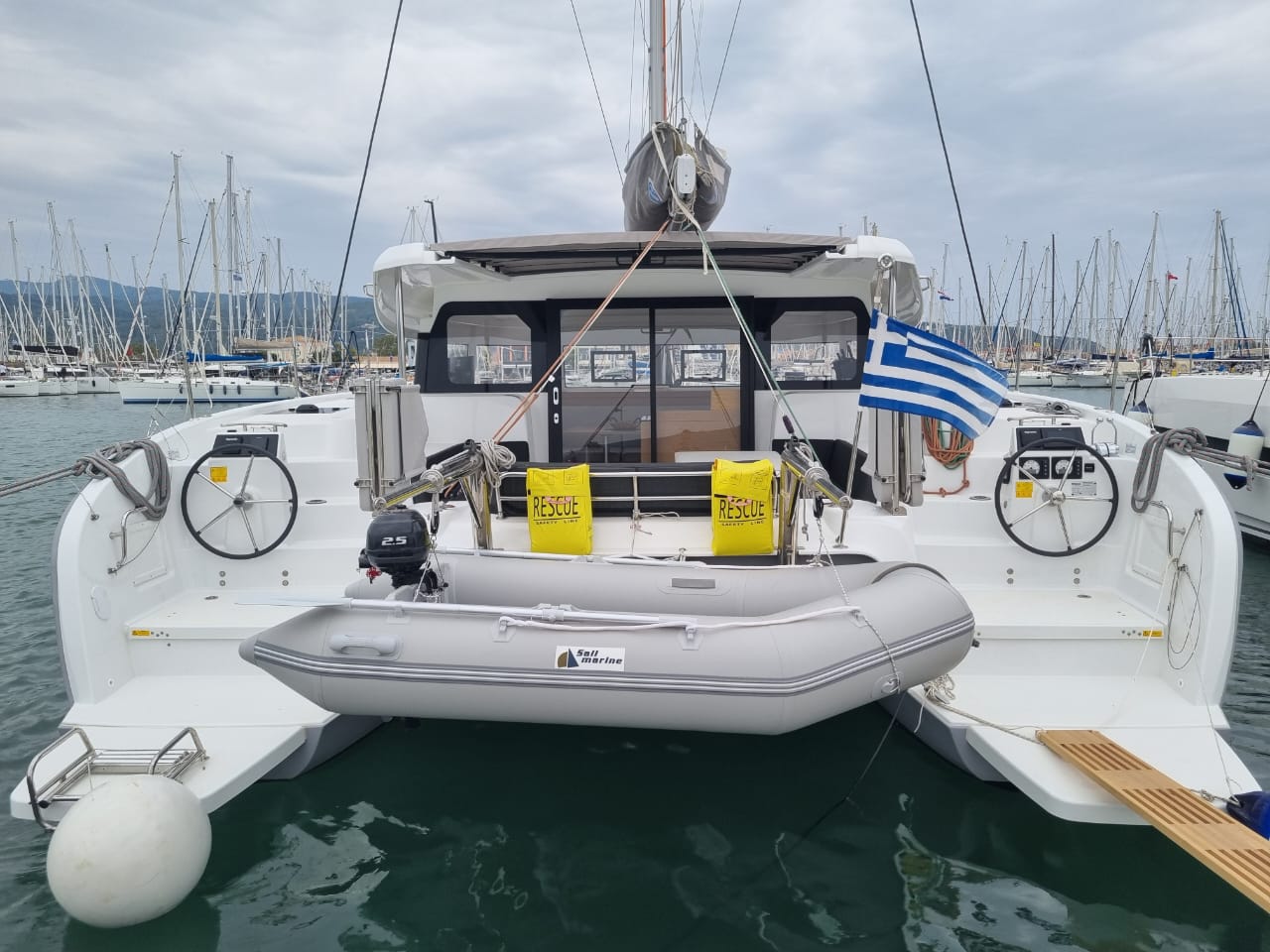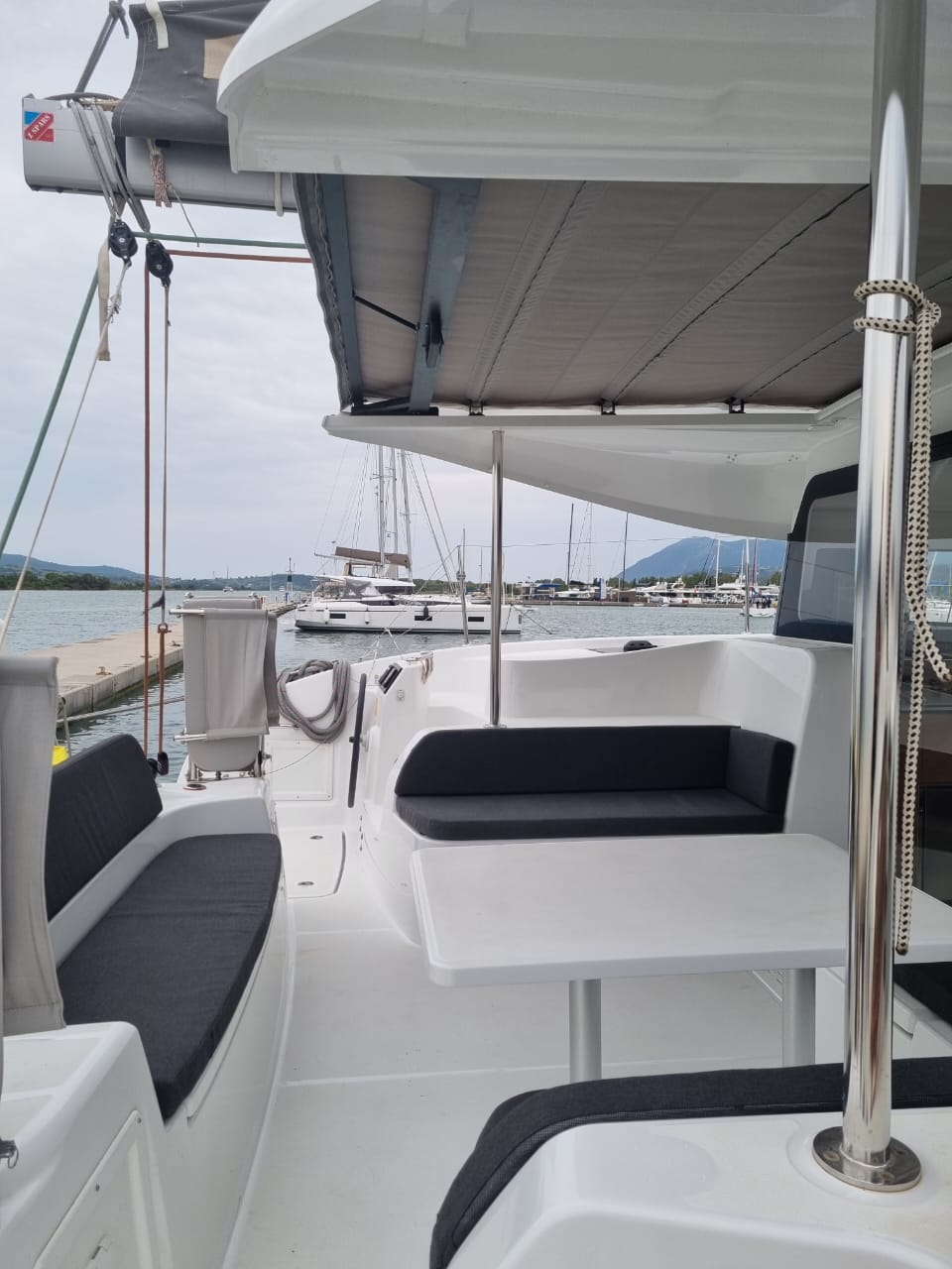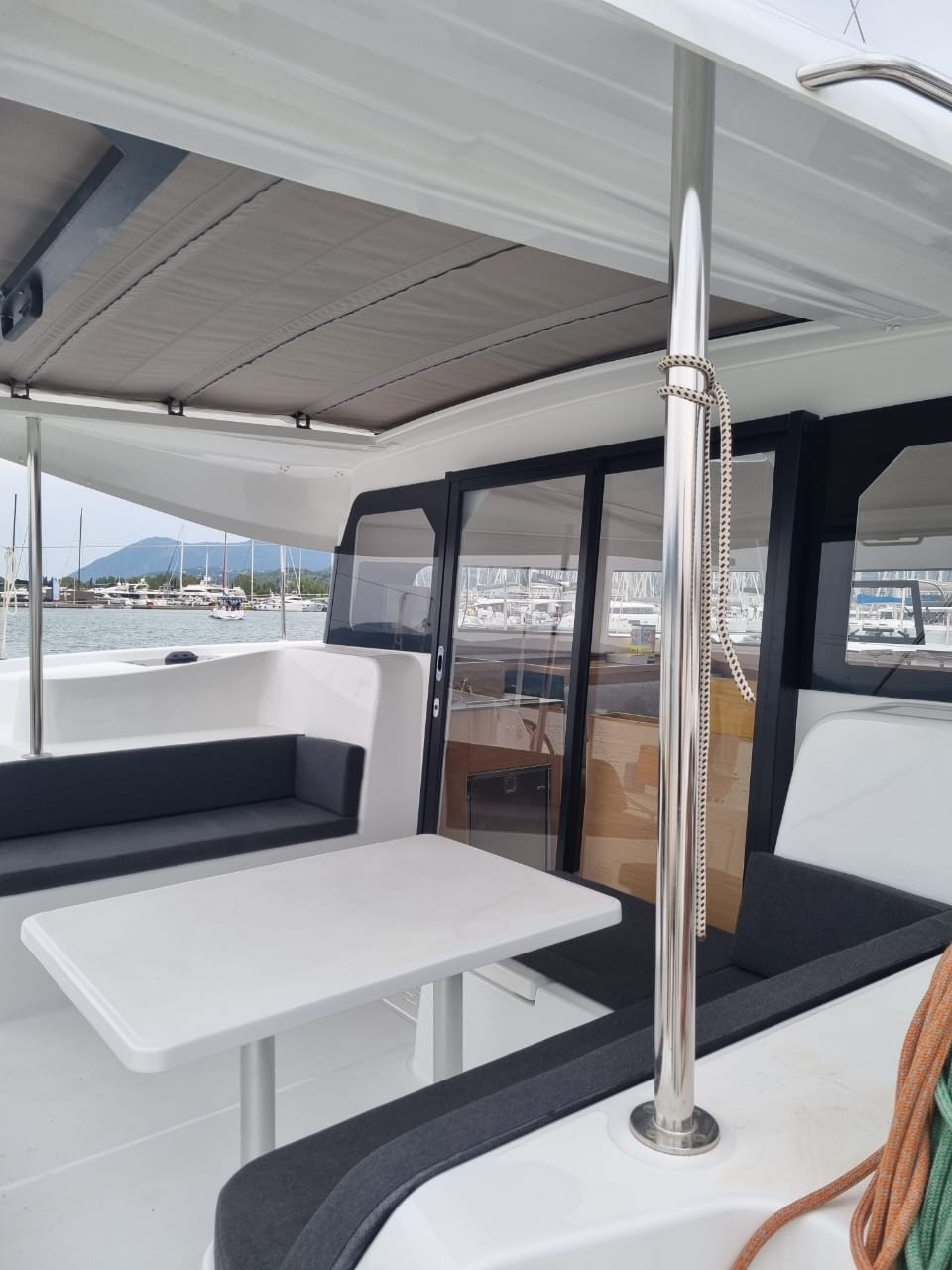 | Inside | 2. Kühlschrank, Eiswürfelmaschine, Espresso Maschine, FUSION Sound System, Generator, Inverter 12V/220V, Klimaanlage (ohne Landstrombedarf), Radio mit Bluetooth, TV, USB Steckdosen in Salon und Kabinen, Ventilatoren in Salon und Kabinen, Watermaker, WC (elektr.), Weinkühlschrank |