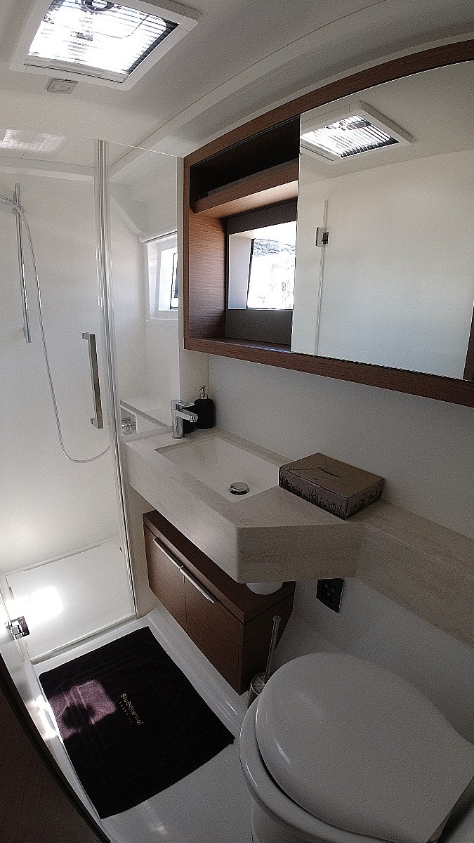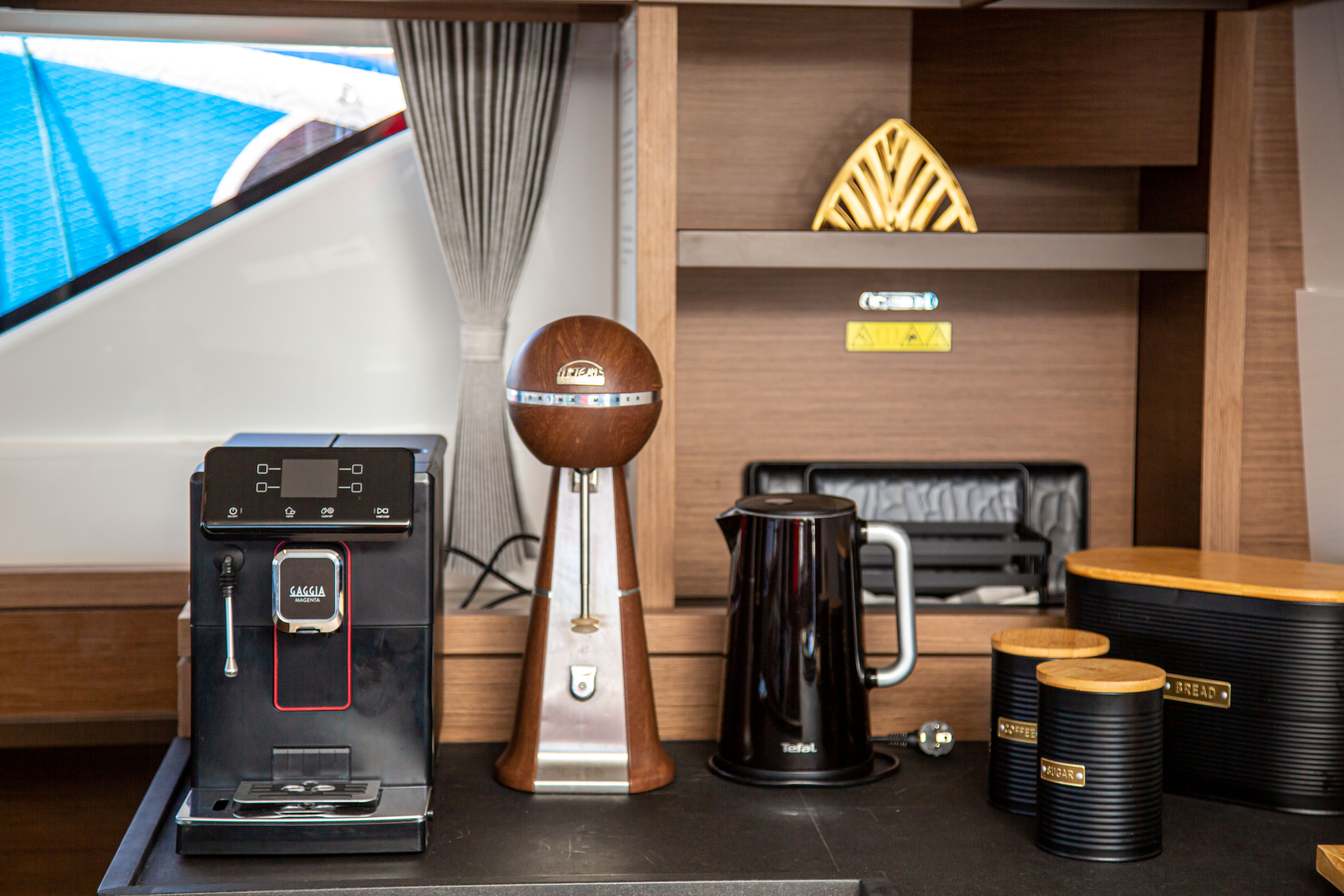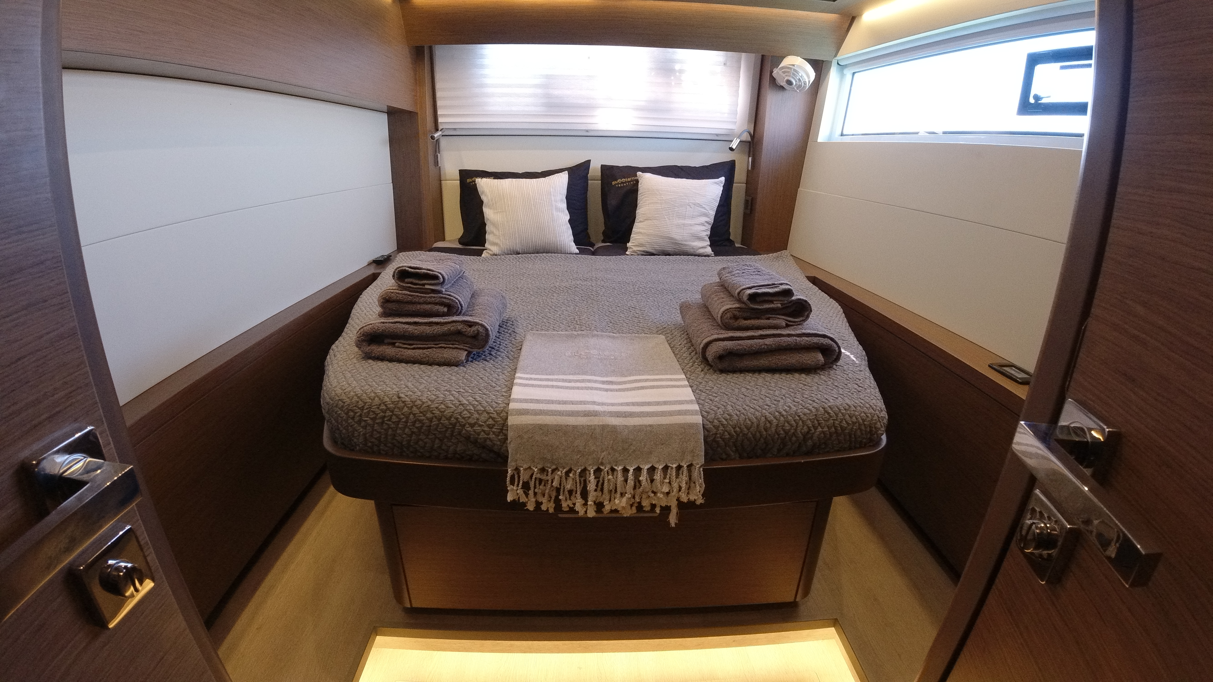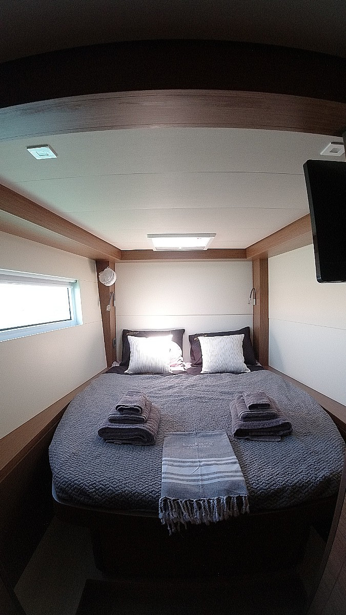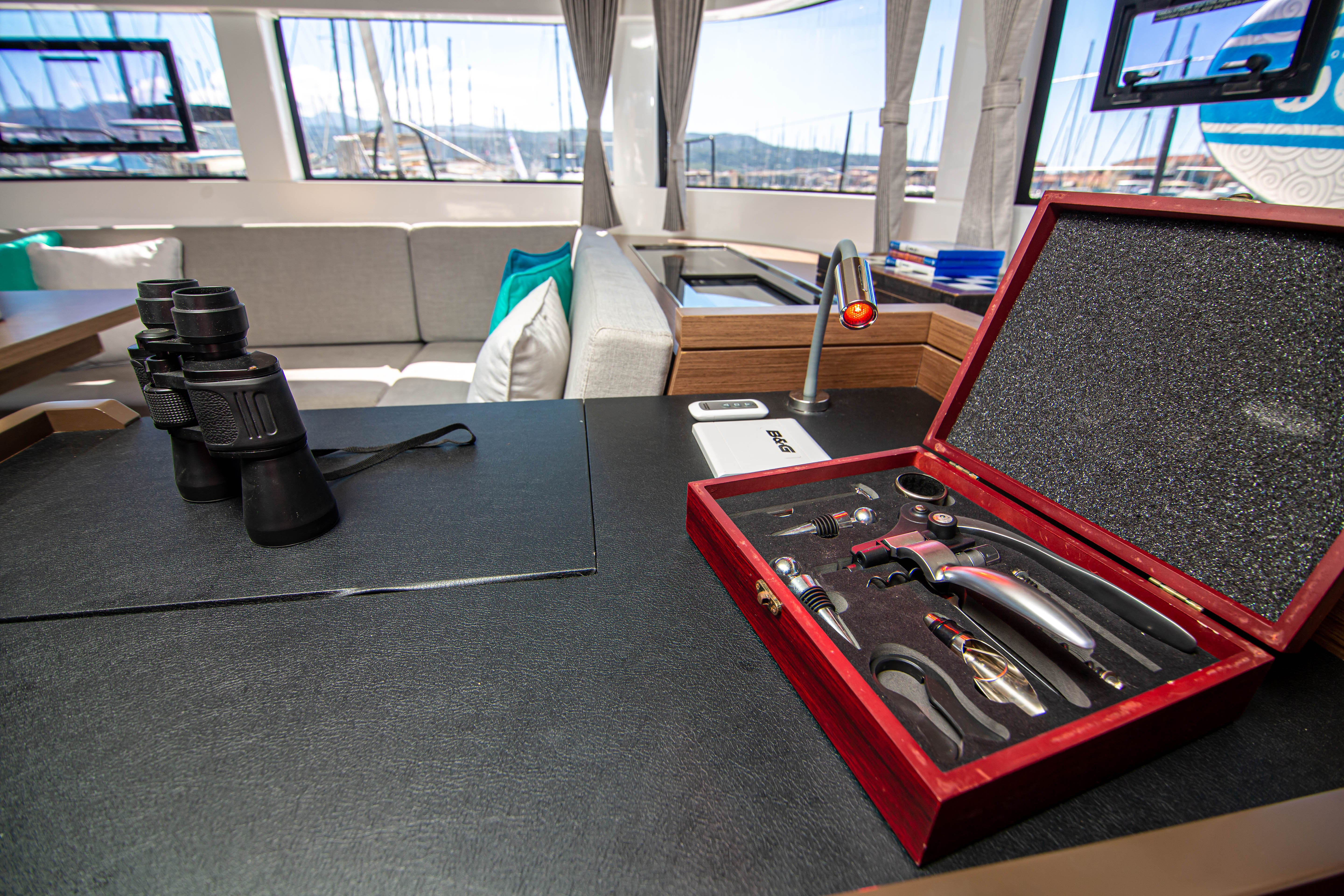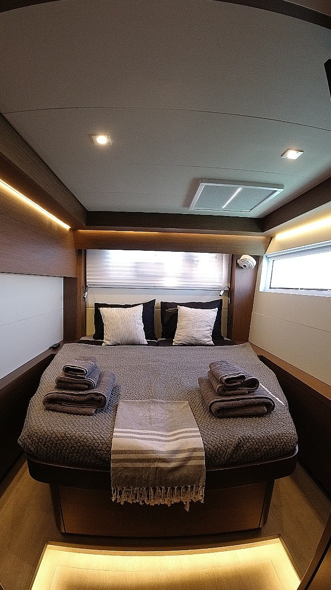 | Inside | 2. Kühlschrank, Eiswürfelmaschine, Espresso Maschine, Frischwasserpumpe, FUSION Sound System, Generator, Geschirrspüler, Inverter 12V/220V, Klimaanlage (ohne Landstrombedarf), Pantryausstattung, Playstation, Radio mit Bluetooth, Smart-TV, USB Steckdosen in Salon und Kabinen, Ventilatoren in Salon und Kabinen, Watermaker, WC (elektr.) |