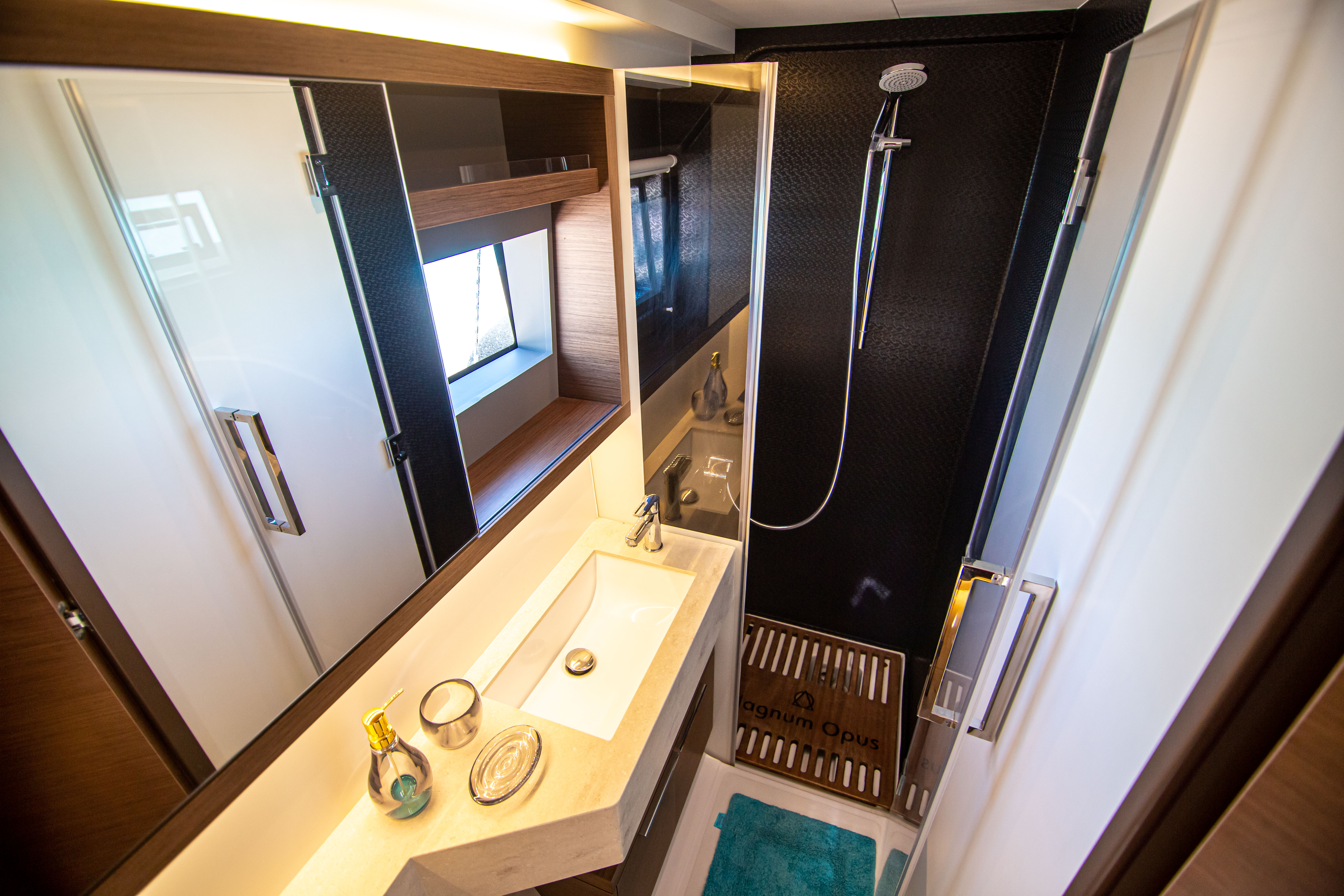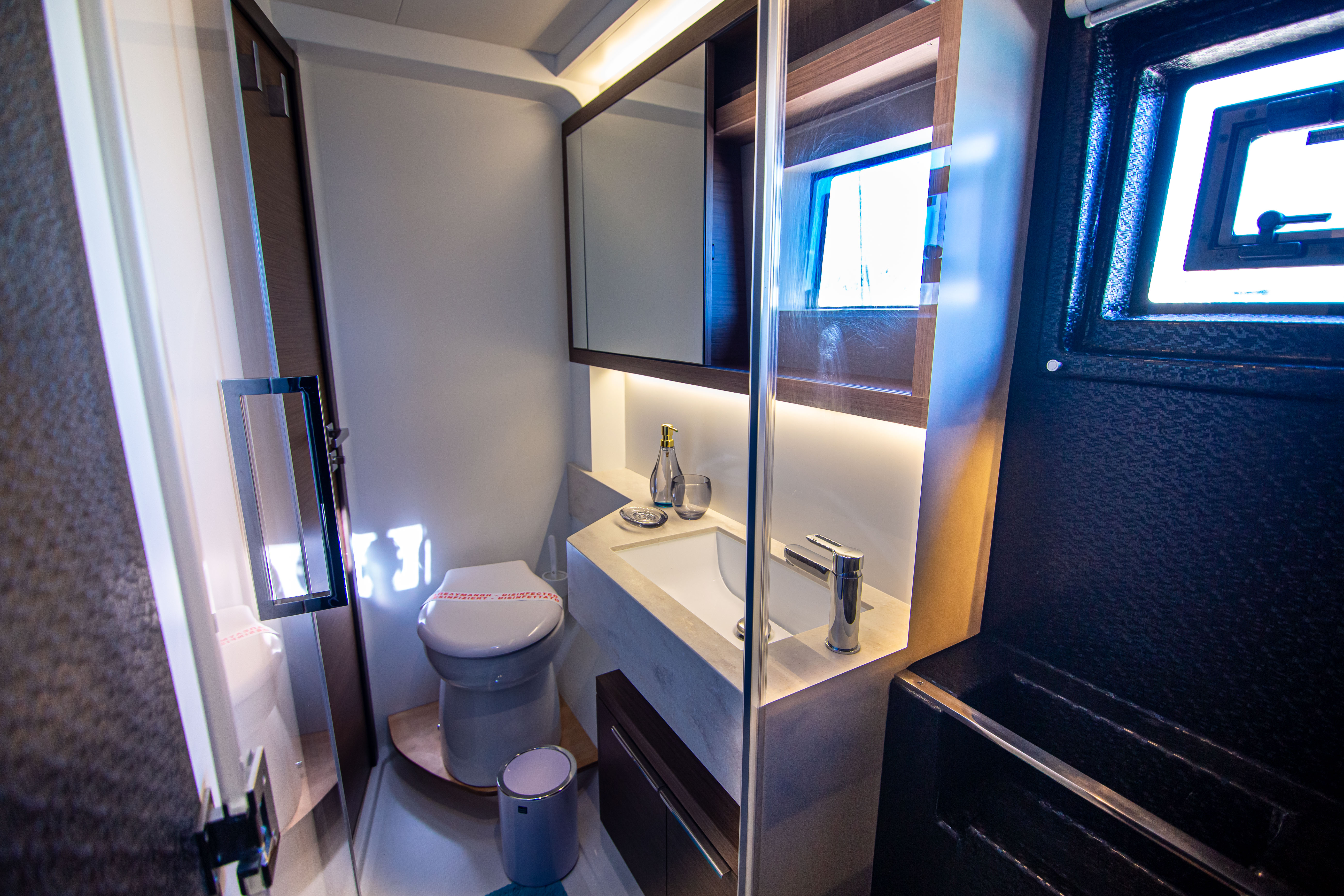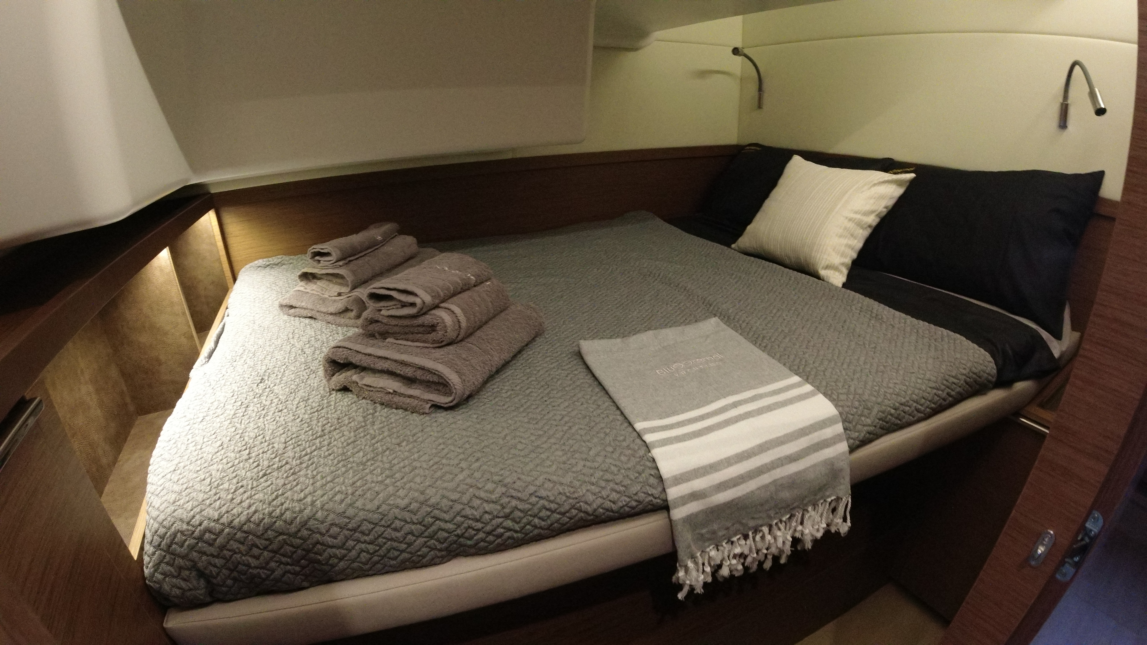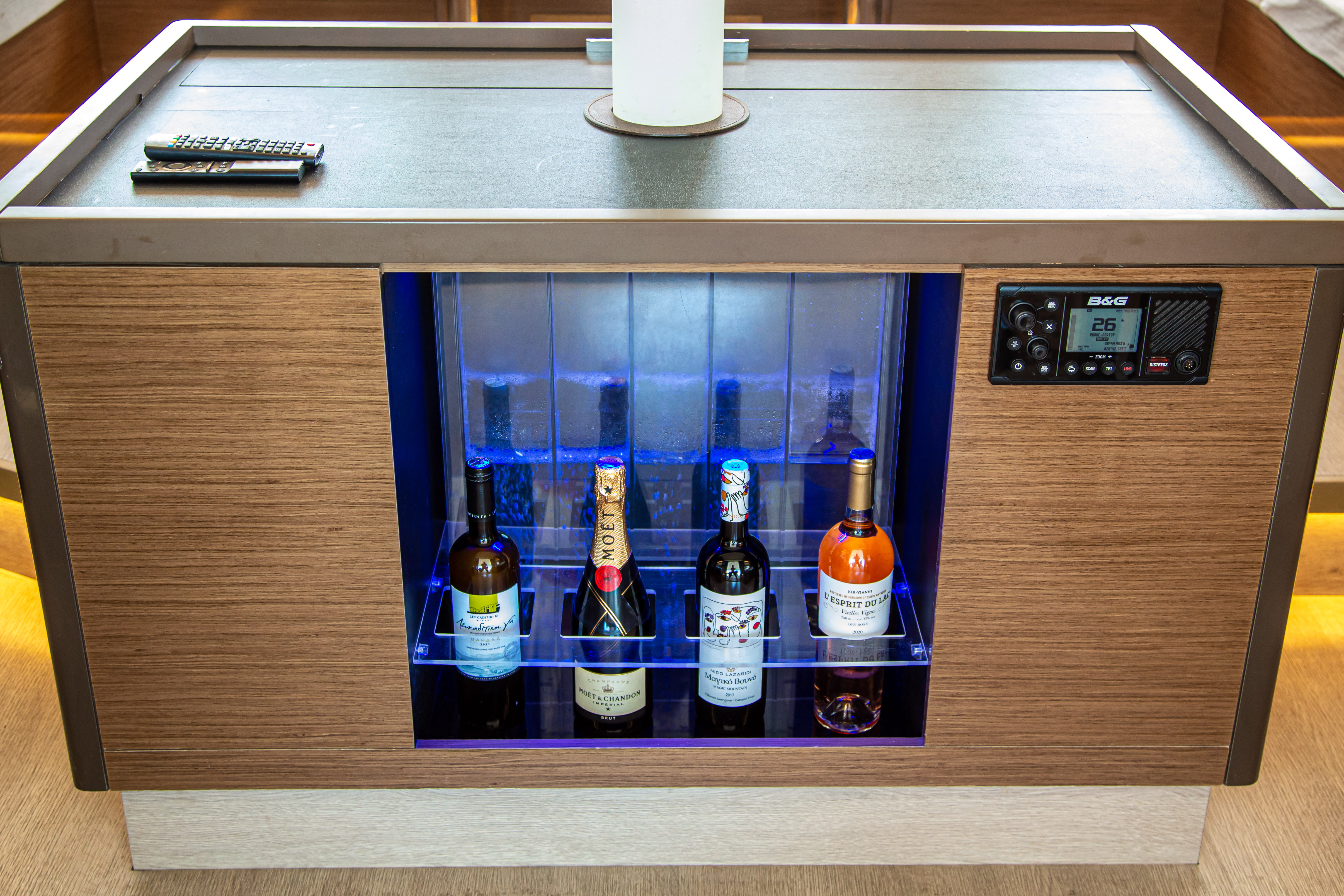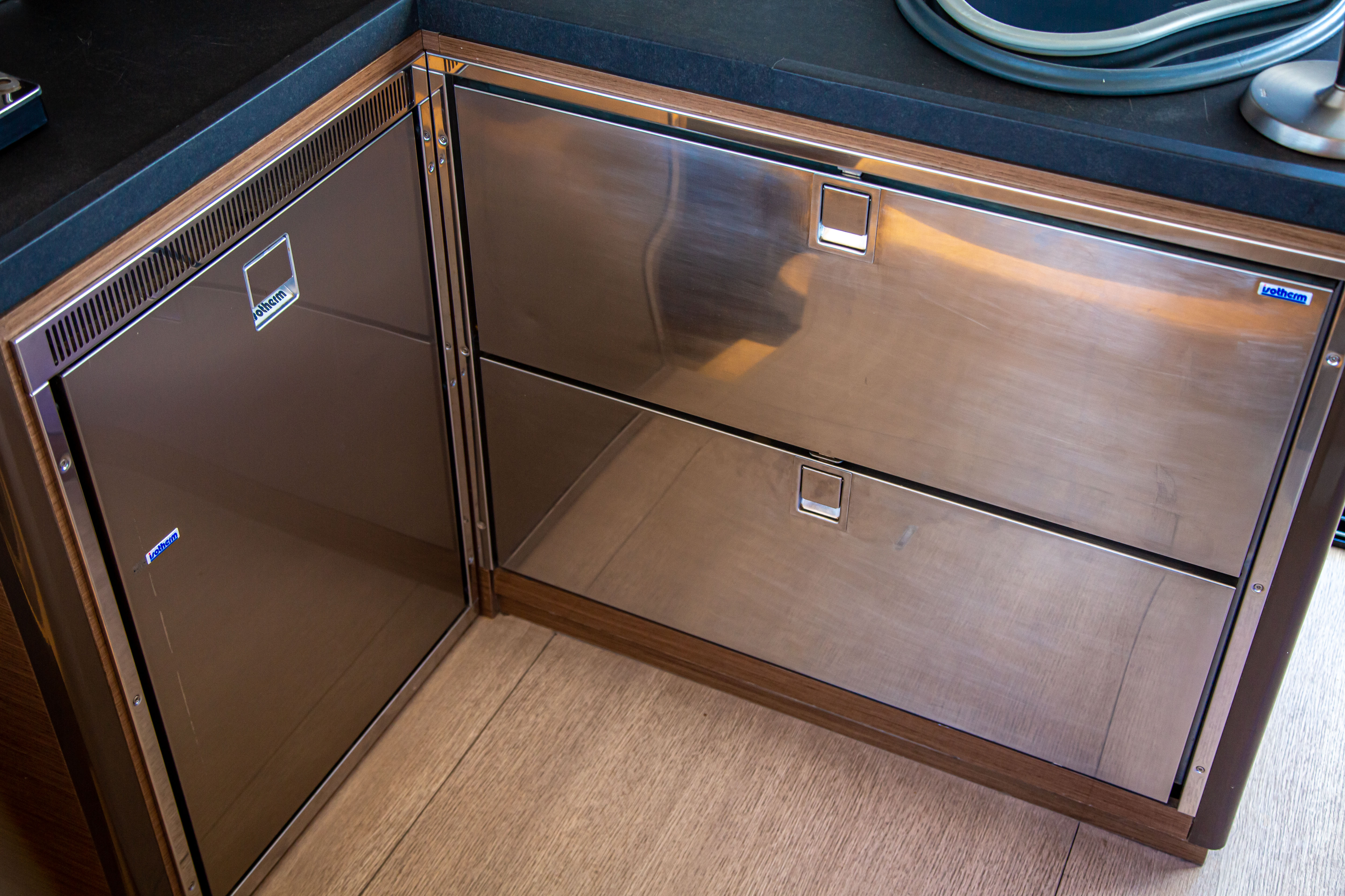 | Inside | 2. Kühlschrank, Eiswürfelmaschine, Espresso Maschine, Frischwasserpumpe, FUSION Sound System, Generator, Geschirrspüler, Inverter 12V/220V, Klimaanlage (ohne Landstrombedarf), Pantryausstattung, Playstation, Radio mit Bluetooth, Smart-TV, USB Steckdosen in Salon und Kabinen, Ventilatoren in Salon und Kabinen, Watermaker, WC (elektr.) |