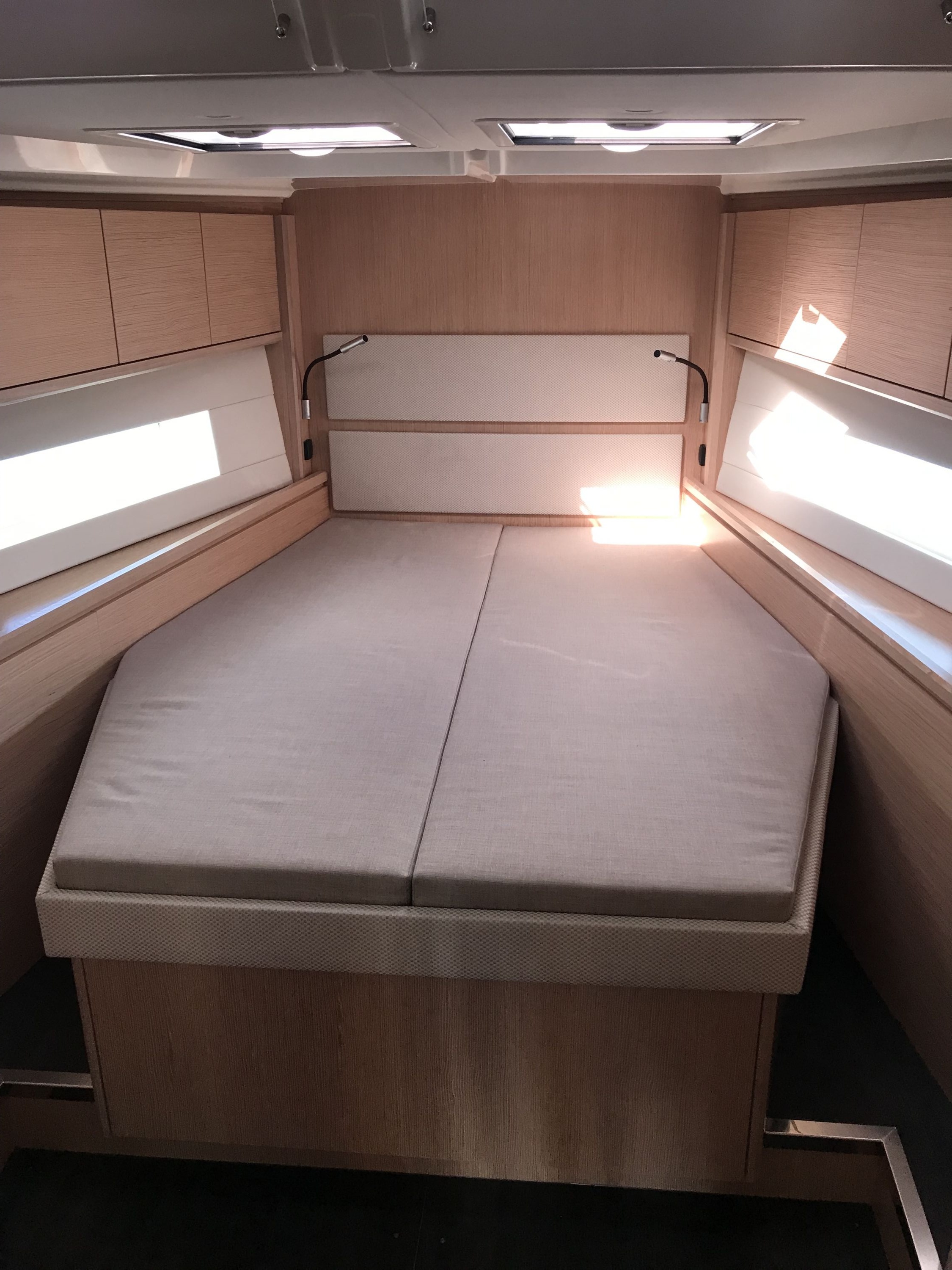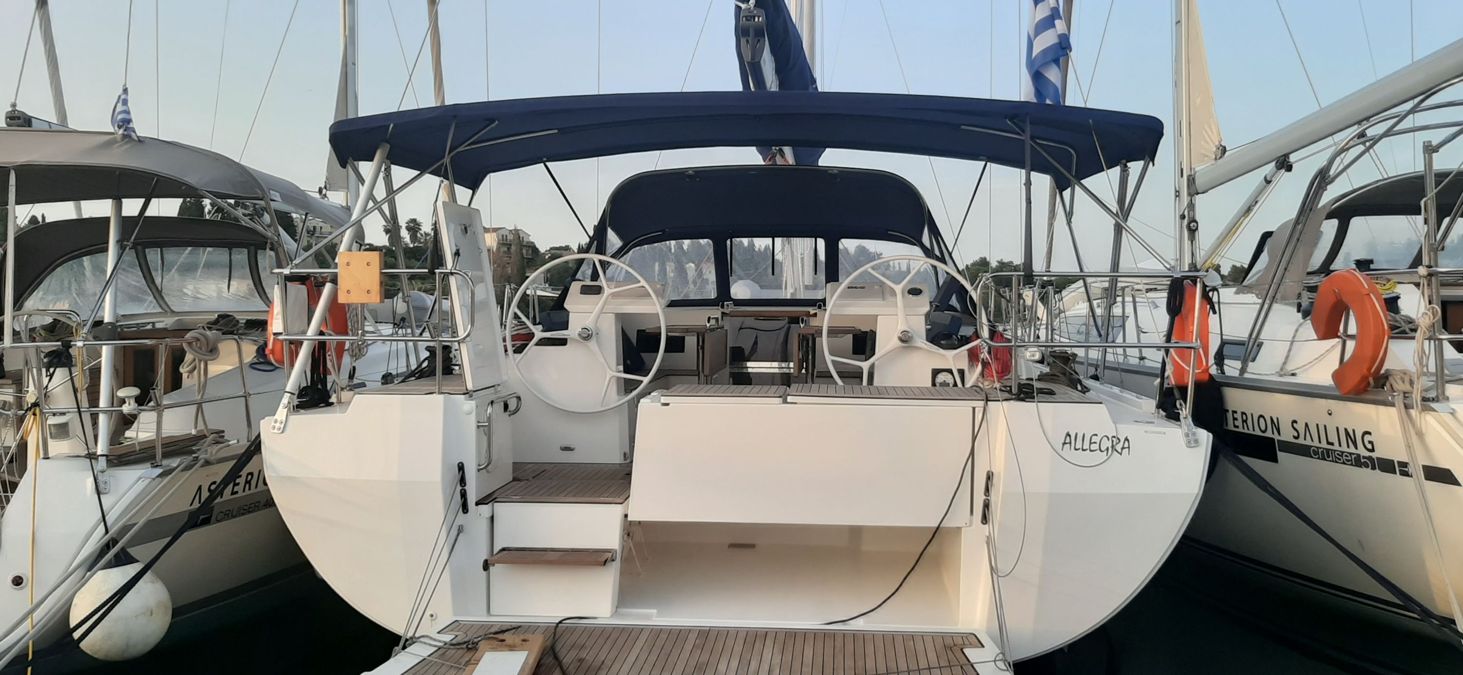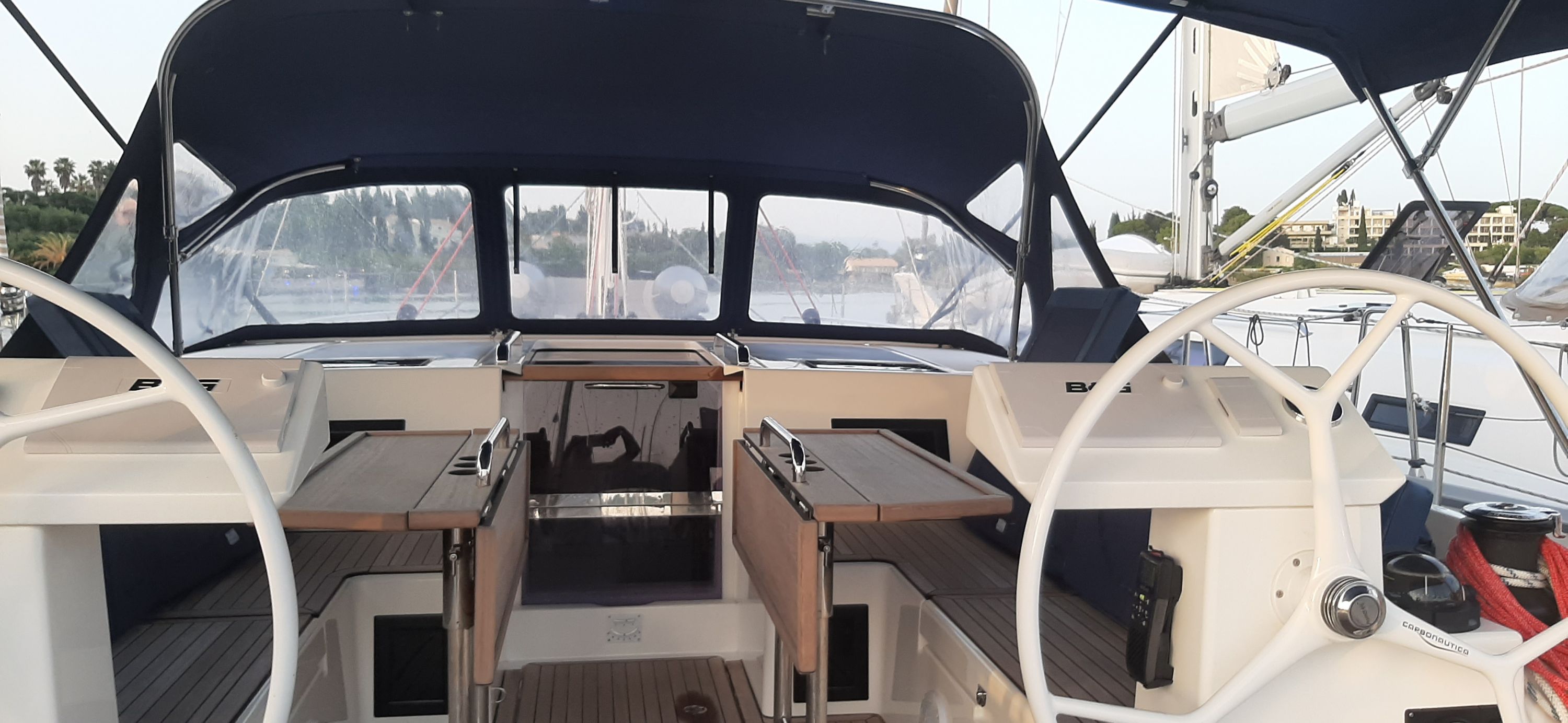 Outside Anker mit Kette, Badeleiter, Badeplattform, Biminitop, Cockpitlautsprecher, Cockpitpolster, Cockpittisch, Deckbürste, elektr. Ankerwinsch, Fender, Festmacherleinen, Kunststoff-Eimer (Pütz), Solaranlage, Sprayhood, Treibanker, Wasserschlauch