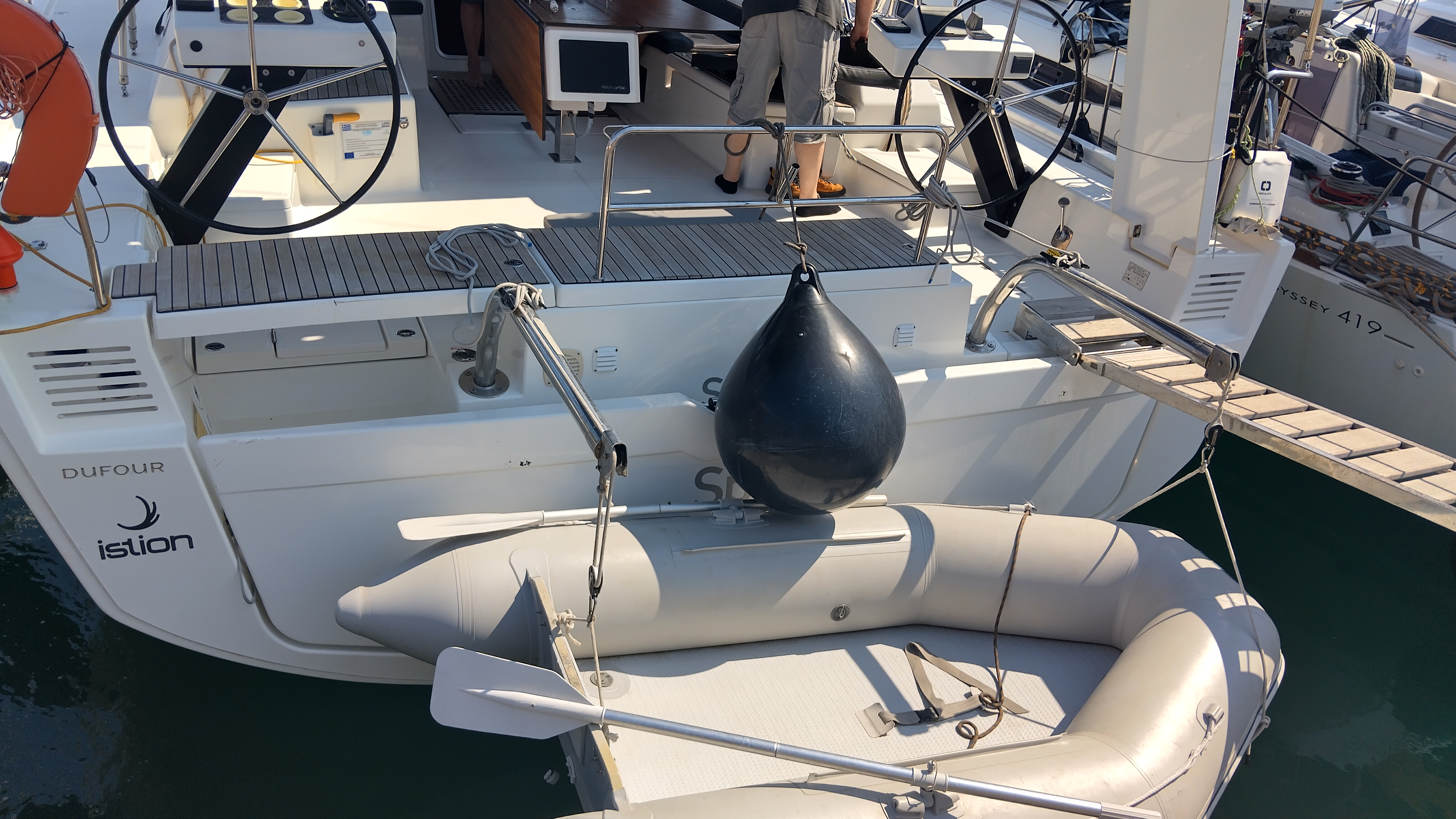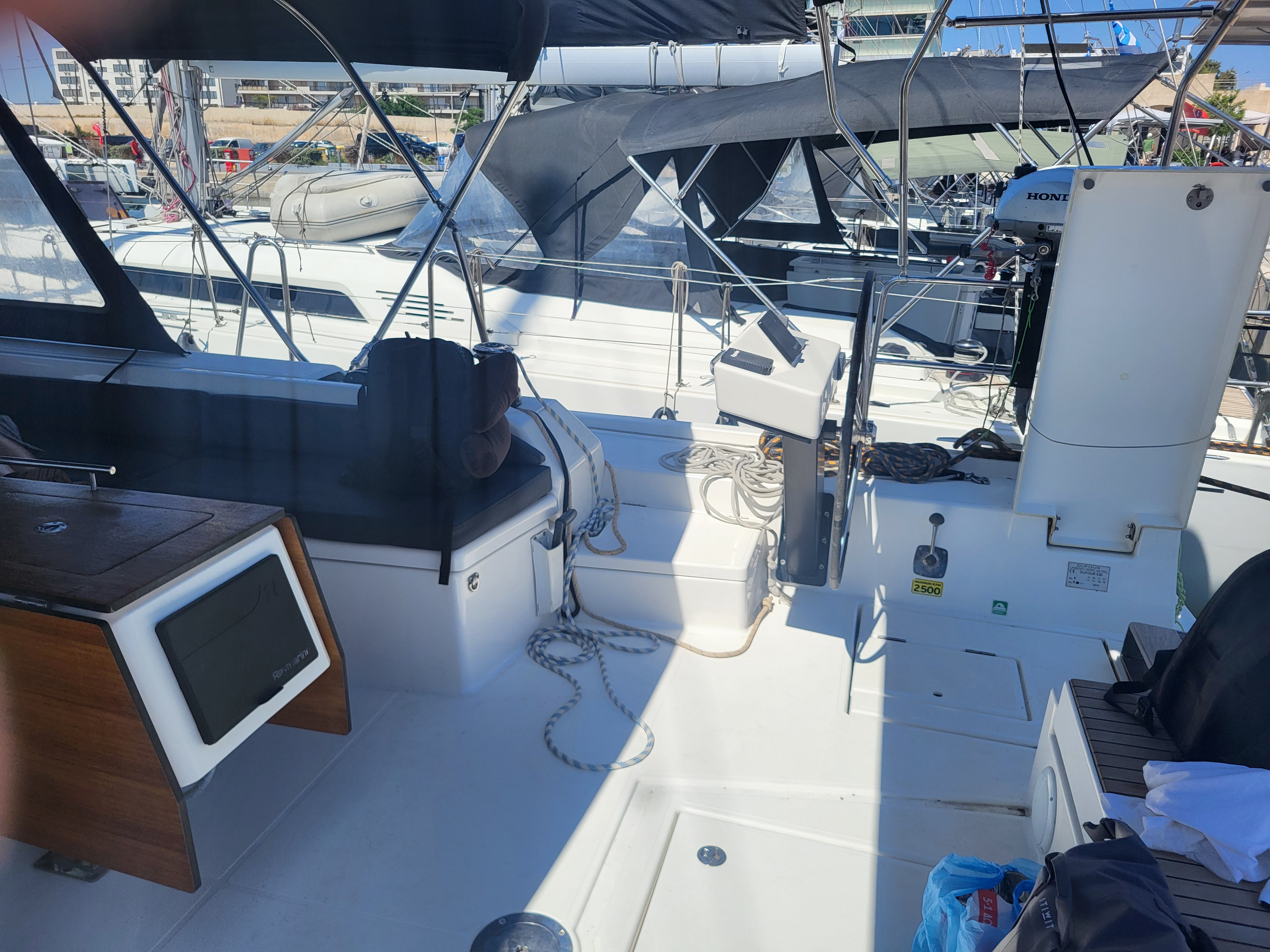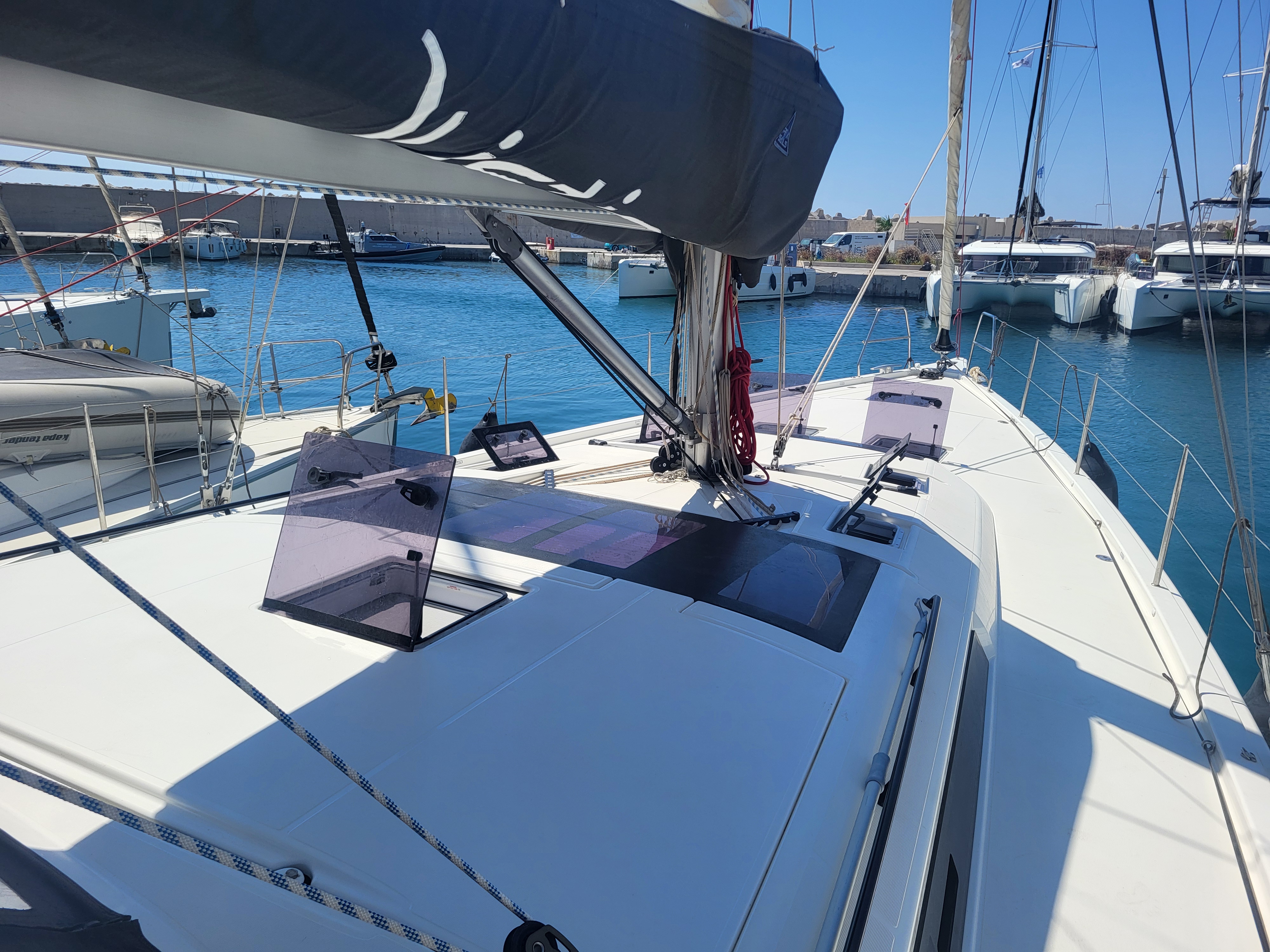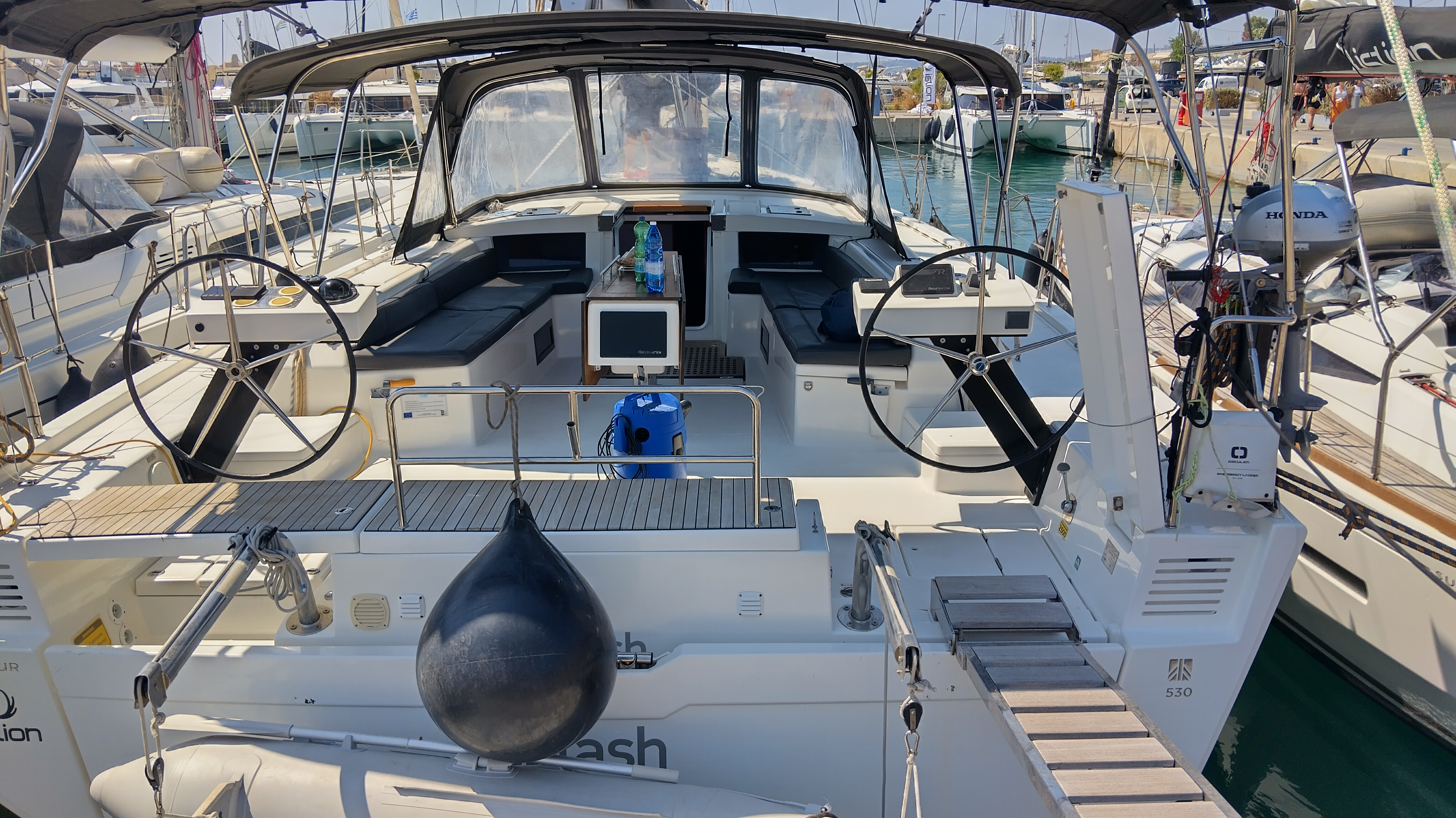 | Outside | Anker mit Kette, Badeleiter, Biminitop, Bootshaken, Cockpitdusche, Cockpitlautsprecher, Cockpitpolster, Cockpittisch, Deckbürste, Dieselkanister , elektr. Ankerwinsch, elektr. Winsch, Fender, Festmacherleinen, Gangway, Kunststoff-Eimer (Pütz), Segel-Flickwerkzeug, Sprayhood, Vorhängeschloss, Wantenschneider, Wasserschlauch, Windex, Winschen |