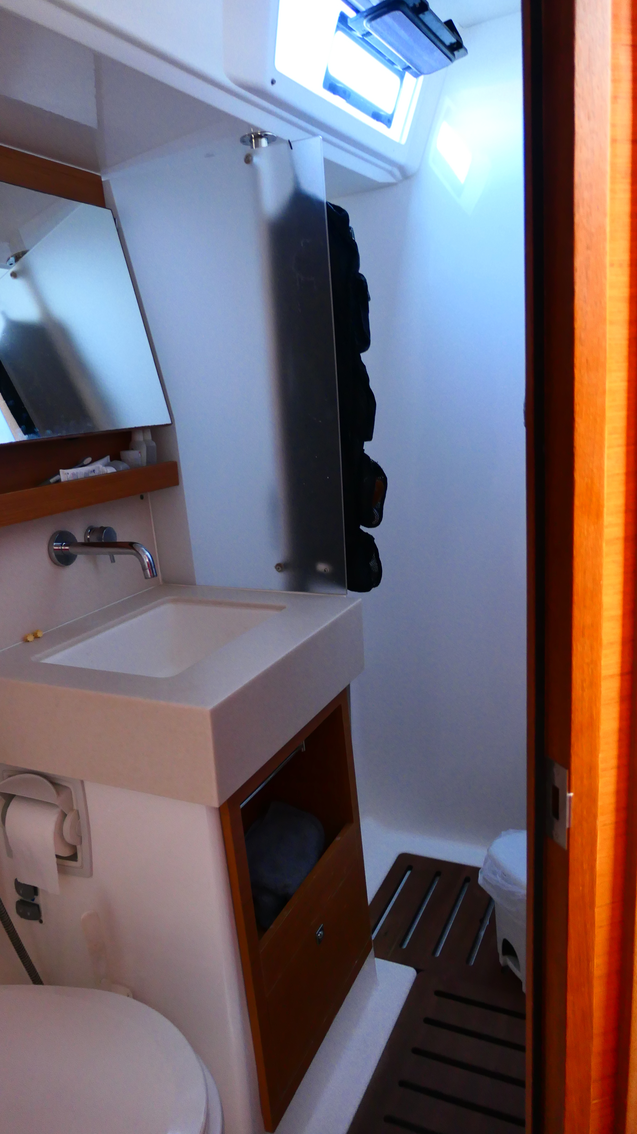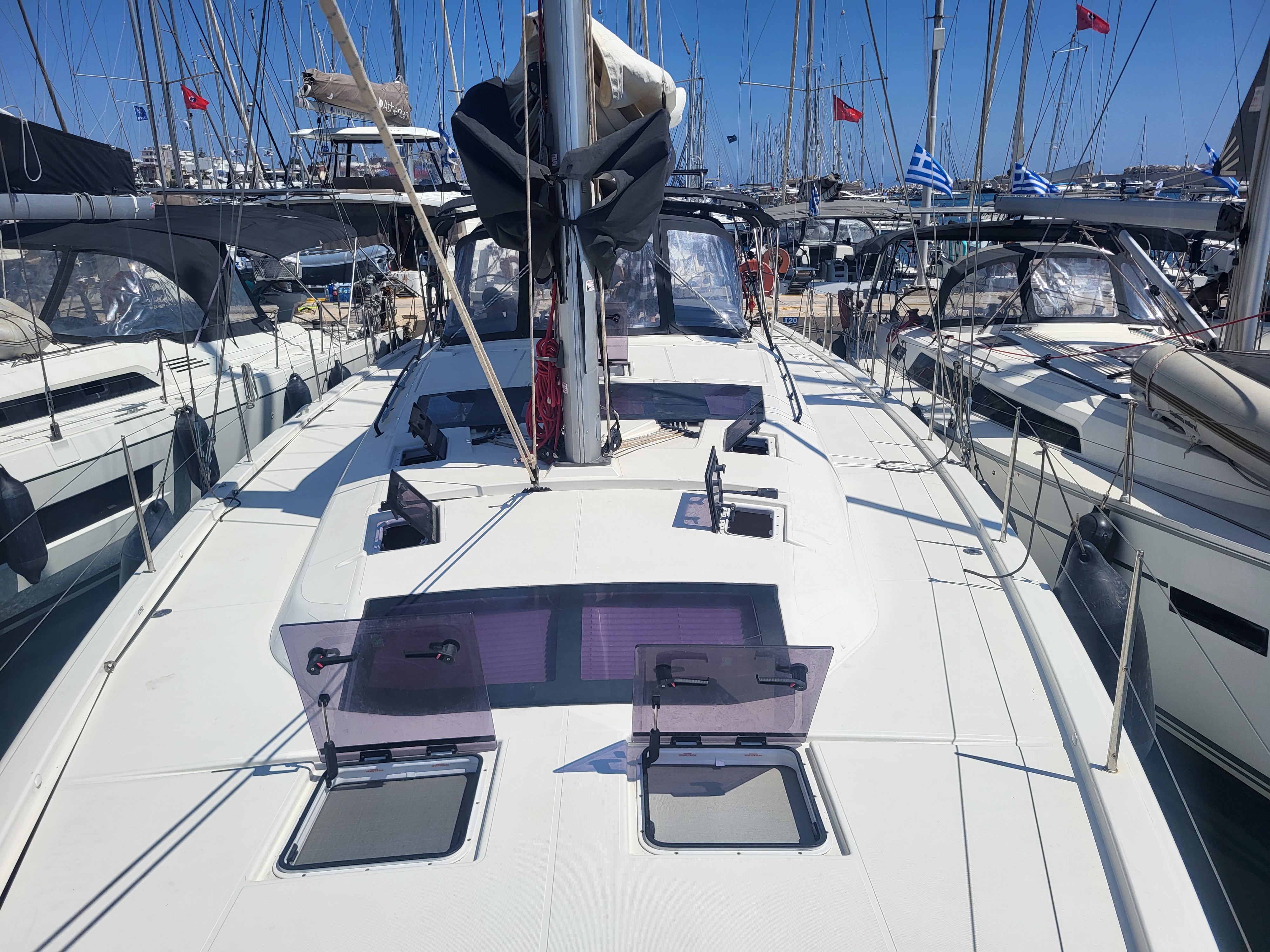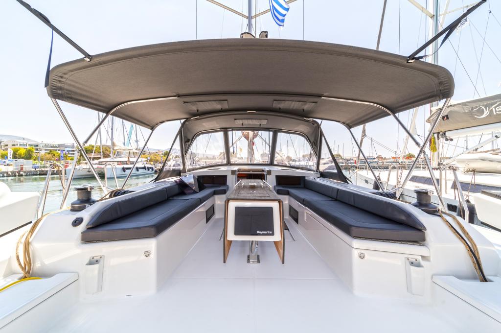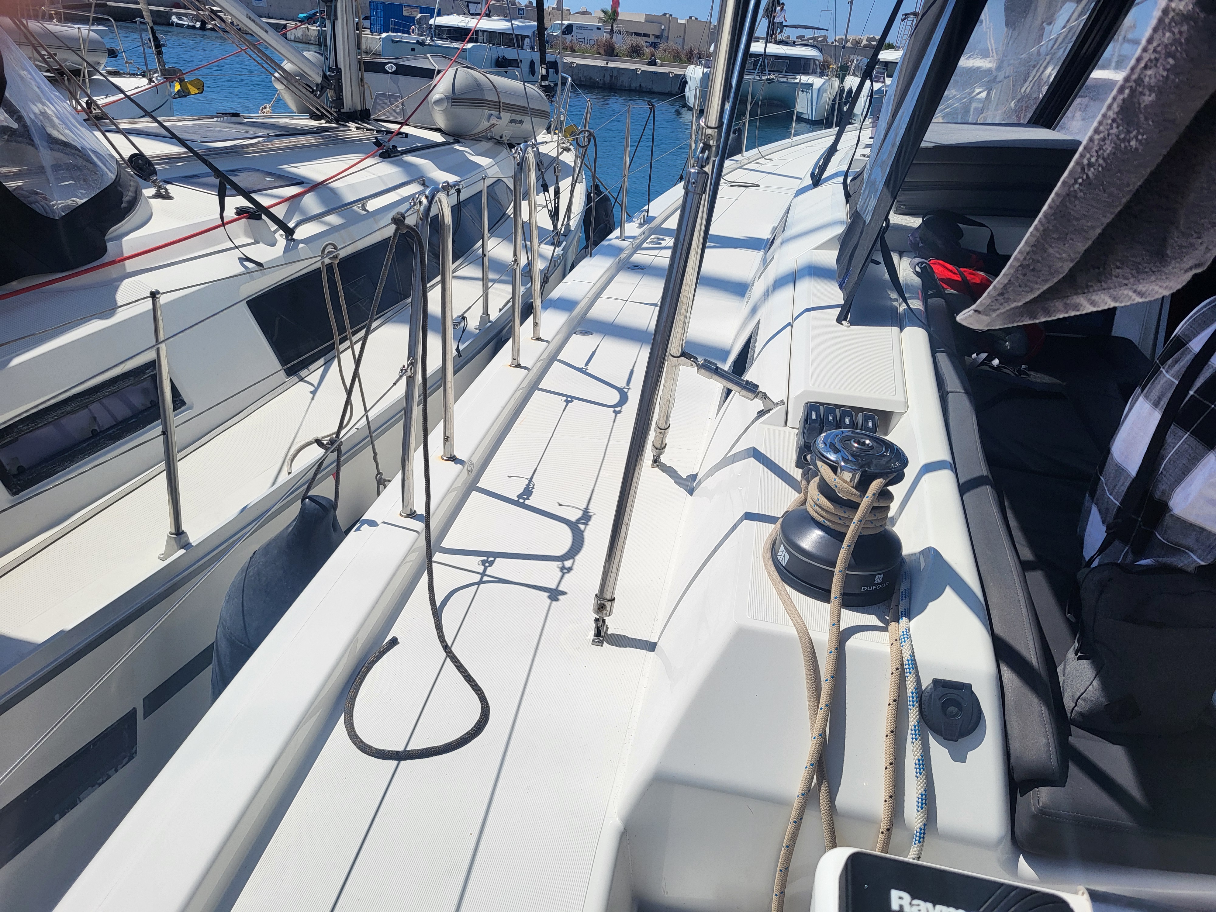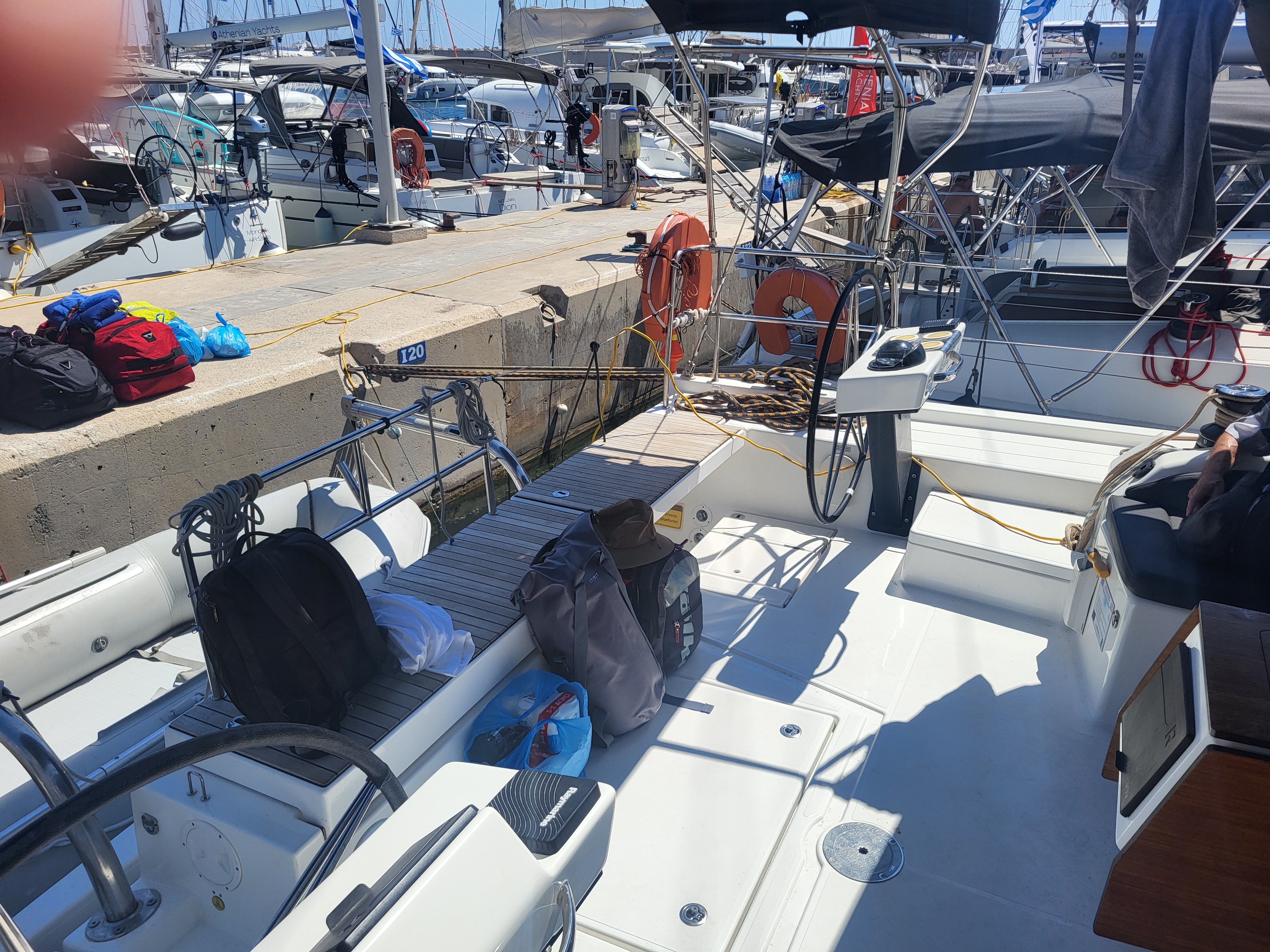 | Outside | Anker mit Kette, Badeleiter, Biminitop, Bootshaken, Cockpitdusche, Cockpitlautsprecher, Cockpitpolster, Cockpittisch, Deckbürste, Dieselkanister , elektr. Ankerwinsch, elektr. Winsch, Fender, Festmacherleinen, Gangway, Kunststoff-Eimer (Pütz), Segel-Flickwerkzeug, Sprayhood, Vorhängeschloss, Wantenschneider, Wasserschlauch, Windex, Winschen |