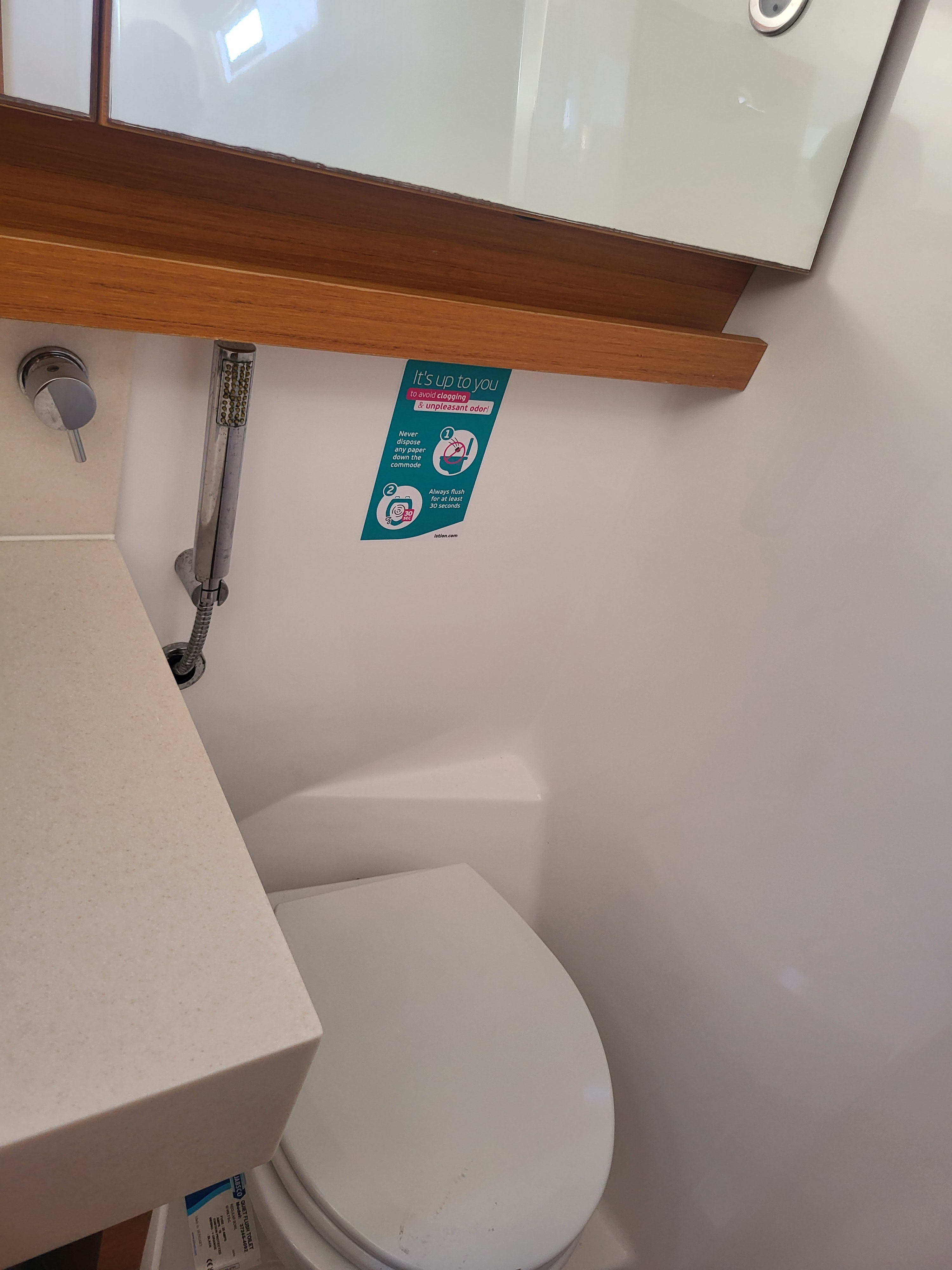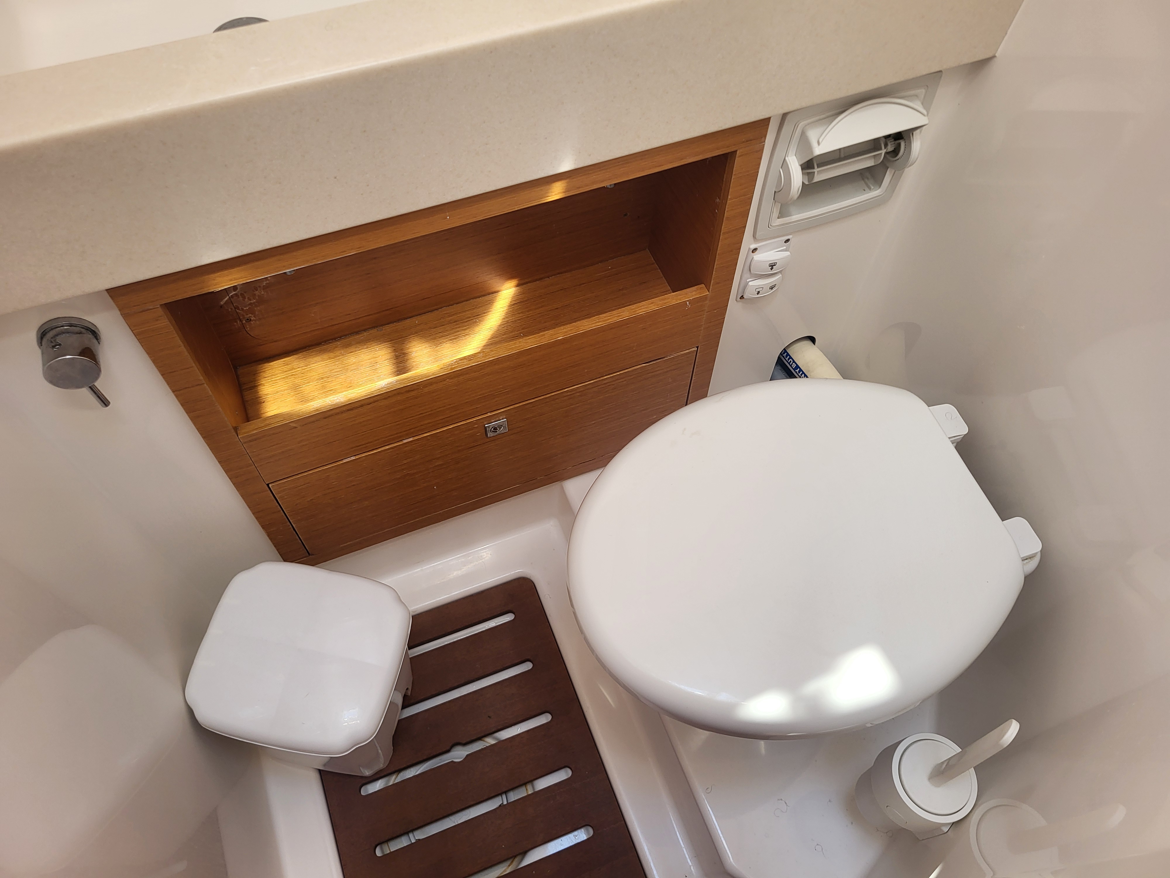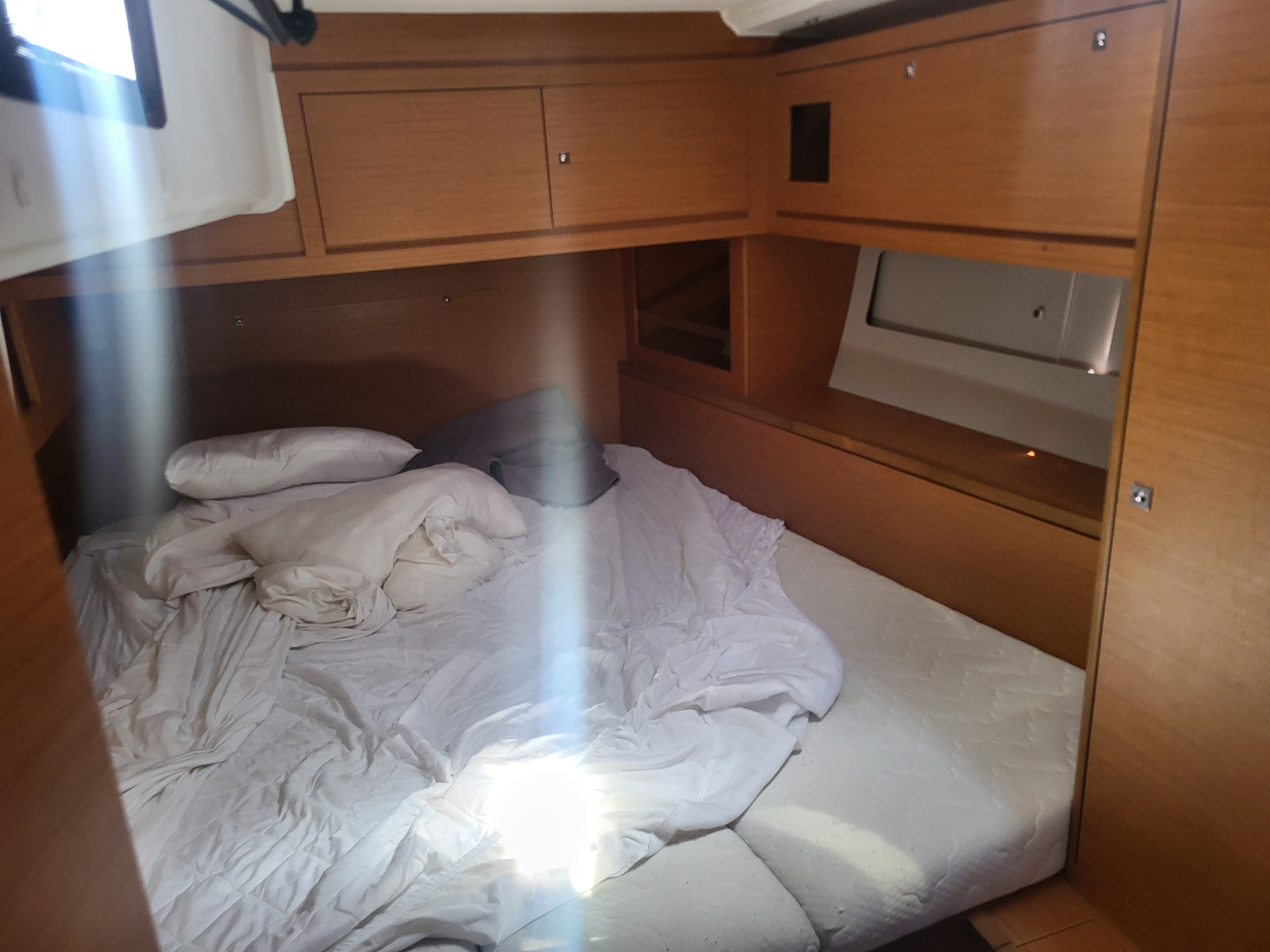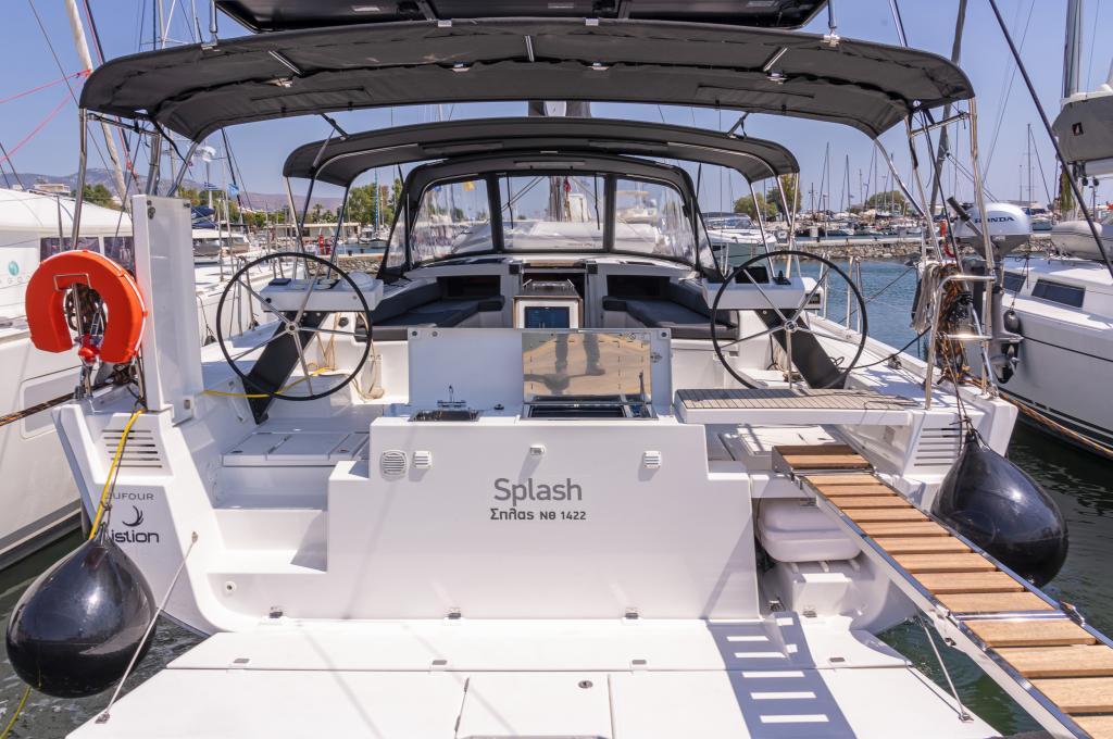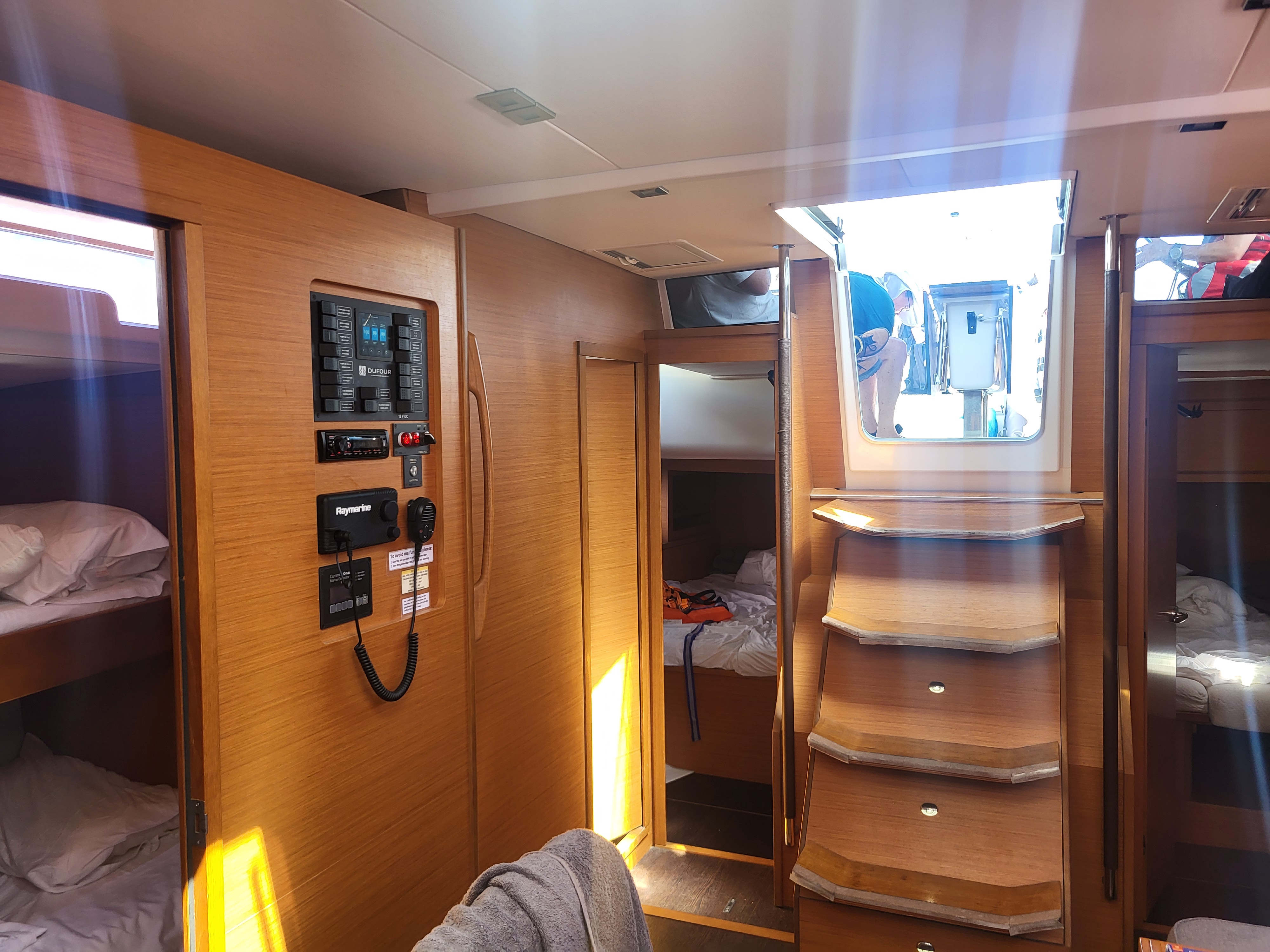 | Outside | Anker mit Kette, Badeleiter, Biminitop, Bootshaken, Cockpitdusche, Cockpitlautsprecher, Cockpitpolster, Cockpittisch, Deckbürste, Dieselkanister , elektr. Ankerwinsch, elektr. Winsch, Fender, Festmacherleinen, Gangway, Kunststoff-Eimer (Pütz), Segel-Flickwerkzeug, Sprayhood, Vorhängeschloss, Wantenschneider, Wasserschlauch, Windex, Winschen |
