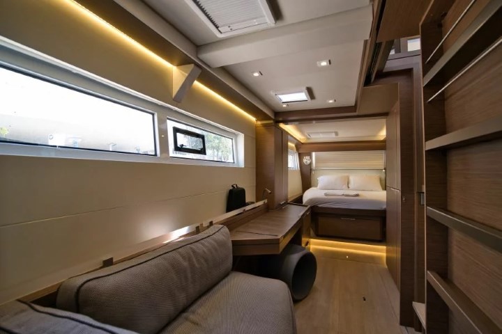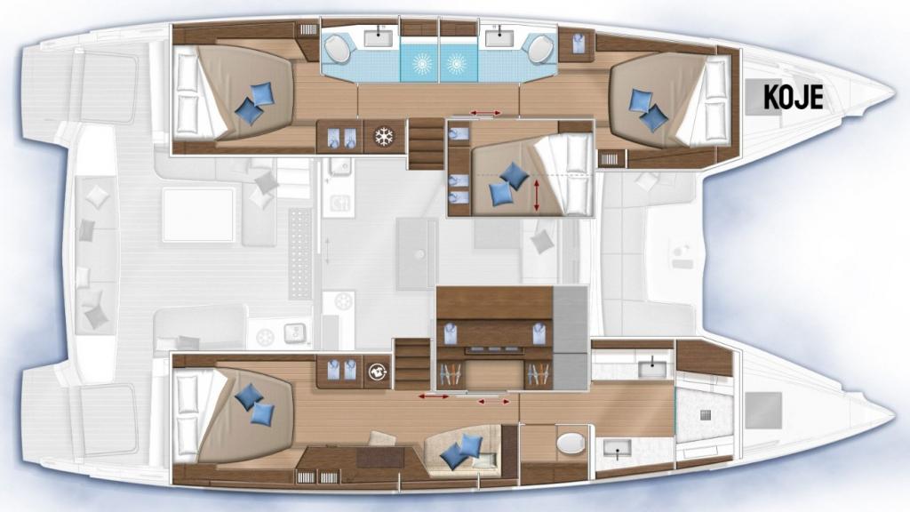 Fäkalientank, Gefrierschrank, Generator, Geschirrspüler, Inverter 12V/220V, Klimaanlage (ohne Landstrombedarf), Kühlschrank, Mikrowelle, Pantryausstattung, Radio, TV, USB Steckdosen in den Kabinen, Ventilatoren in Salon und Kabinen, Waschmaschine mit Trockner, Watermaker |