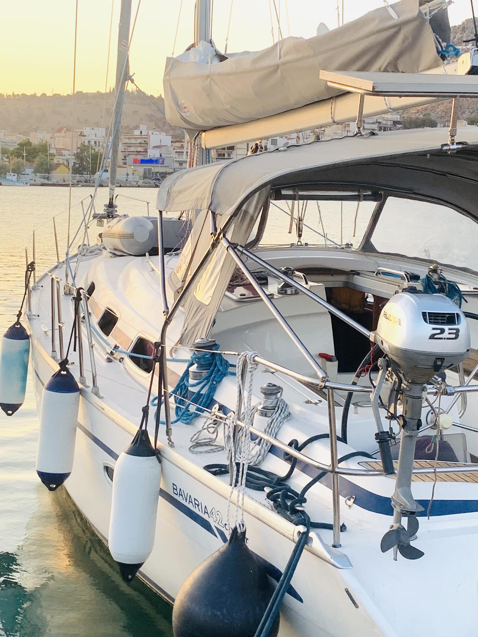 | Outside | Badeleiter, Biminitop, Bootshaken, Cockpitleuchte, elektr. Ankerwinsch, Fender, Fernsteuerung für elektr. Ankerwinsch, Schnorchelausrüstung, Solaranlage, Sprayhood, Teak im Cockpit |