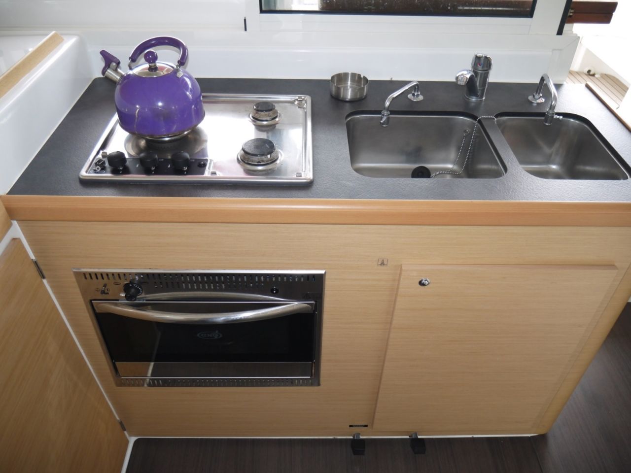 Outside Badeleiter, Biminitop, Bootshaken, Cockpitdusche, Cockpitlautsprecher, Cockpitpolster, Cockpittisch, Deckbürste, Dieselkanister , elektr. Ankerwinsch, Kunststoff-Eimer (Pütz), Solaranlage, Wasserkanister