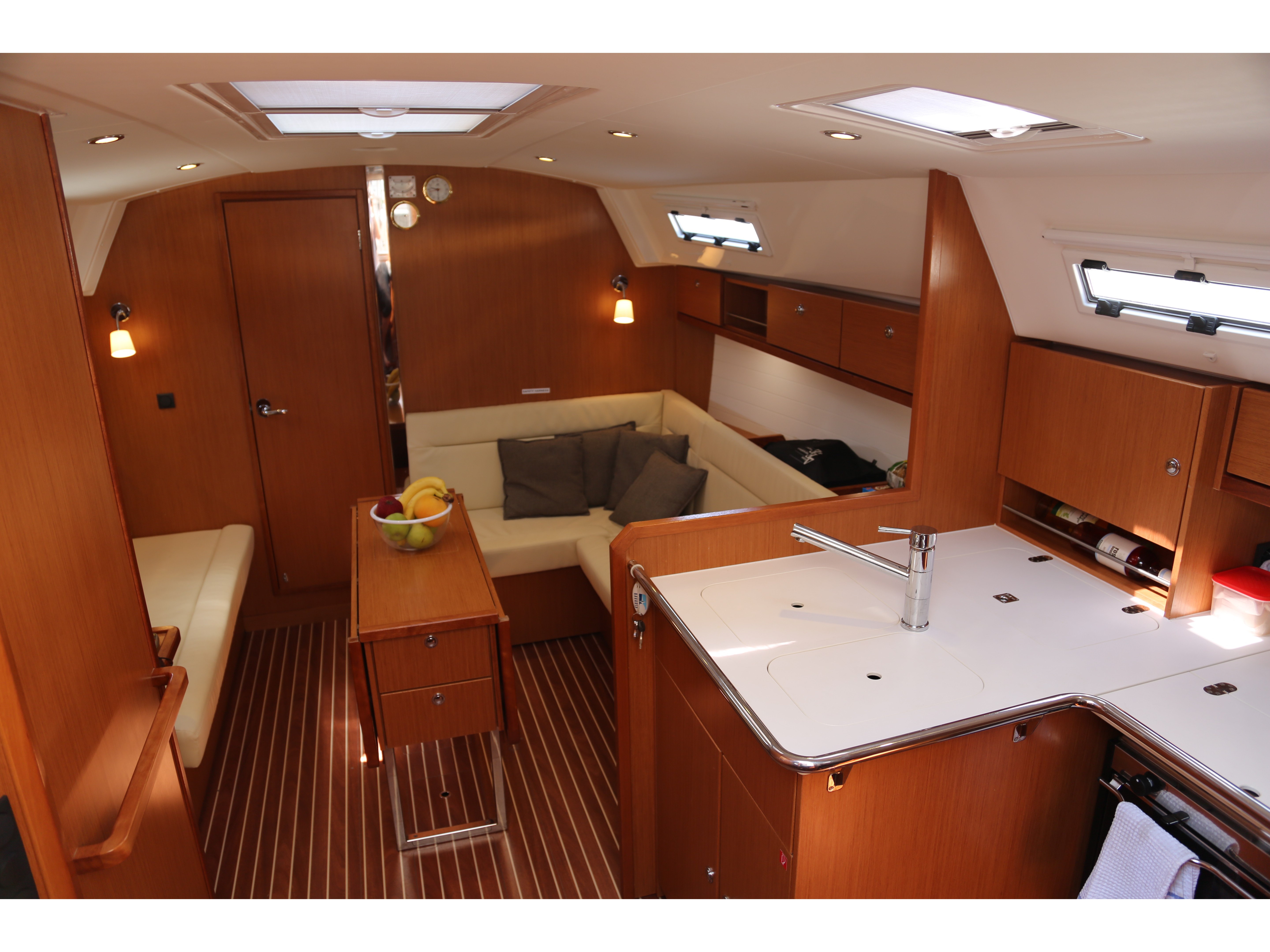 | Outside | Außendusche, Badeleiter, Biminitop, Cockpitlautsprecher, Cockpitpolster, Cockpittisch, elektr. Ankerwinsch, Gangway, Solaranlage, Sprayhood, Teak im Cockpit |