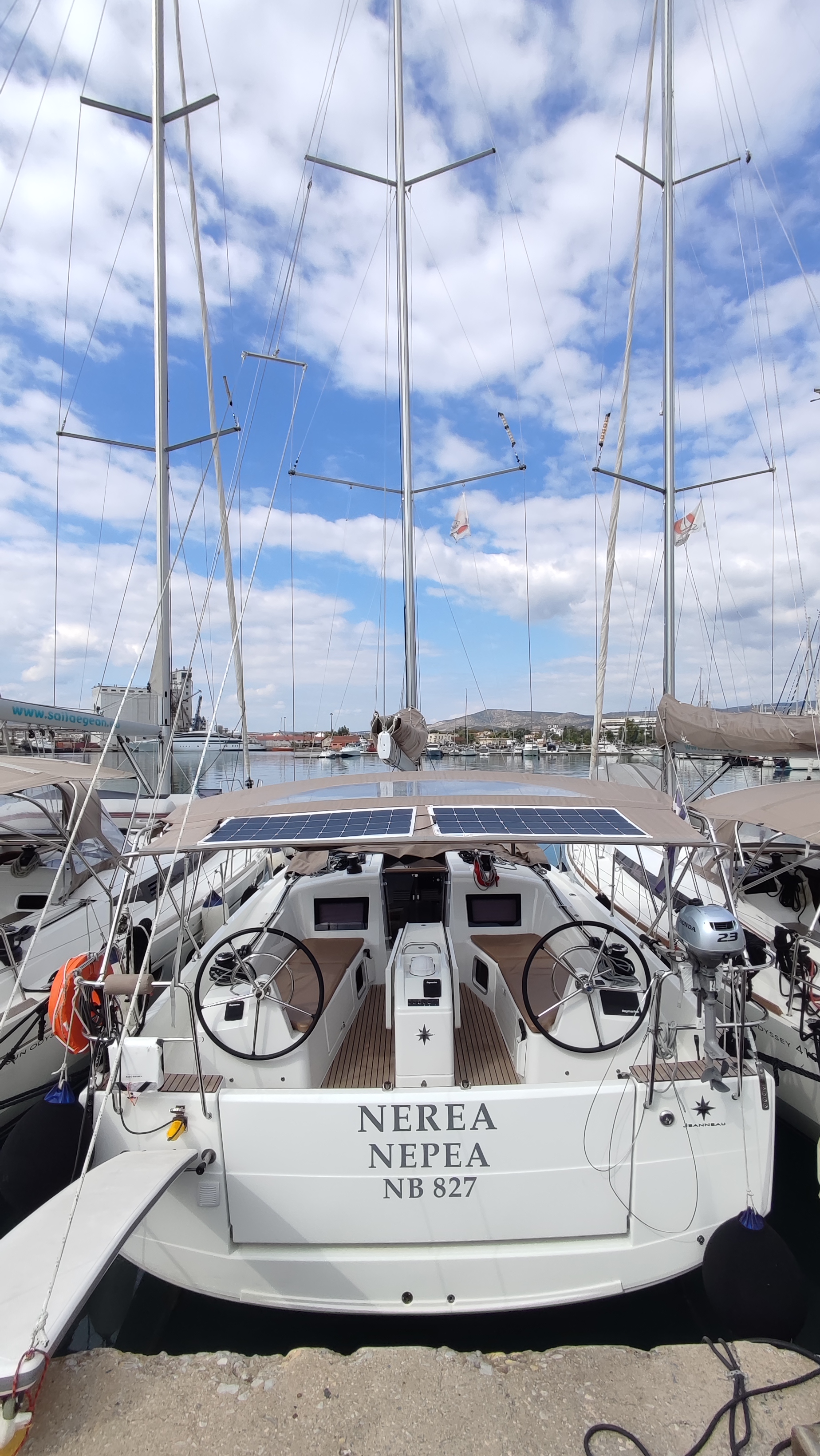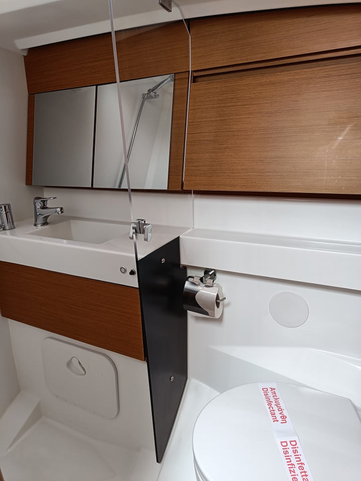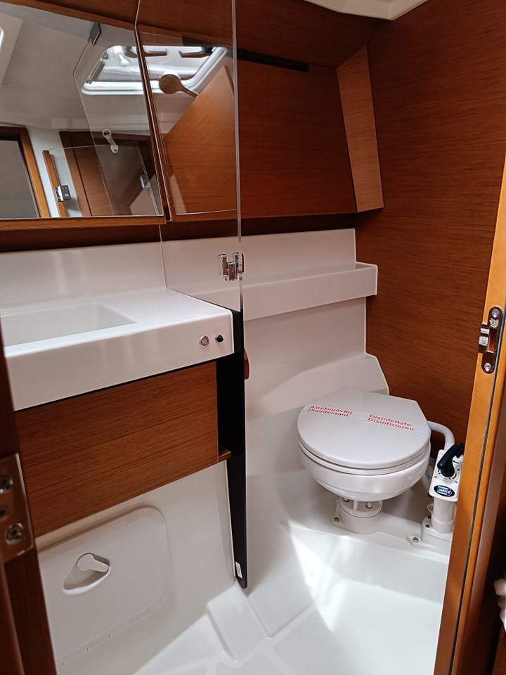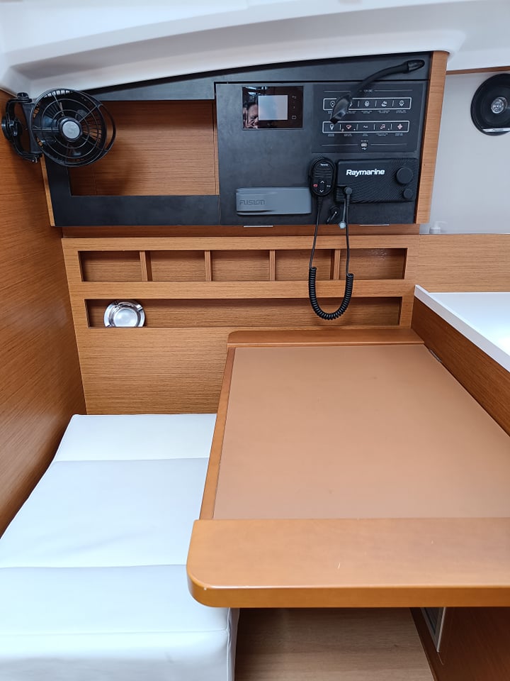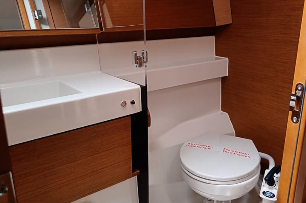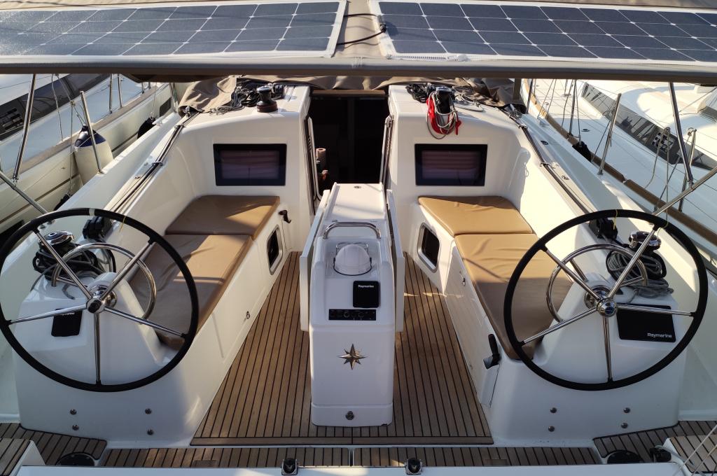 | Outside | Außendusche, Badeleiter, Biminitop, Cockpitlautsprecher, Cockpitpolster, Cockpittisch, elektr. Ankerwinsch, Gangway, Solaranlage, Sprayhood, Teak im Cockpit |