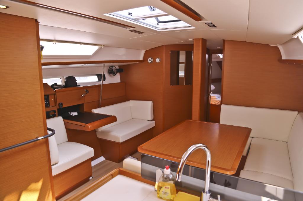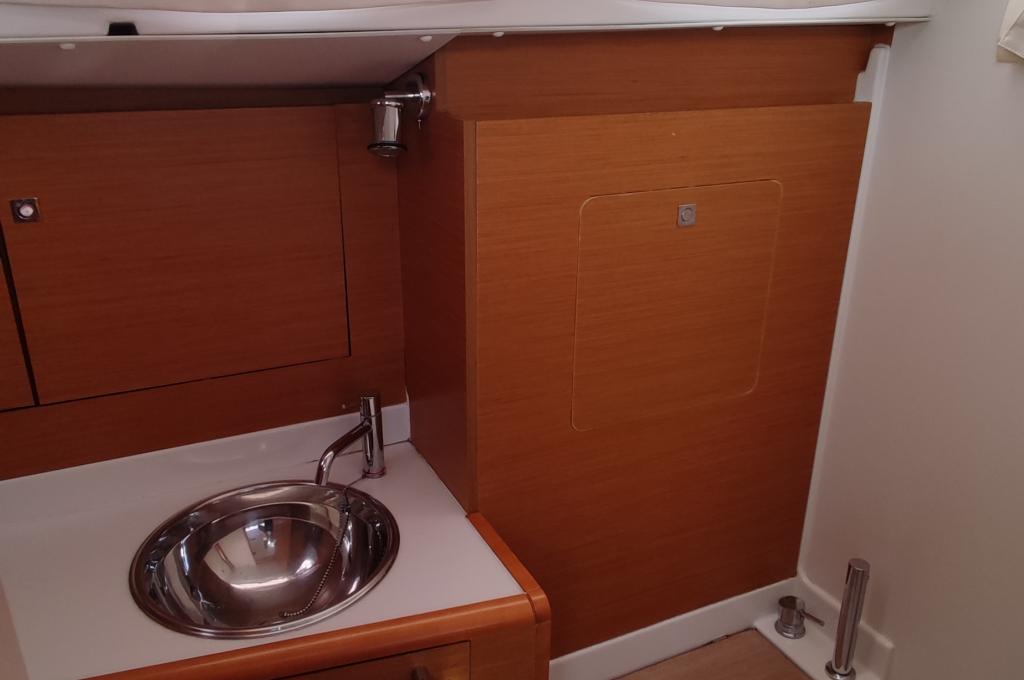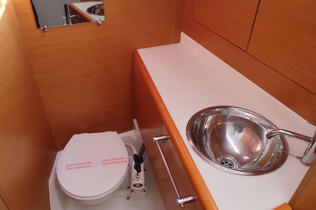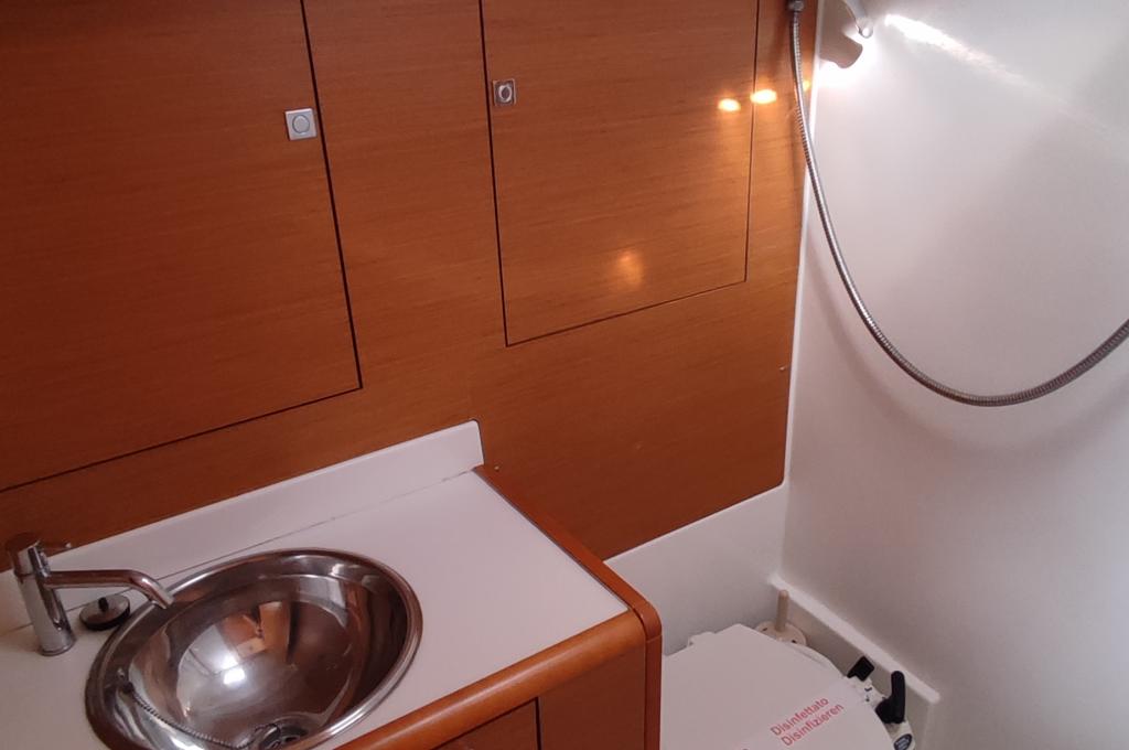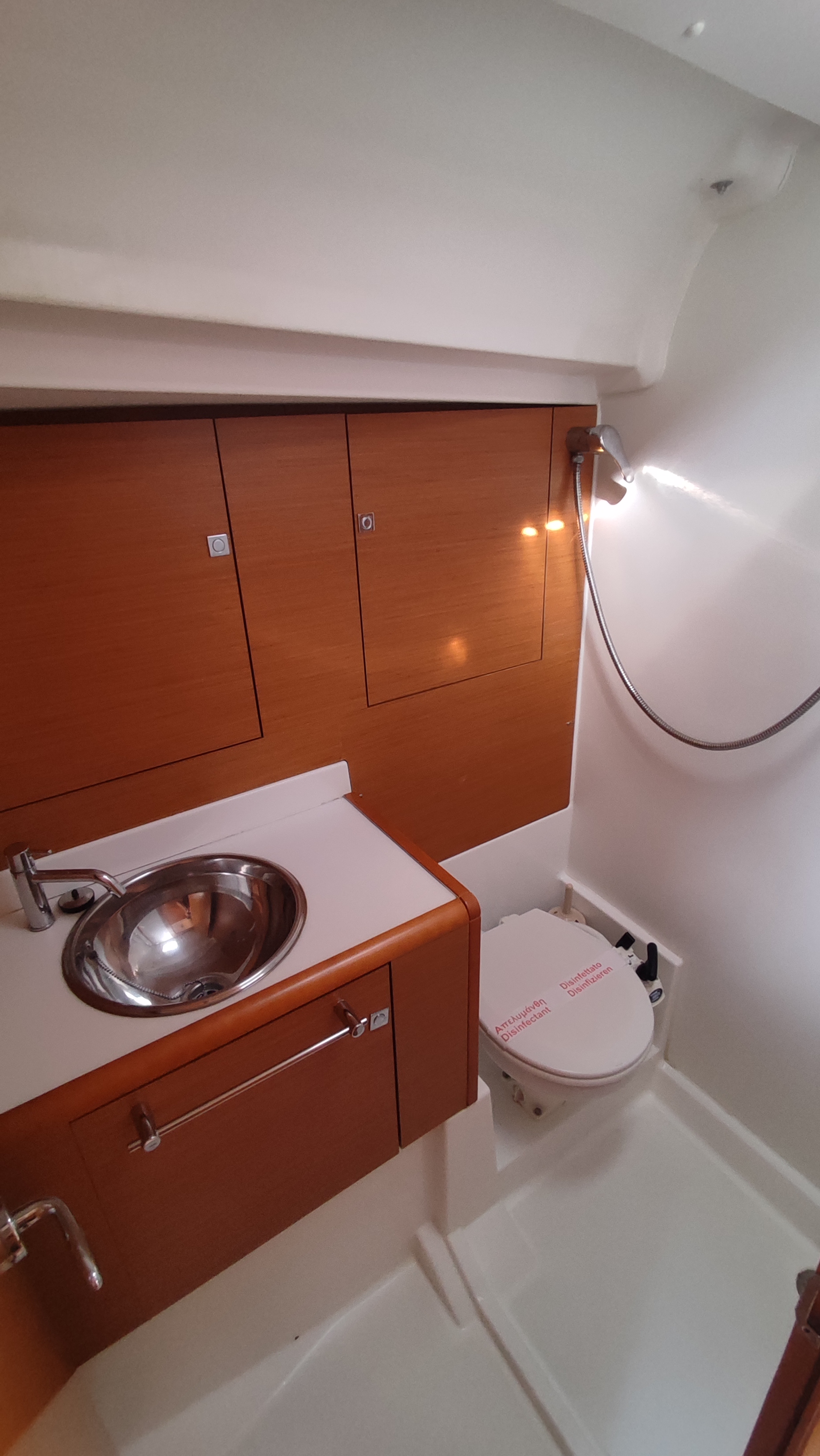 | Outside | Außendusche, Badeleiter, Biminitop, Cockpitlautsprecher, Cockpitpolster, Cockpittisch, elektr. Ankerwinsch, Gangway, Solaranlage, Sprayhood, Teak im Cockpit |