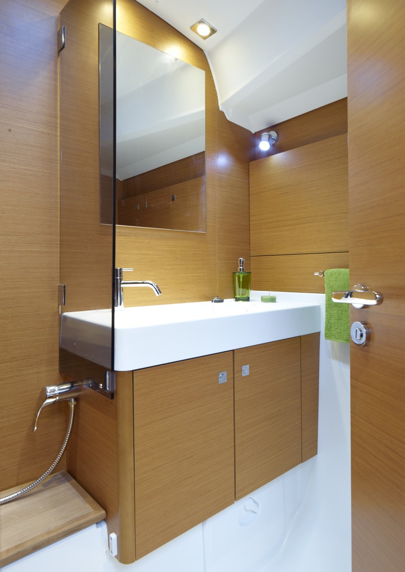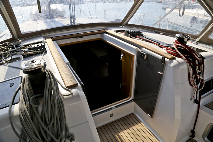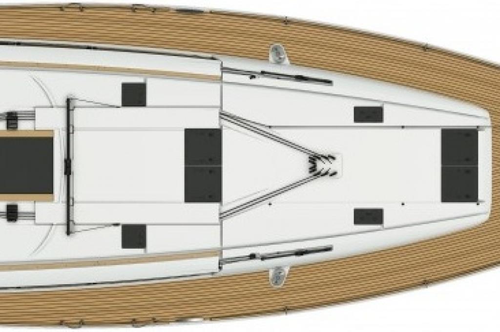 Outside Außendusche, Badeleiter, Biminitop, Cockpitlautsprecher, Cockpitpolster, Cockpittisch, elektr. Ankerwinsch, Gangway, Sprayhood, Teak im Cockpit