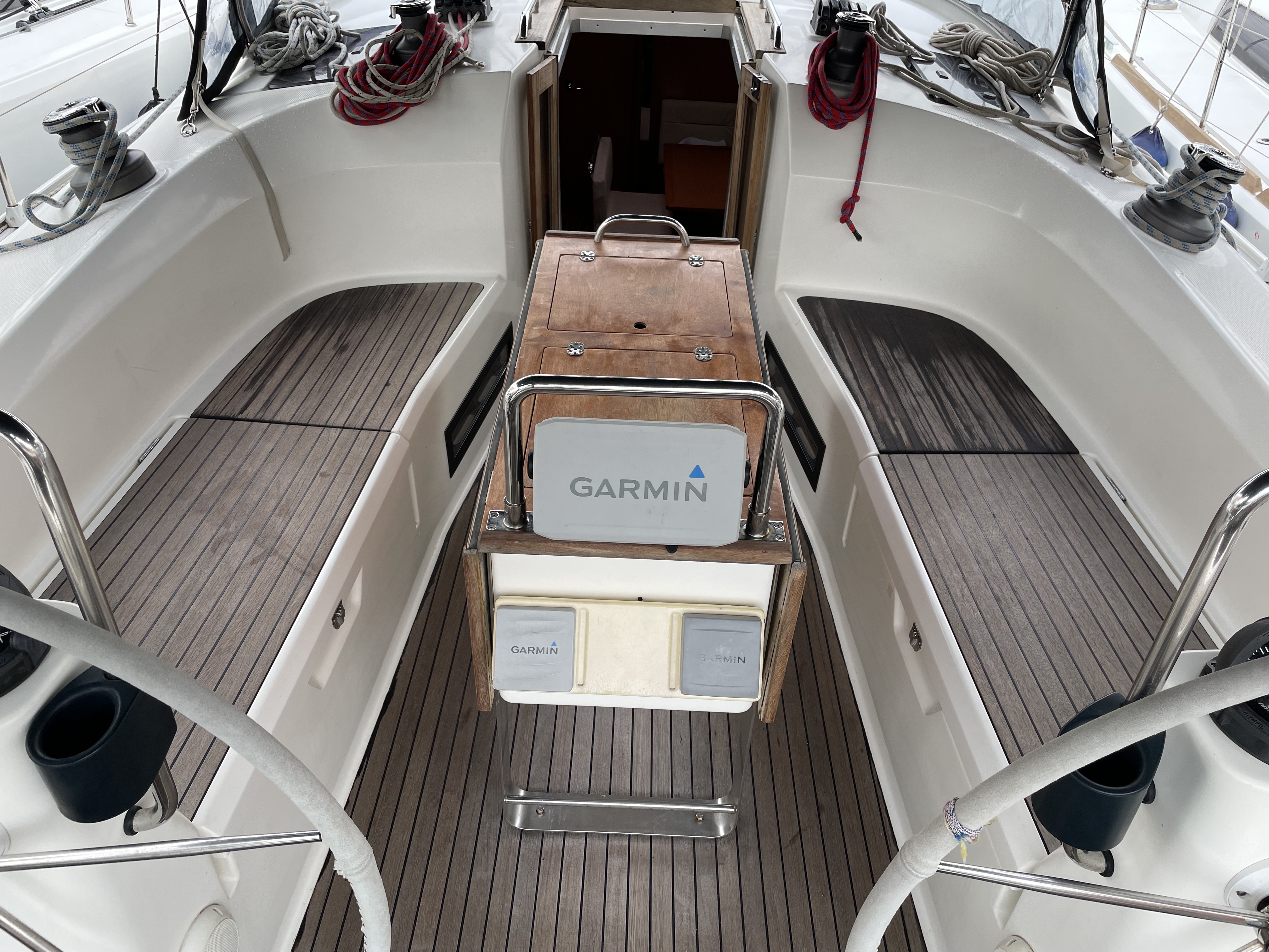 Outside Außendusche, Badeleiter, Biminitop, Cockpitlautsprecher, Cockpitpolster, Cockpittisch, elektr. Ankerwinsch, Gangway, Sprayhood, Teak im Cockpit